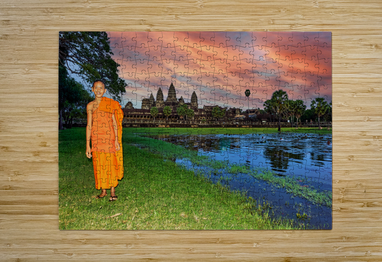 Monk stands by pond with Angkor Wat and sunset sky. Marco Brivio Puzzle printing