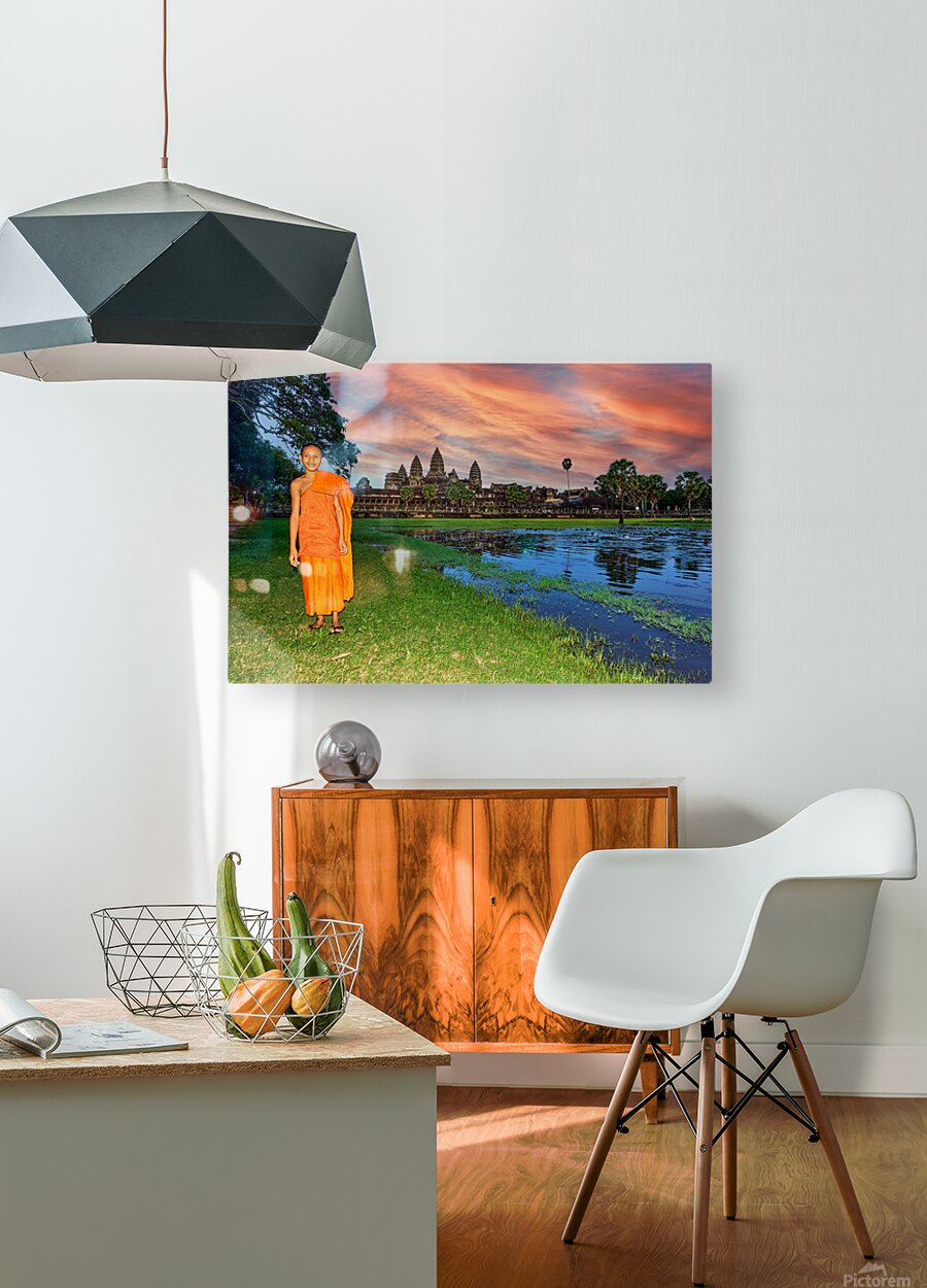 Get this artwork "Monk stands by pond with Angkor Wat and sunset sky." in a framed print.