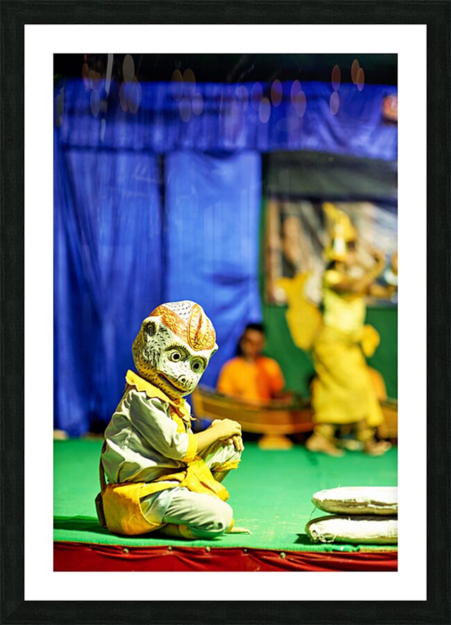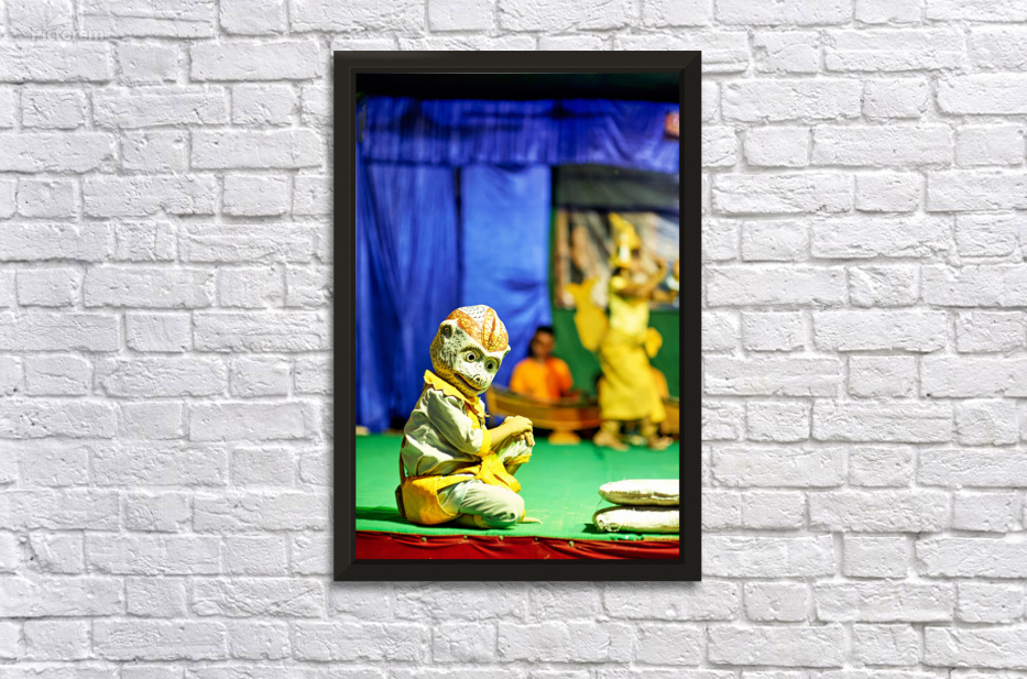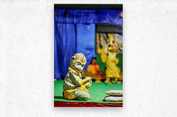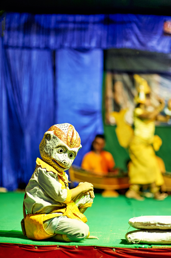 A performer in a Hanuman monkey mask and costume kneels on stage during a traditional dance performance likely from the Ramayana epic in Southeast Asi