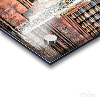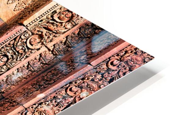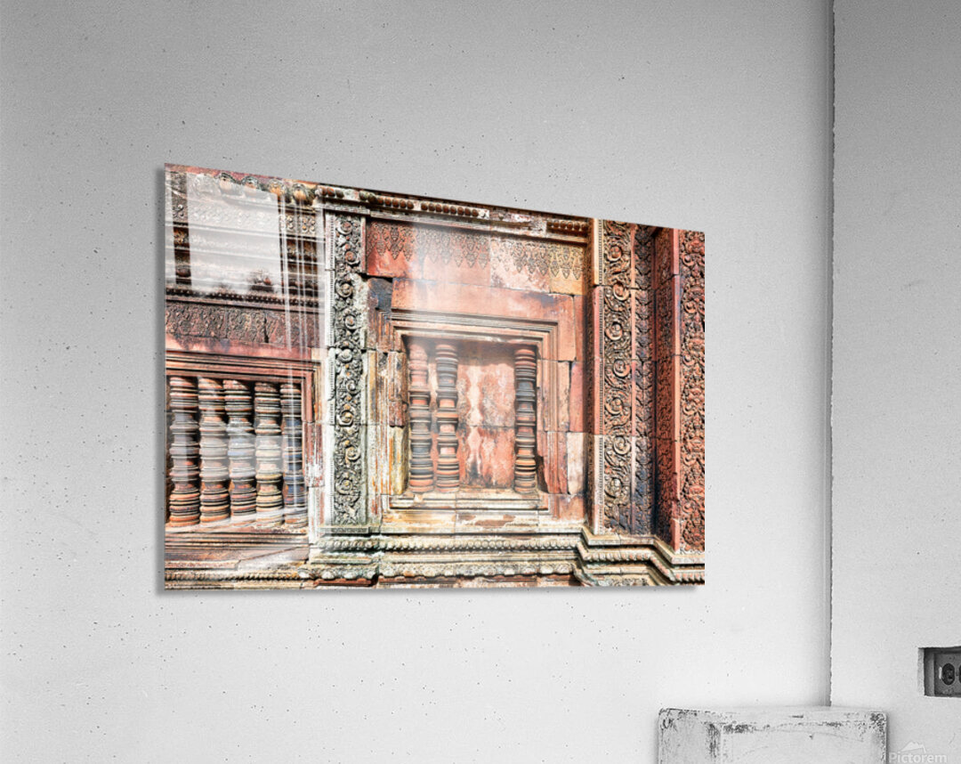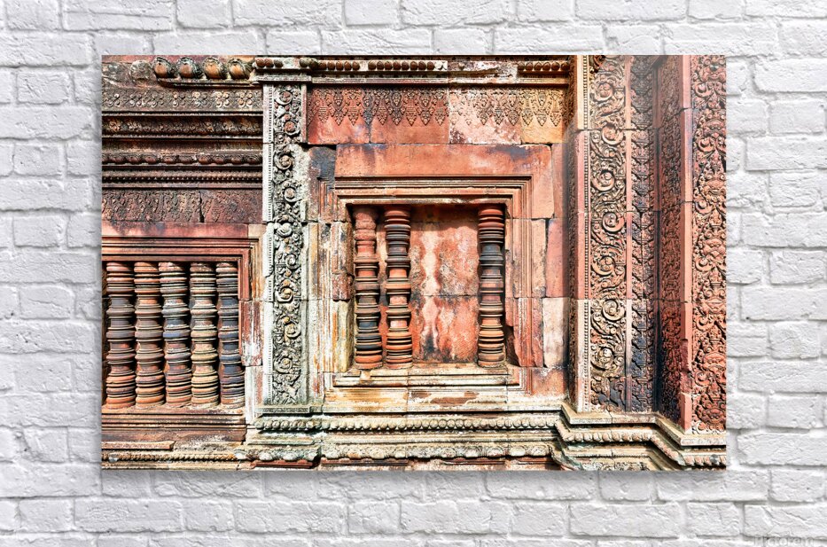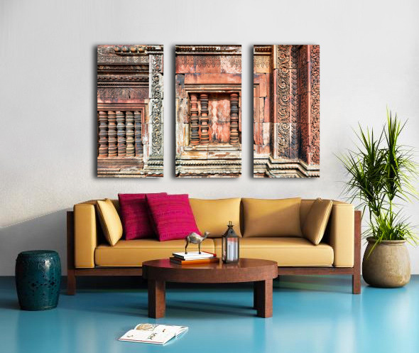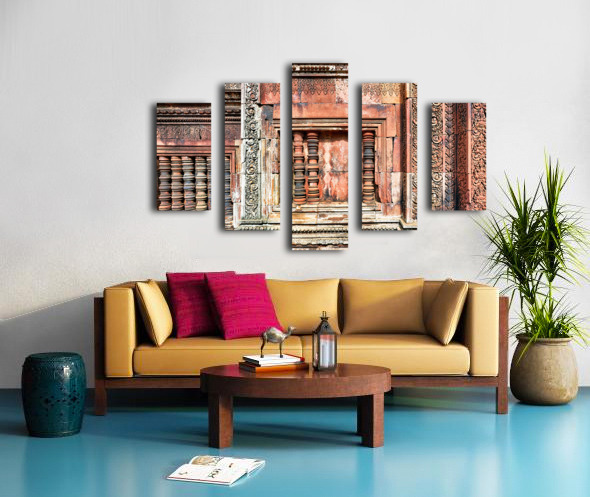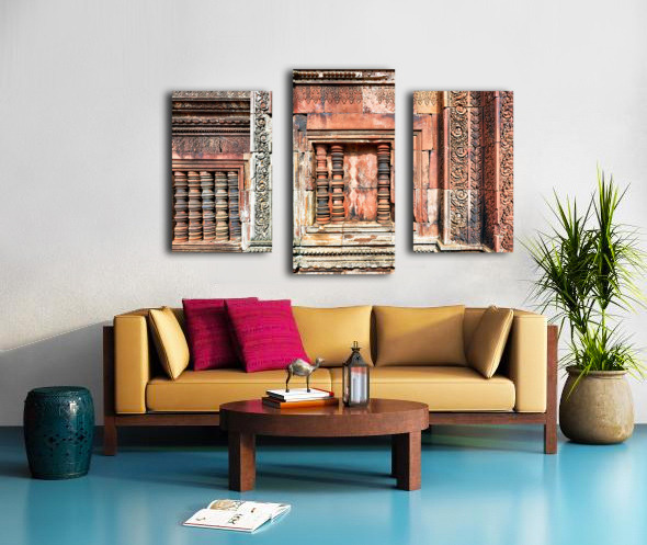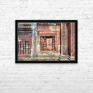 Get this artwork "Ancient temple wall with intricate reddish stone carvings and co" in a framed print.