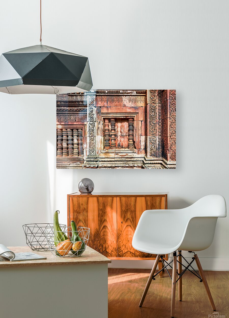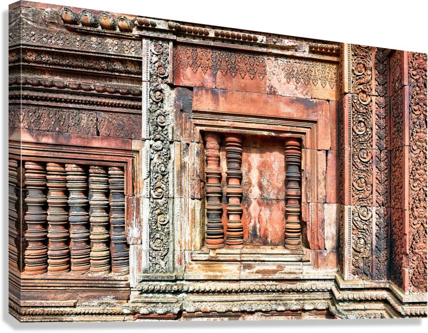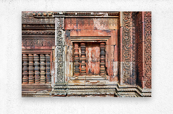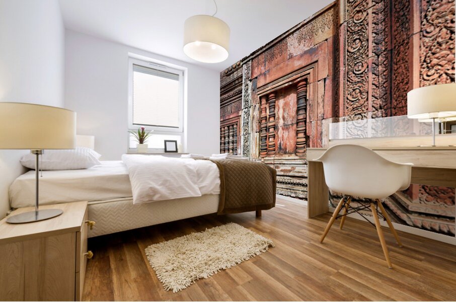 ABOUT THIS ARTWORK: ANCIENT TEMPLE WALL WITH INTRICATE REDDISH STONE CARVINGS AND CO