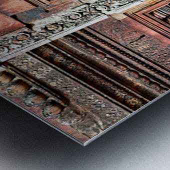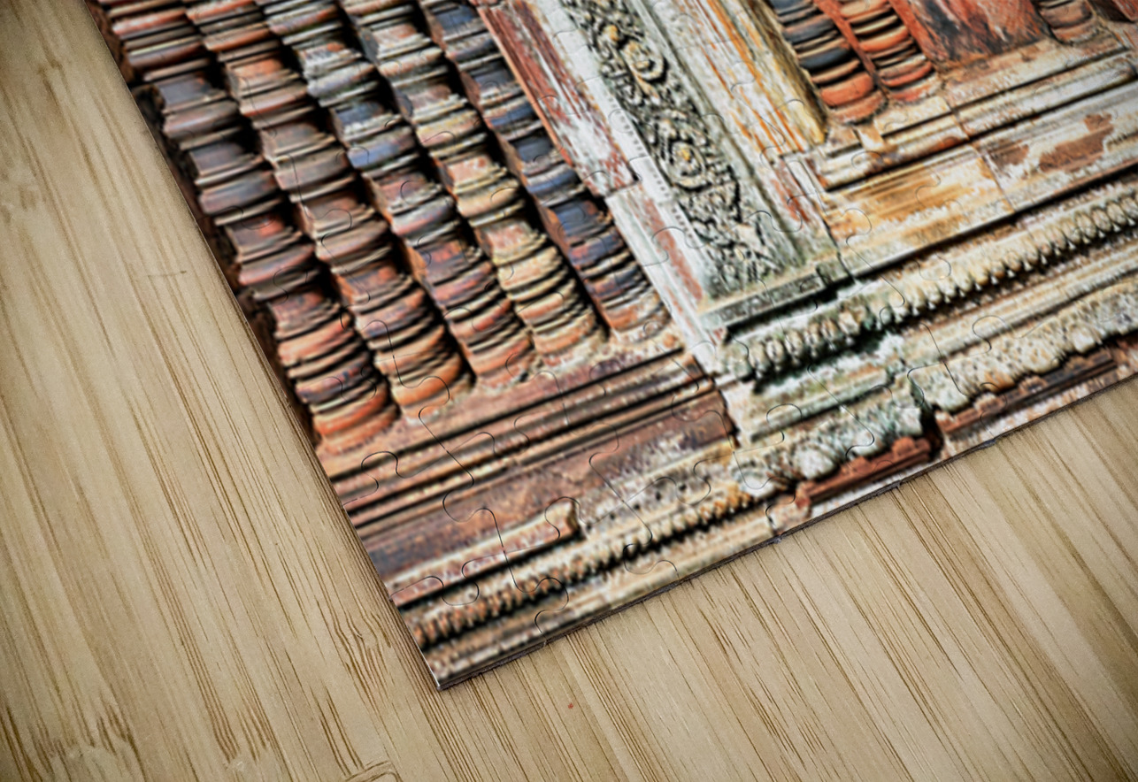 Ancient temple wall with intricate reddish stone carvings and co Marco Brivio Puzzle printing