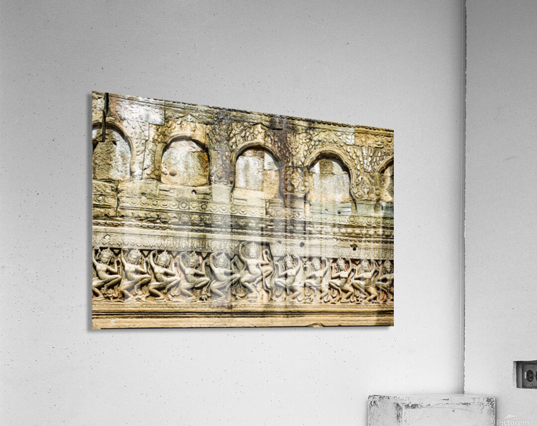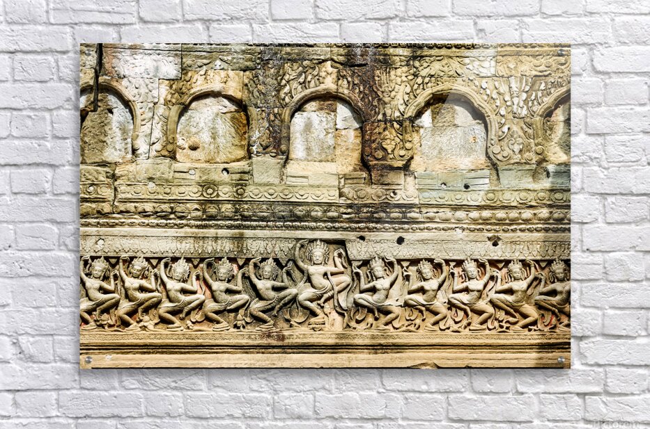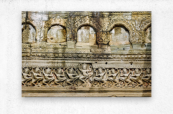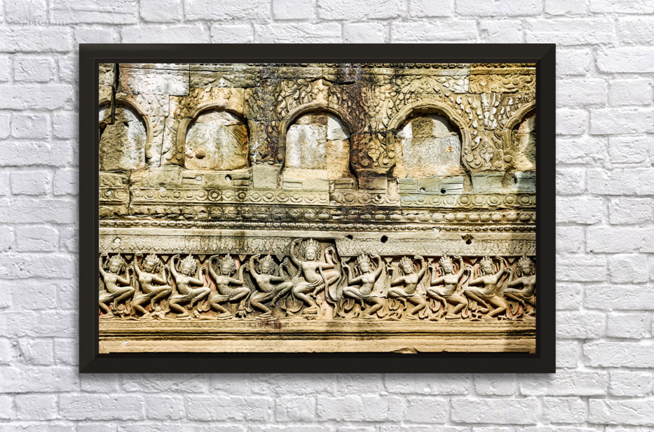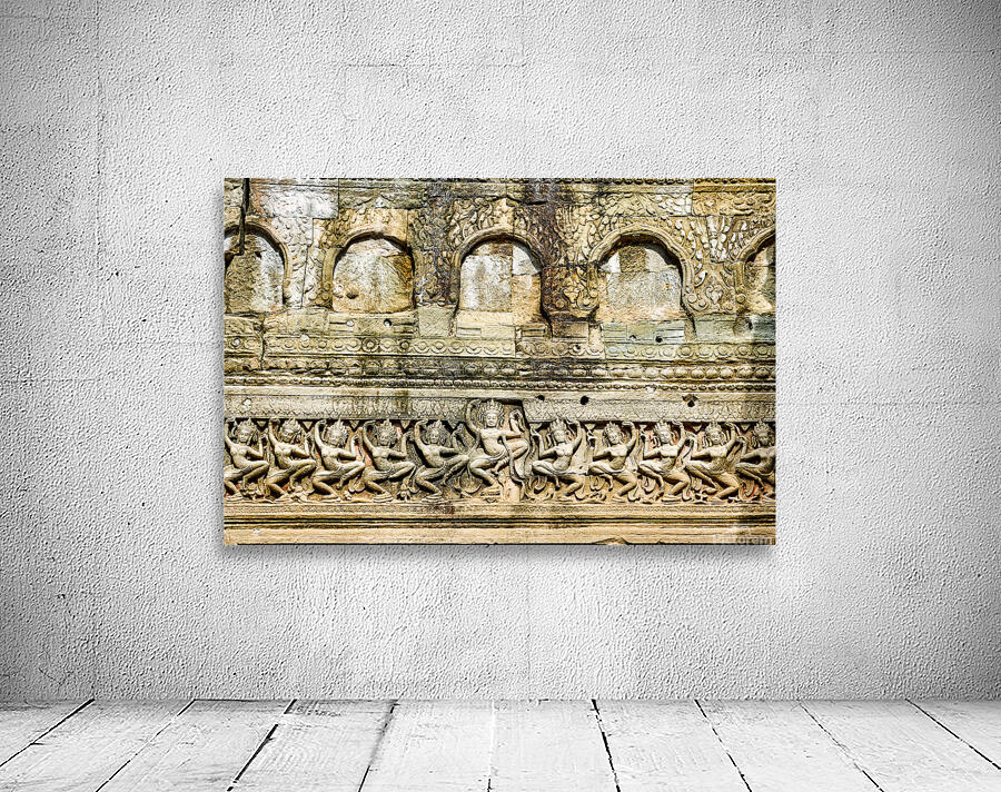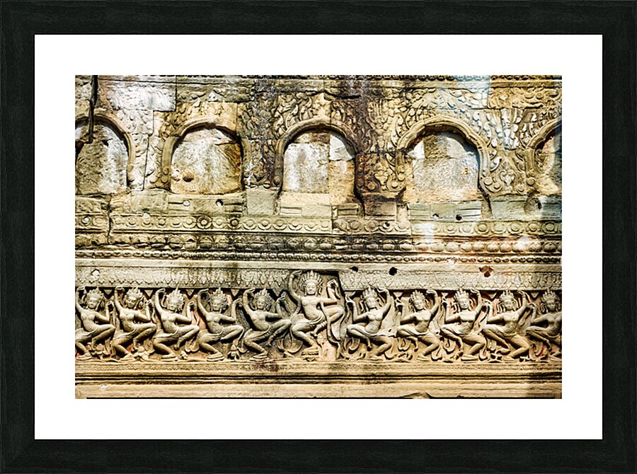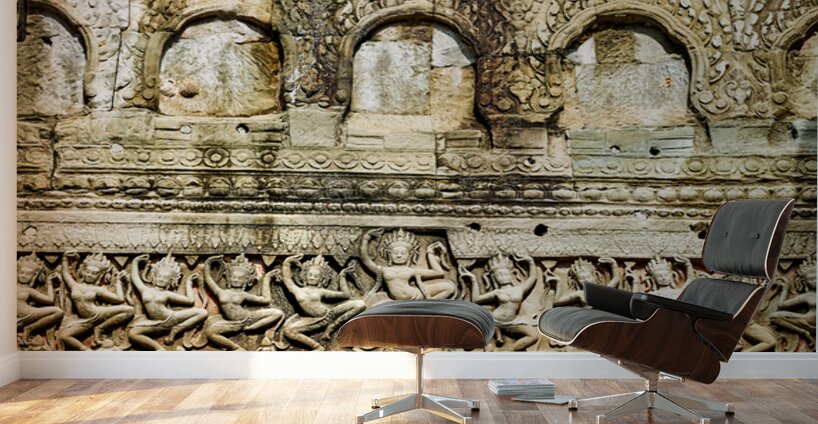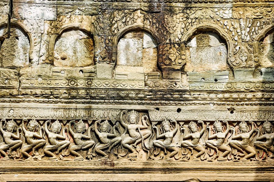 Ancient Apsara carvings adorn a temple wall in Angkor Cambodia depicting celestial dancers from Hindu mythology.