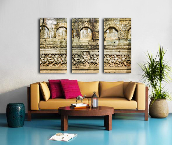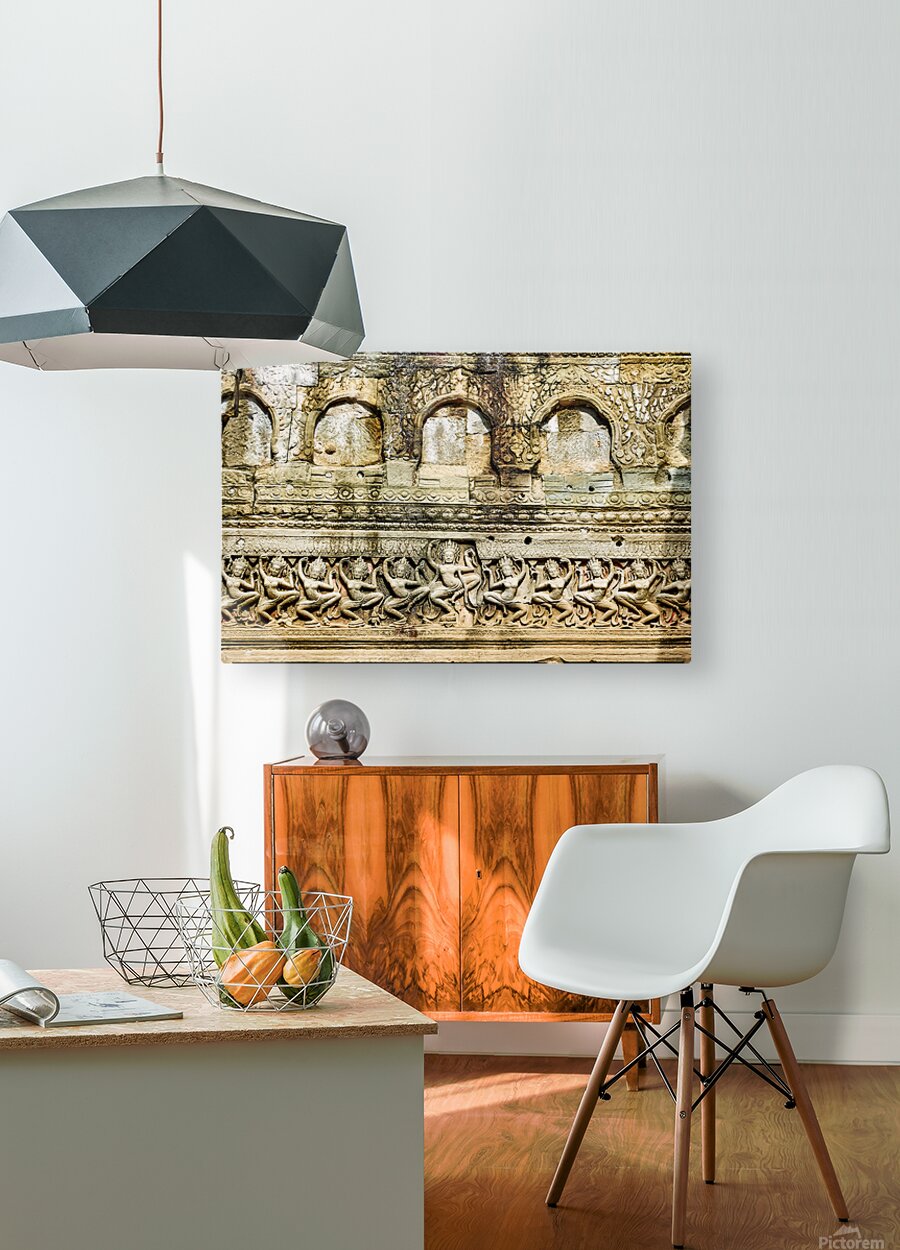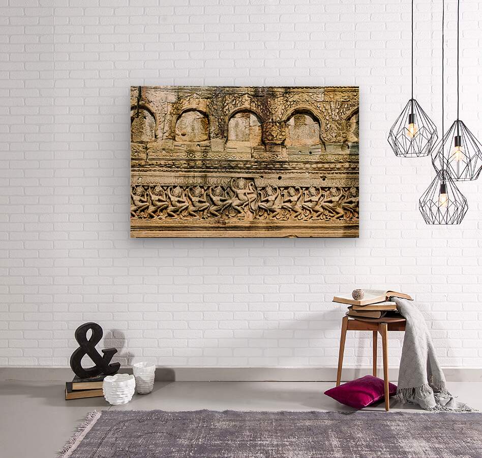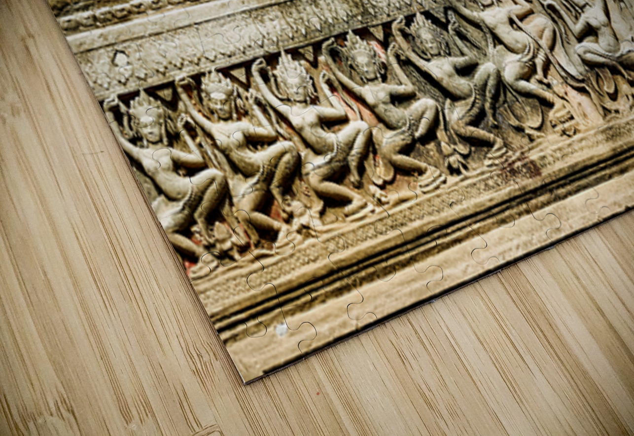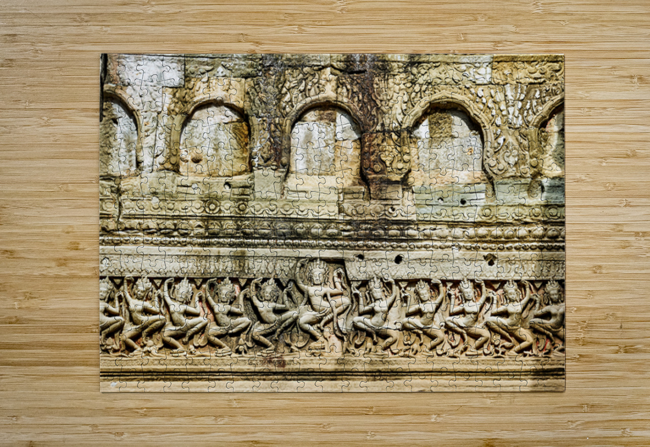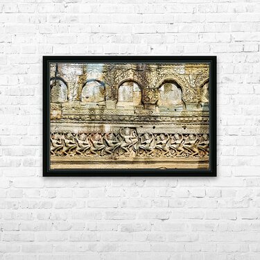 Ancient Apsara carvings adorn a temple wall in Angkor Cambodia depicting celestial dancers from Hindu mythology.