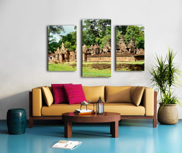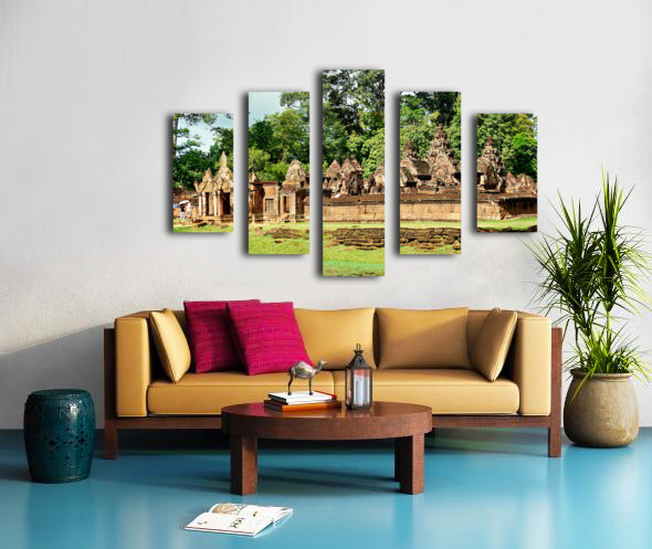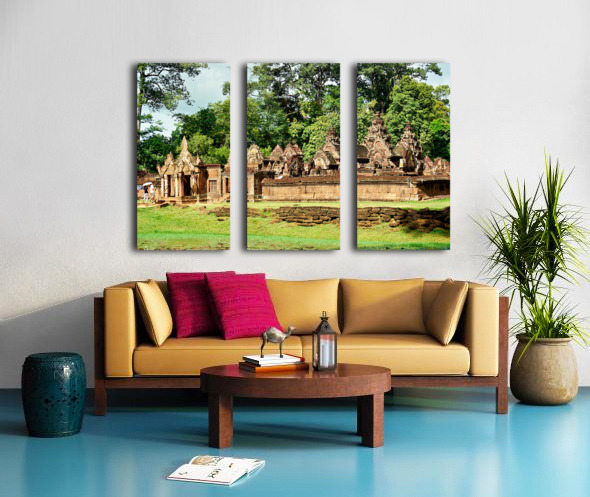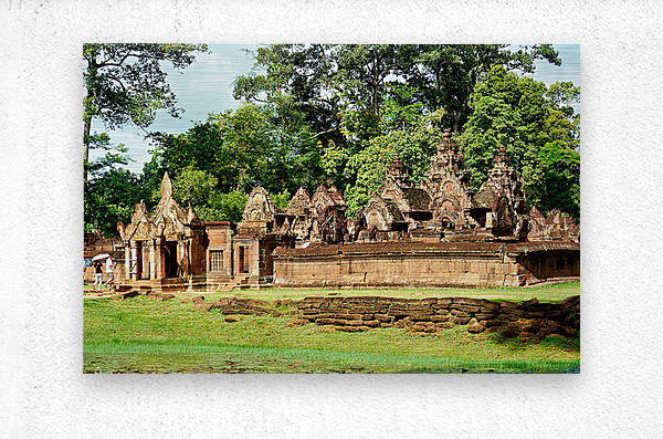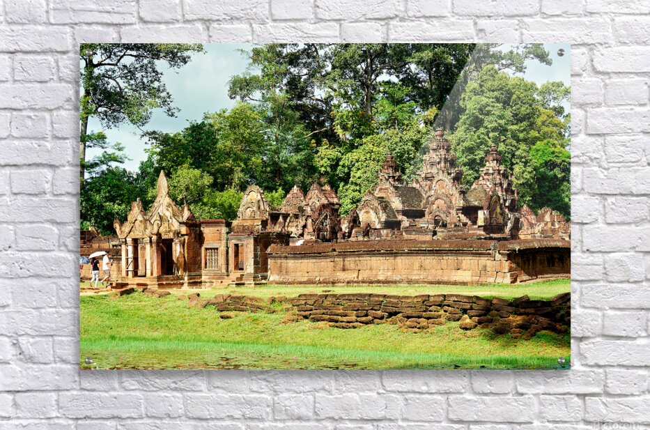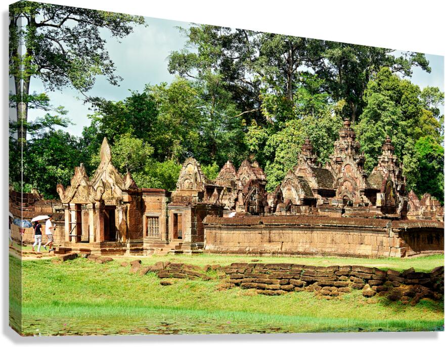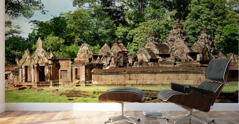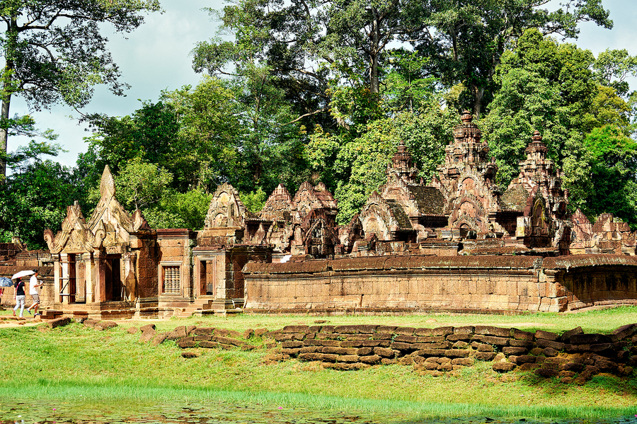 Tourists explore the ancient Banteay Srei temple in Angkor Cambodia admiring its intricate red sandstone architecture amidst lush greenery.