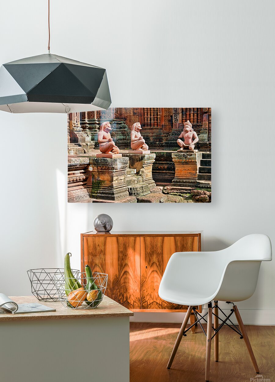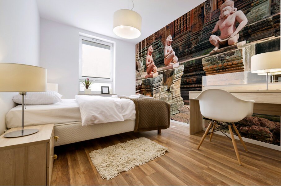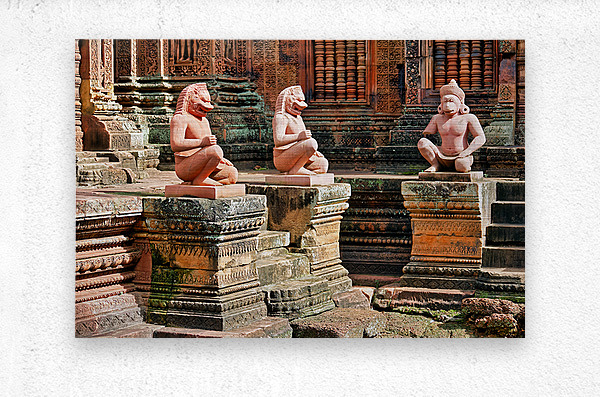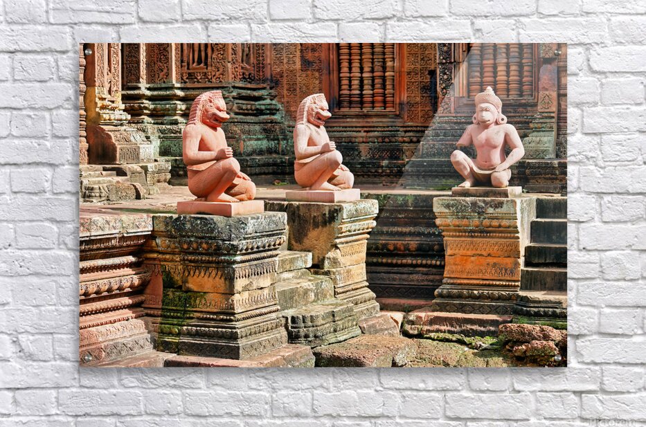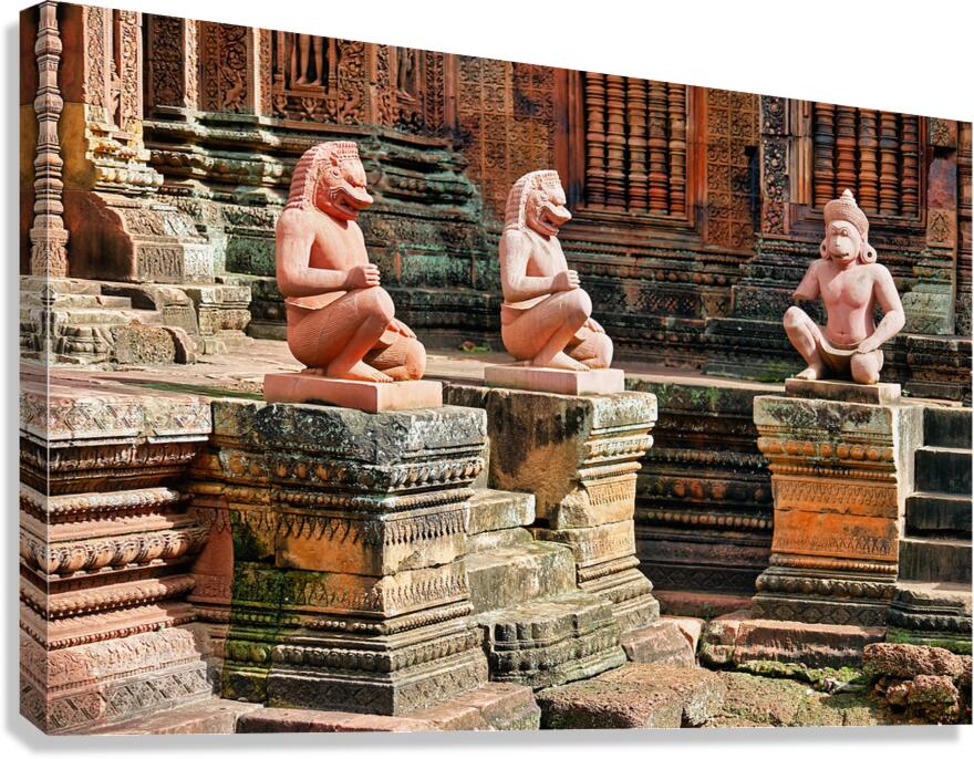 Guardian statues at Banteay Srei temple Siem Reap Cambodia. Mythical figures protect the ancient Khmer Hindu temple known for its intricate carvings.