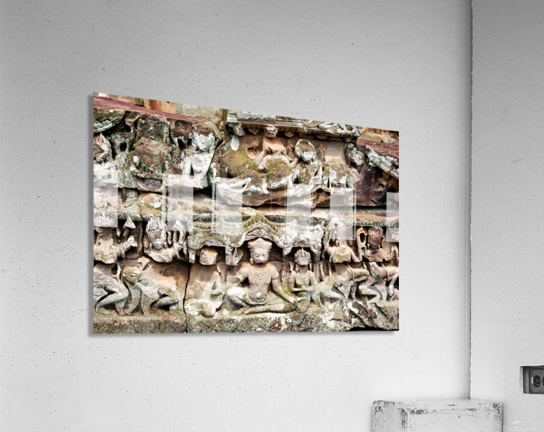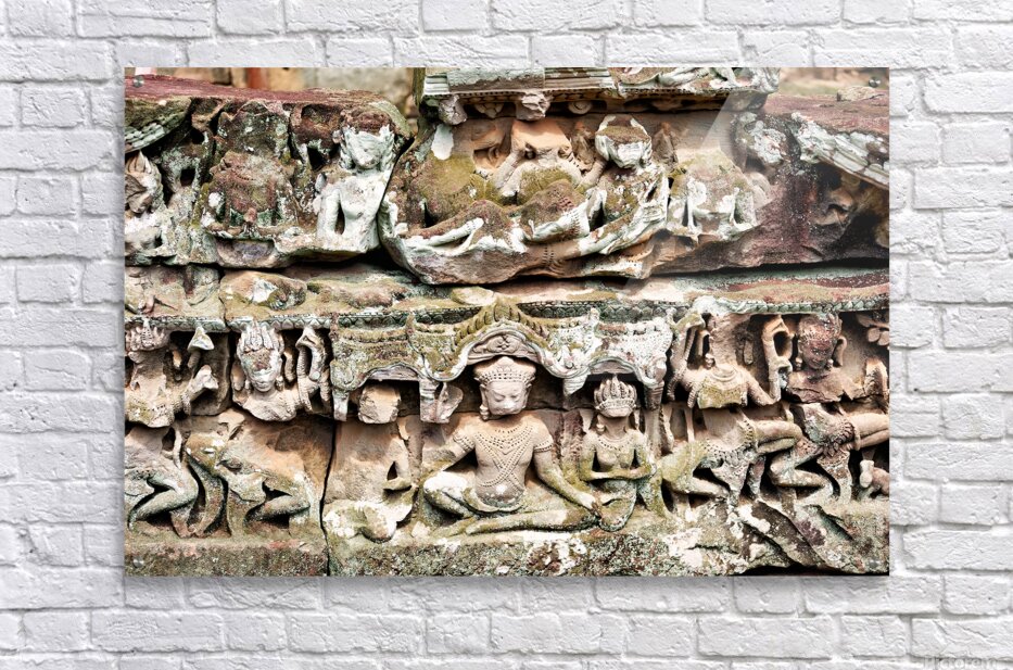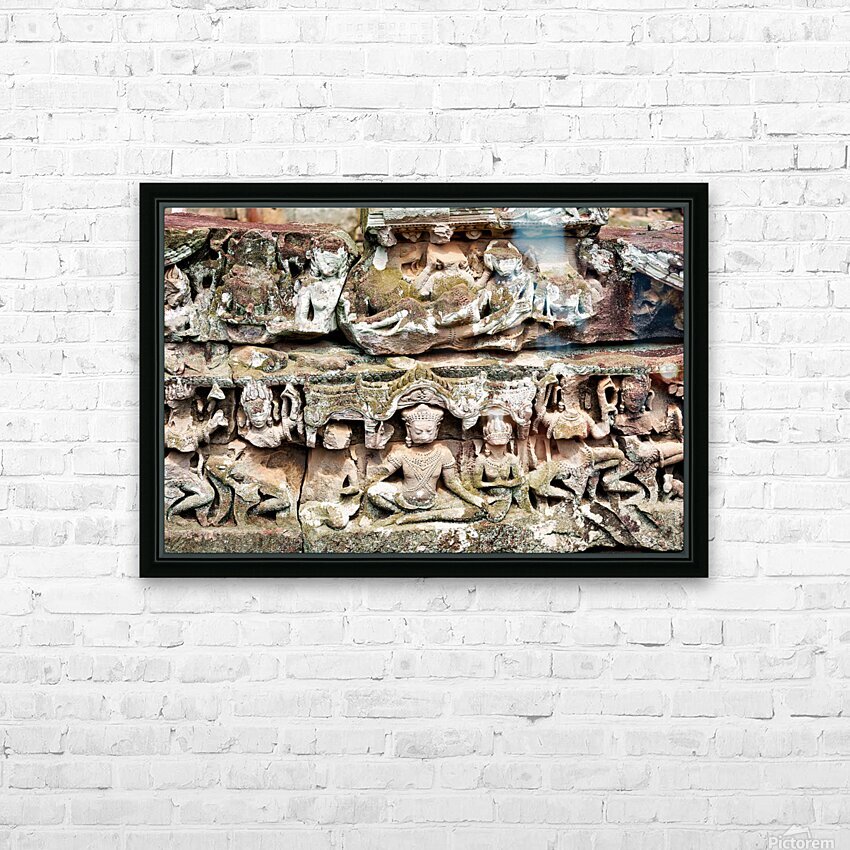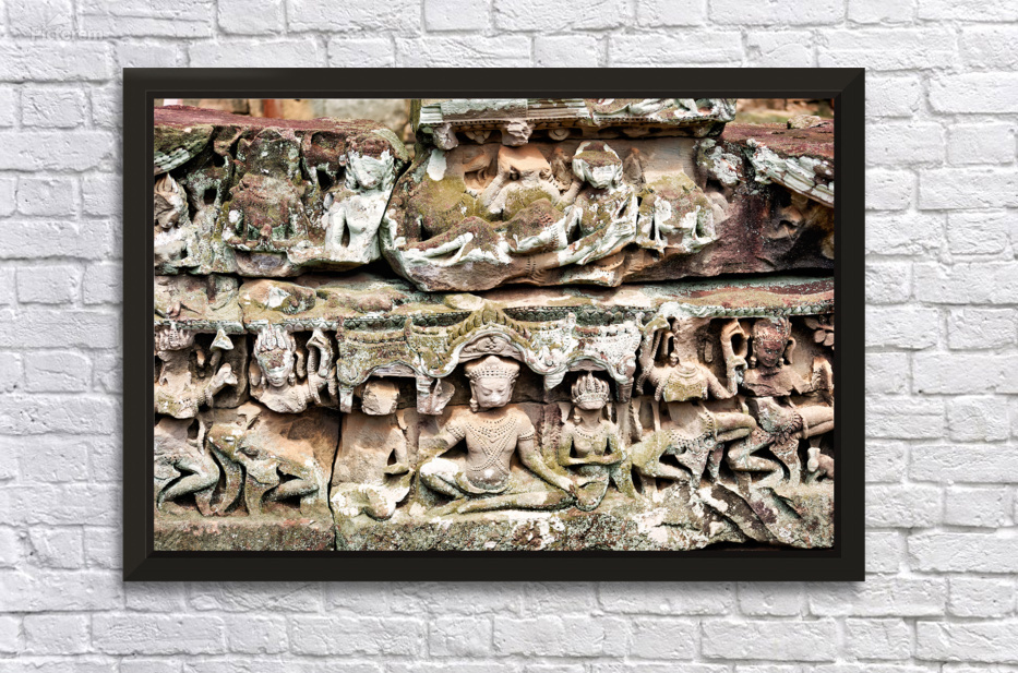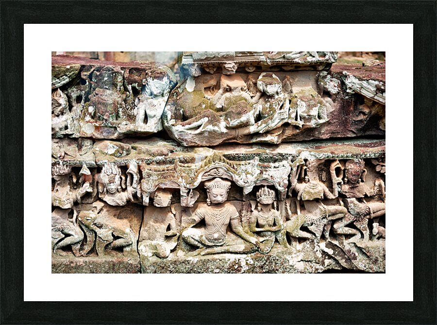 "Intricate ancient stone carvings on a moss covered temple." in a framed print.