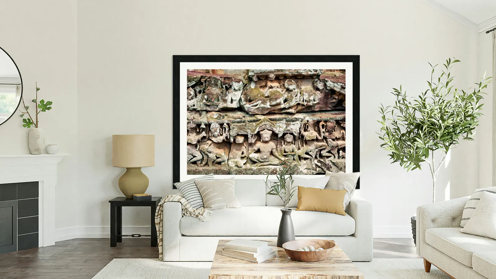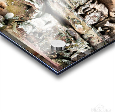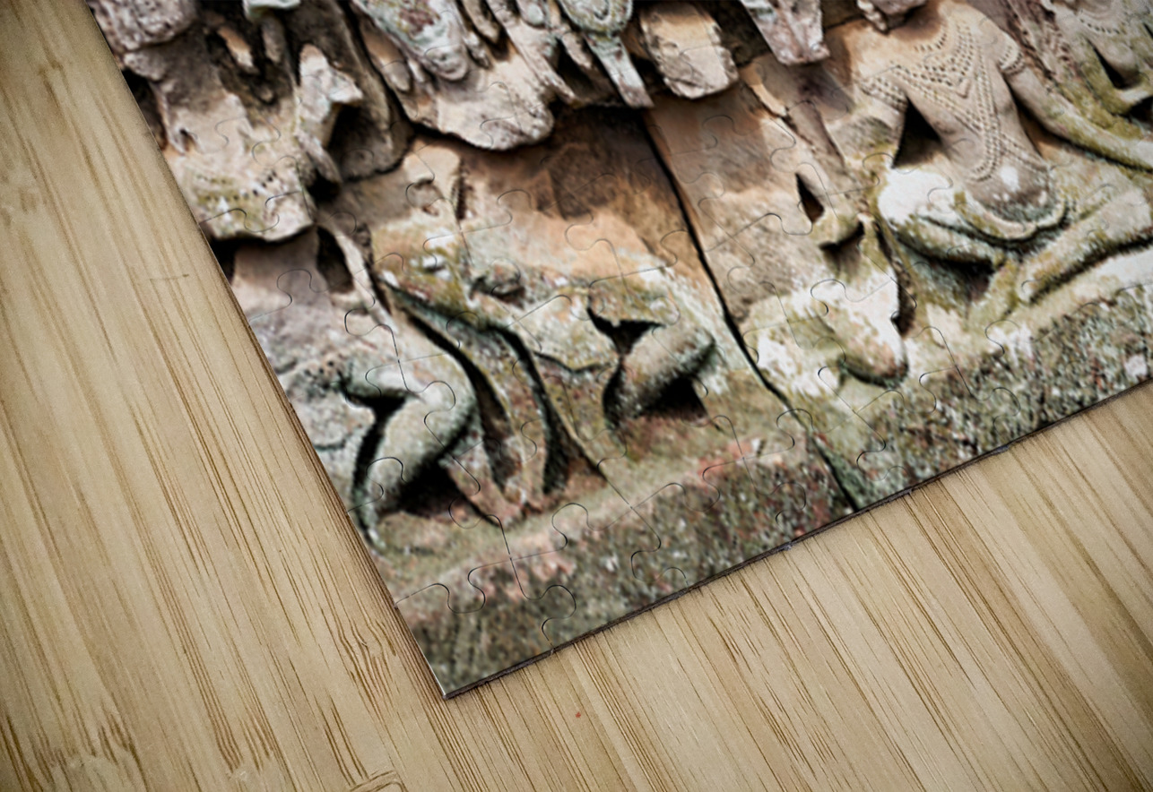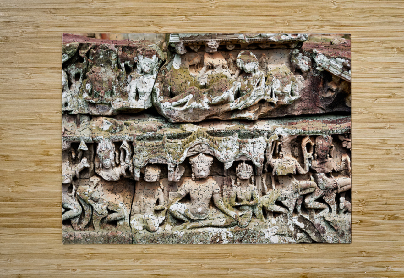 "Intricate ancient stone carvings on a moss covered temple." in a framed print.