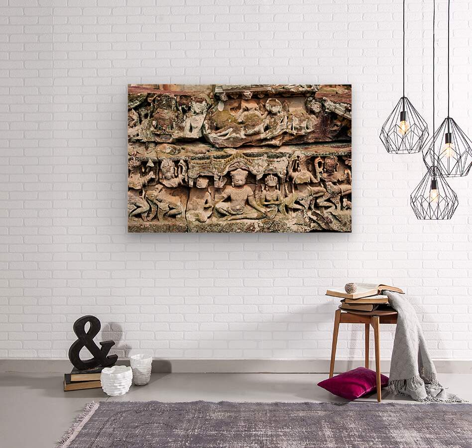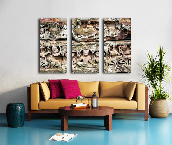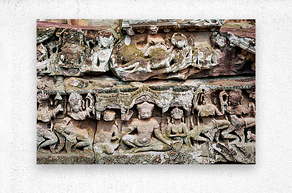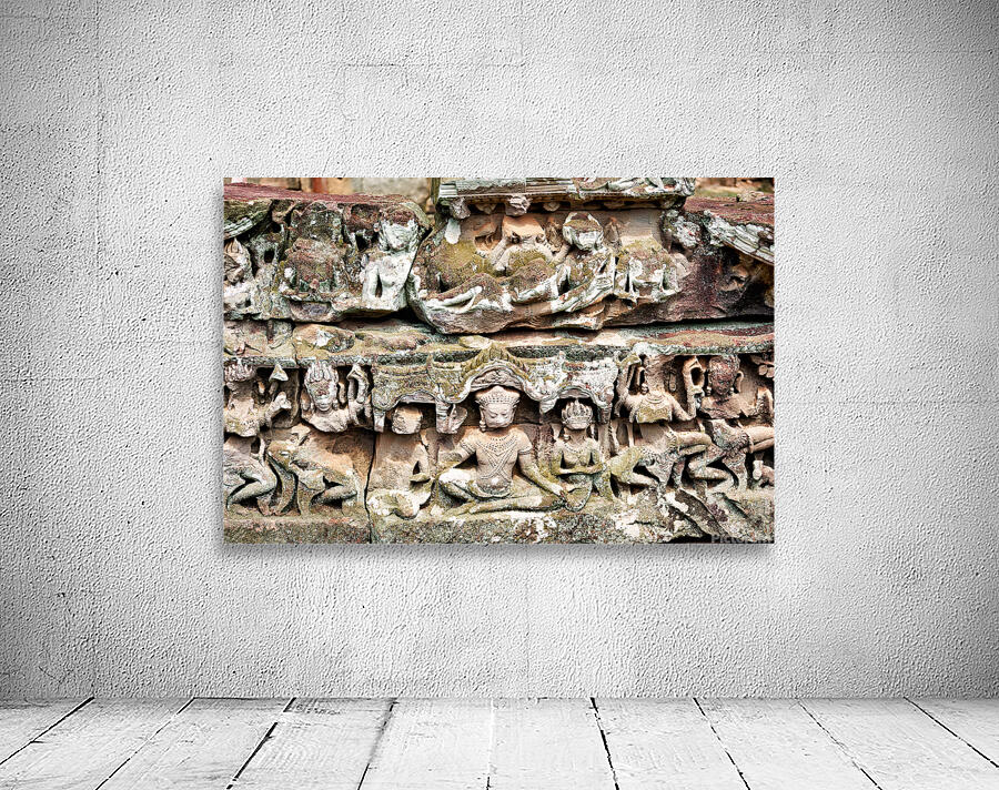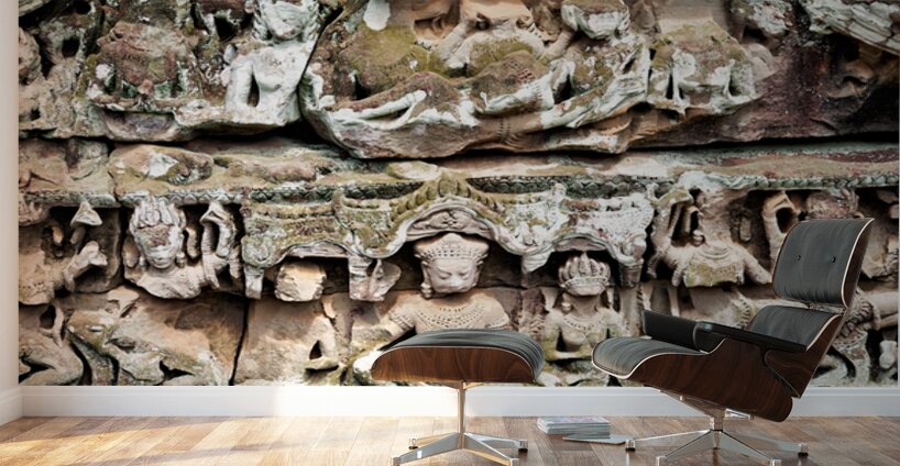 Ancient stone carvings of deities and mythical figures adorn a temple wall in Angkor Cambodia showcasing intricate Khmer artistry and religious narrat