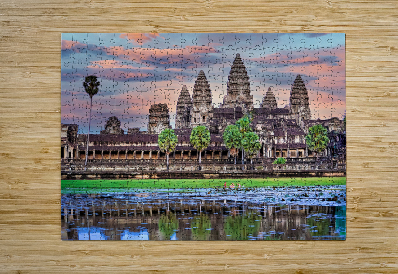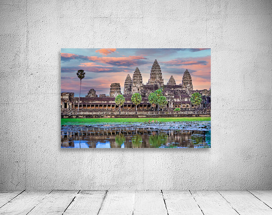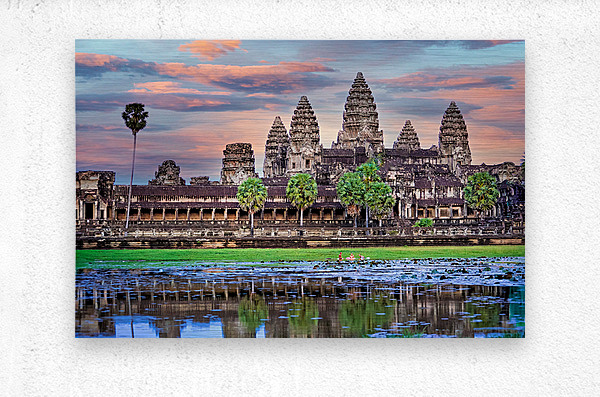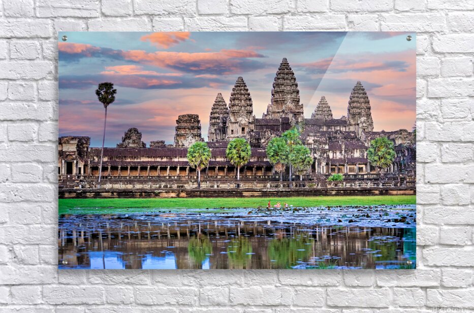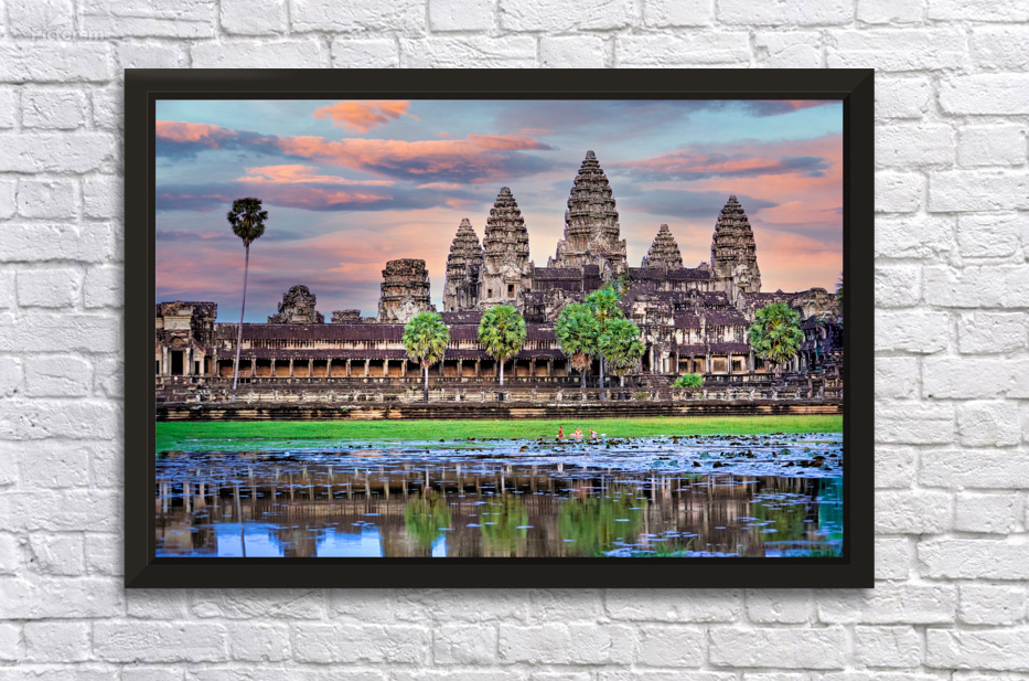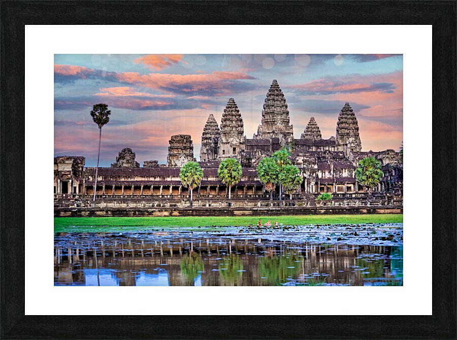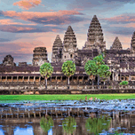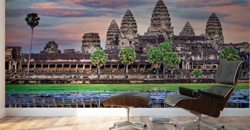 Angkor Wat Cambodia at dawn. Its majestic towers reflect in the lotus pond where locals bathe capturing the spiritual essence of this ancient site.