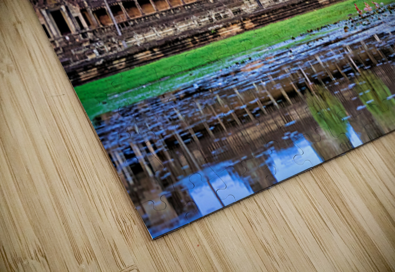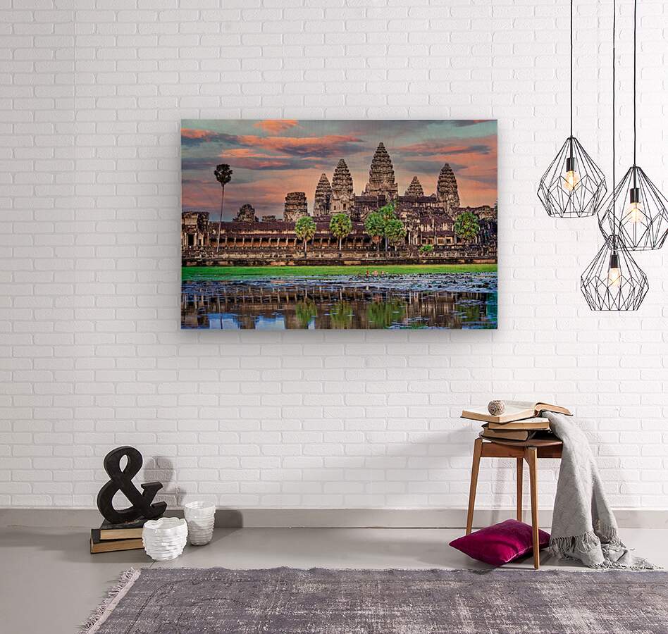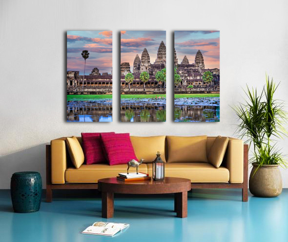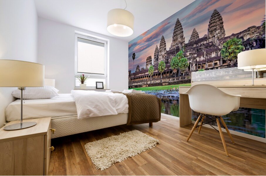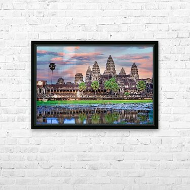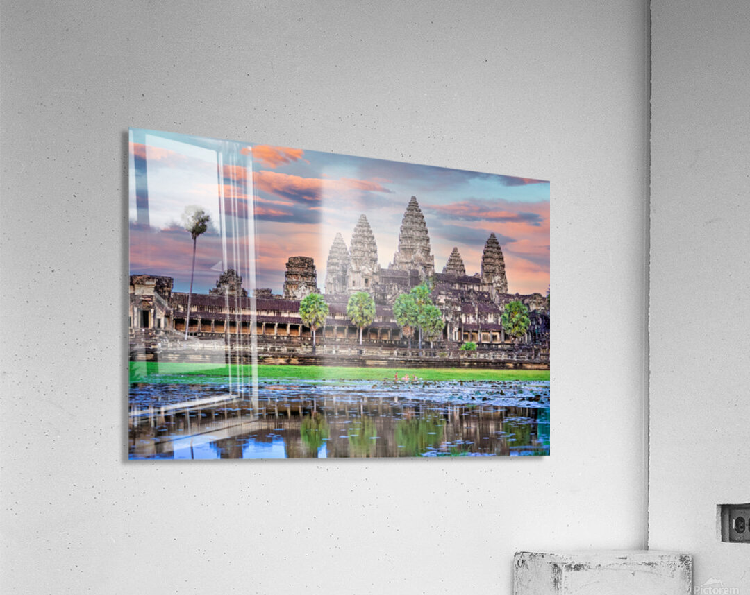Angkor Wat Cambodia at dawn. Its majestic towers reflect in the lotus pond where locals bathe capturing the spiritual essence of this ancient site.