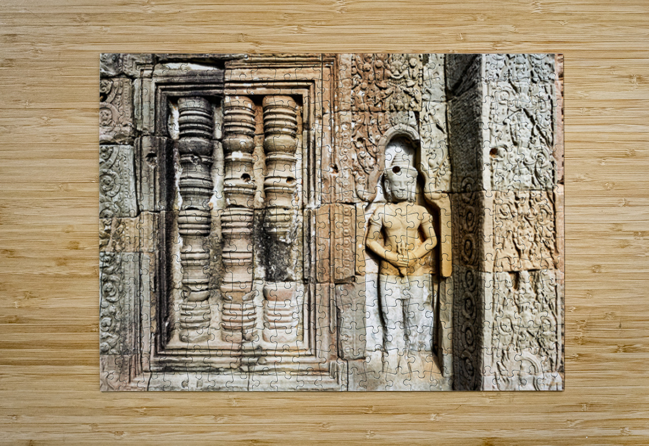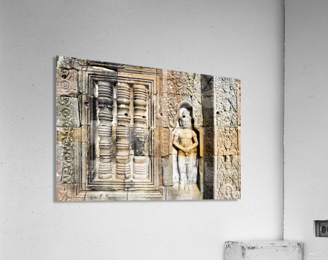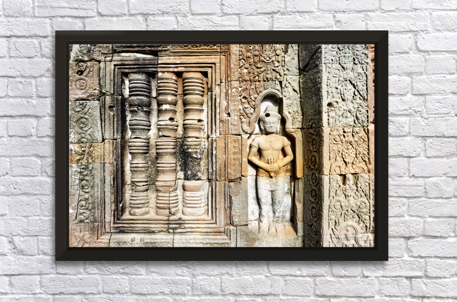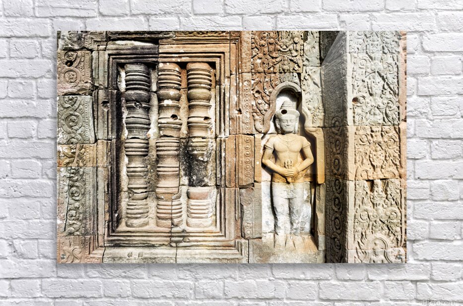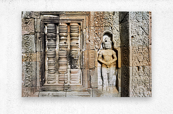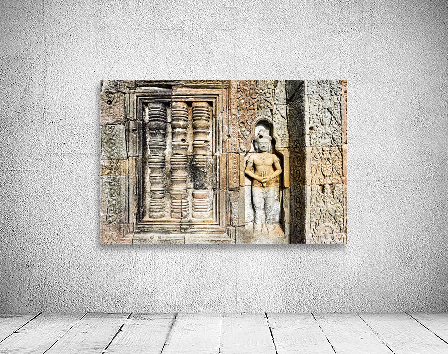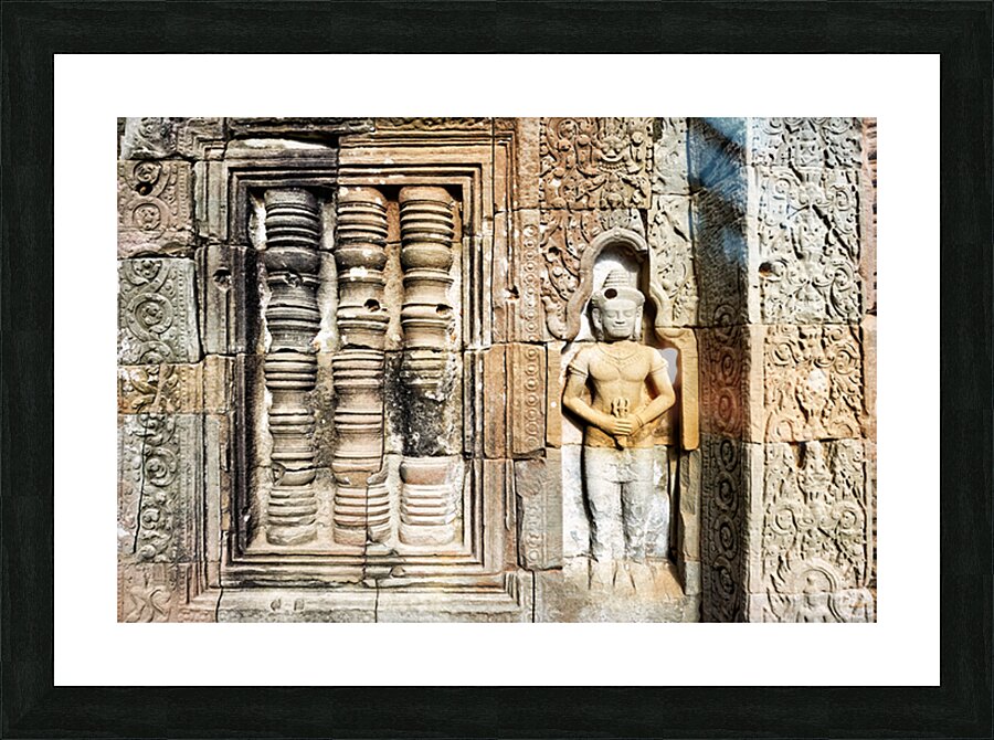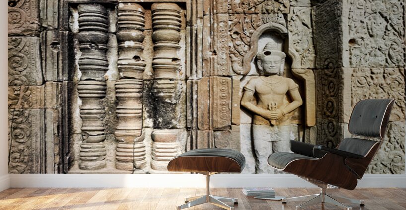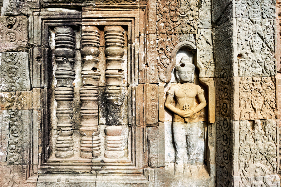 Ancient stone carvings at a temple in Cambodia featuring a headless deity figure and decorative columns showcasing Khmer architectural artistry.