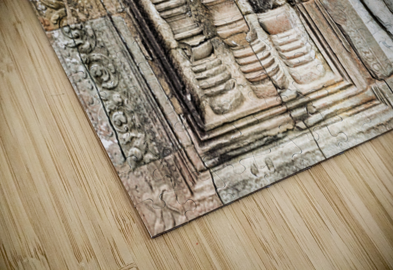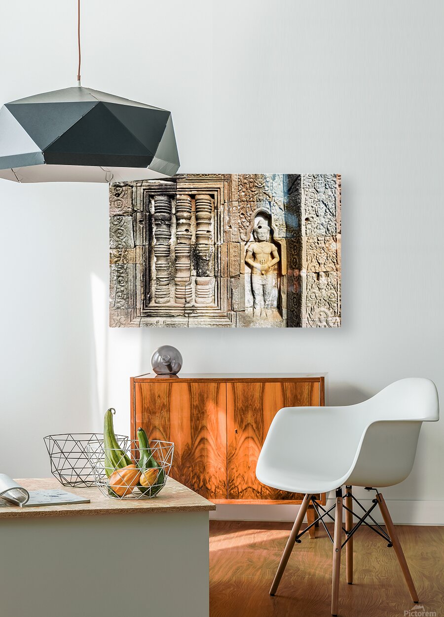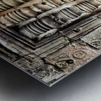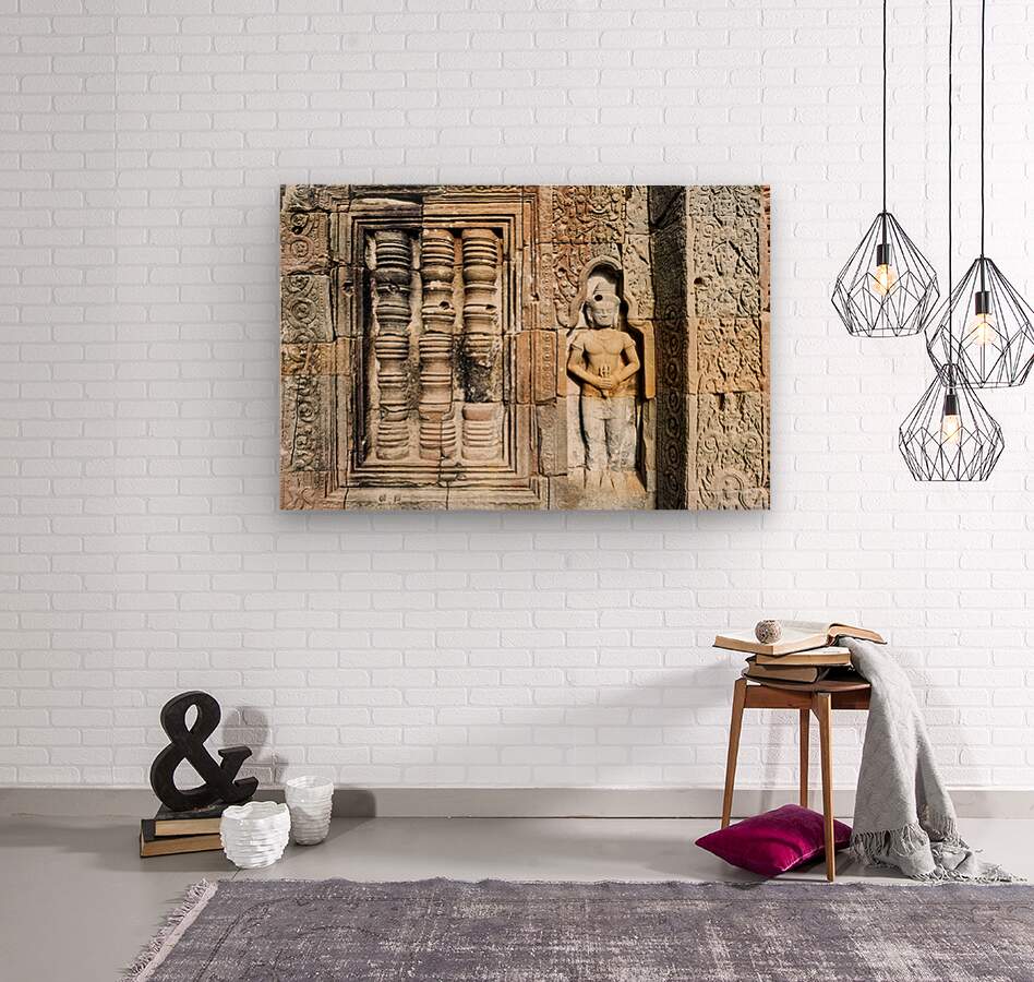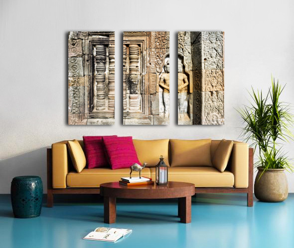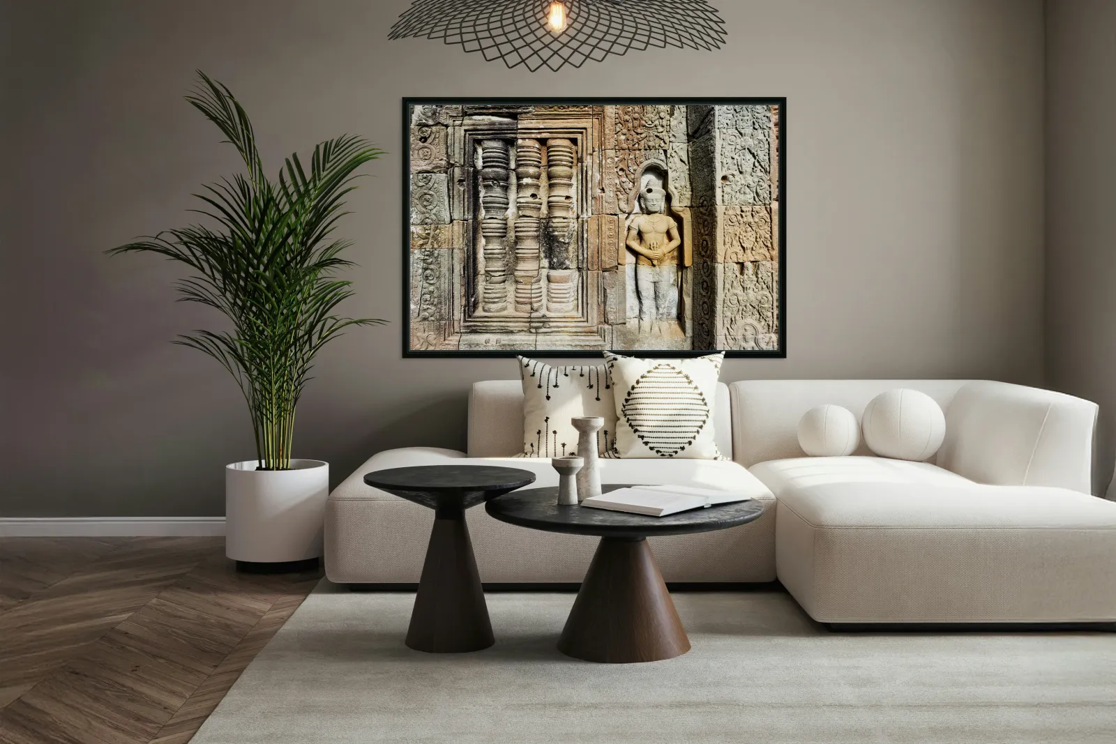 Ancient stone carvings at a temple in Cambodia featuring a headless deity figure and decorative columns showcasing Khmer architectural artistry.