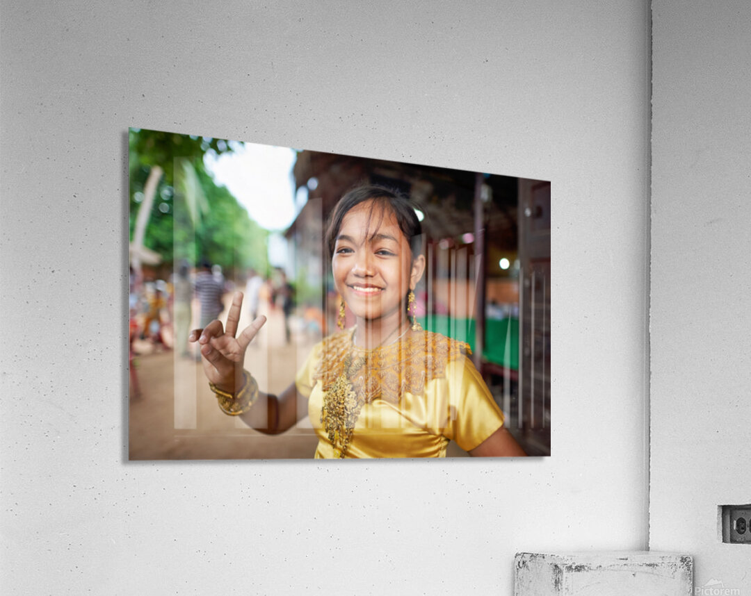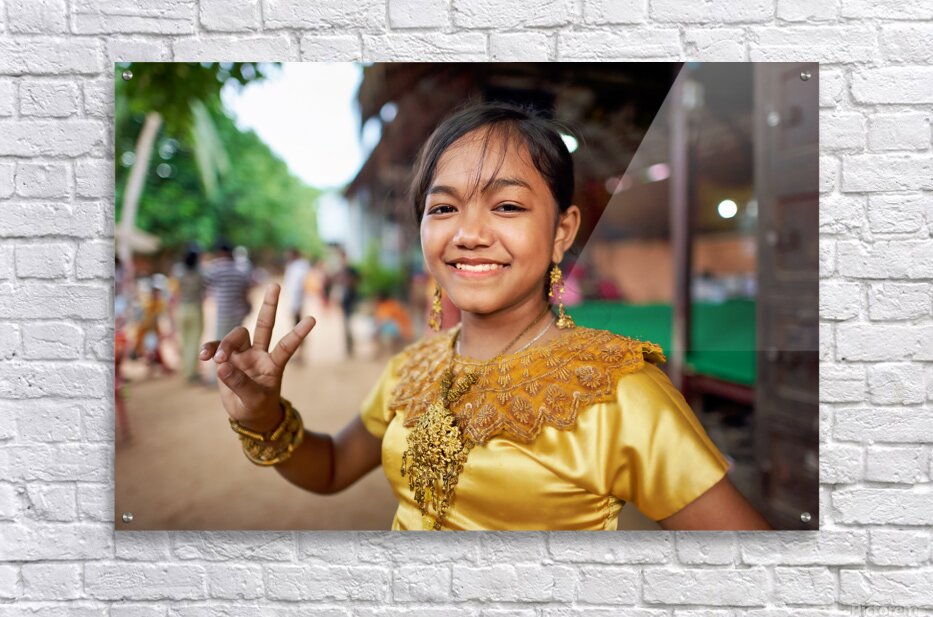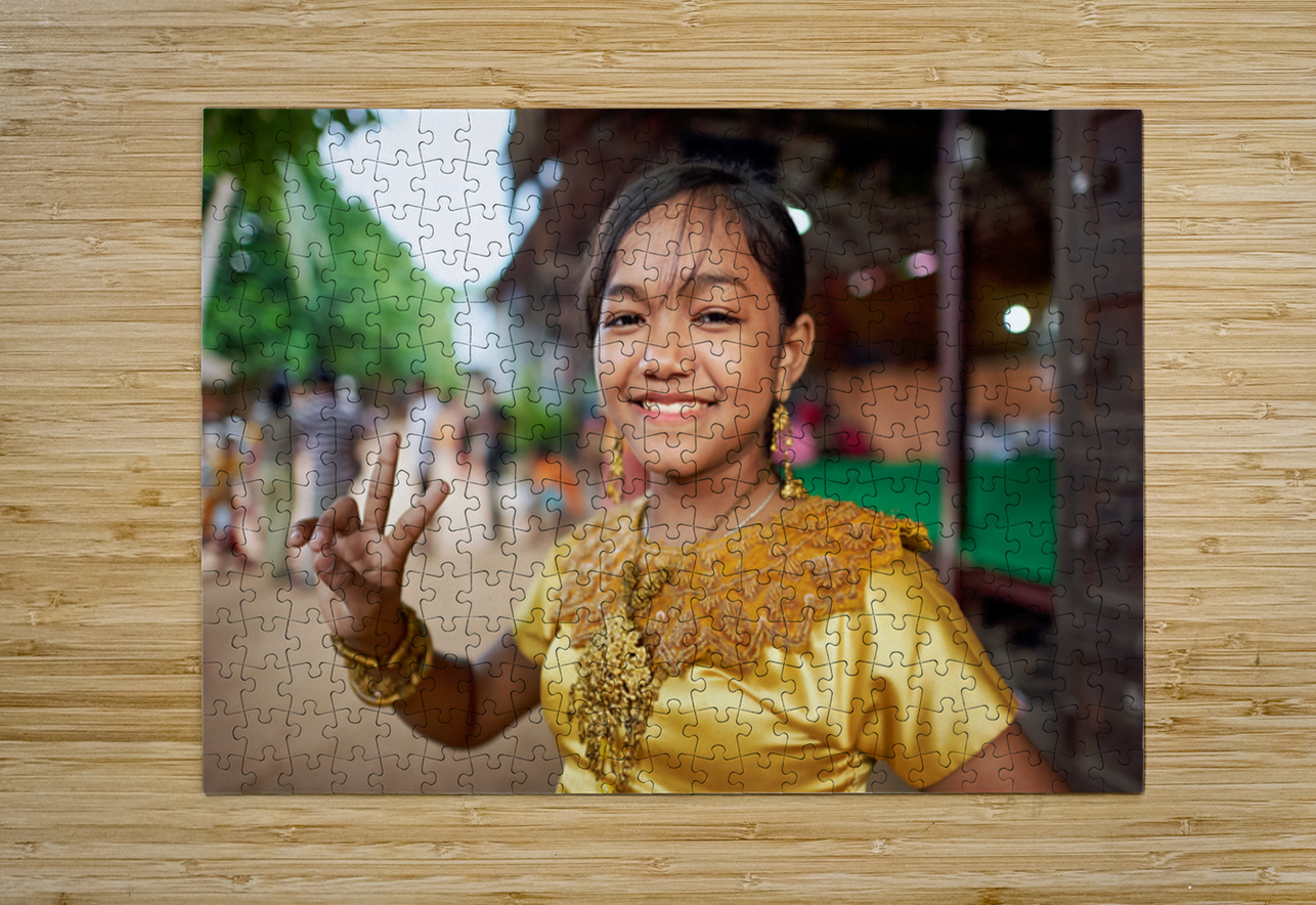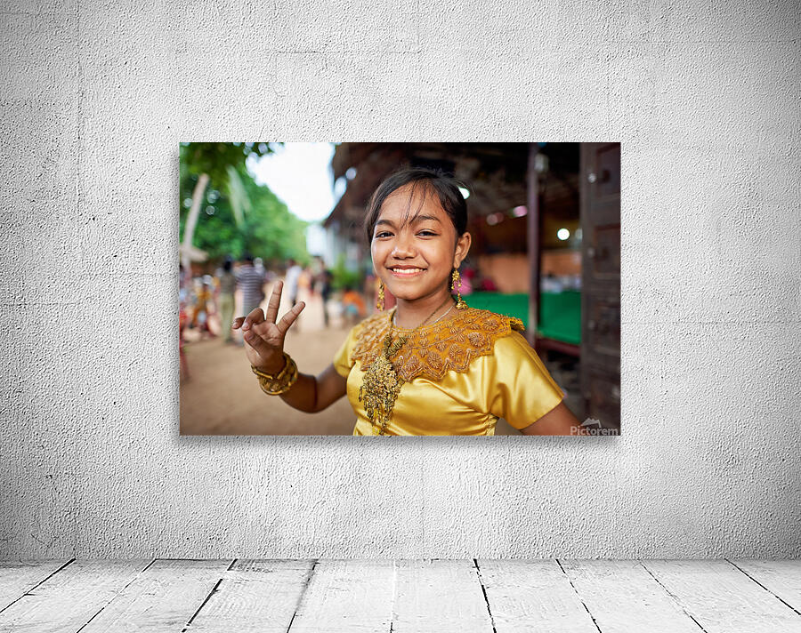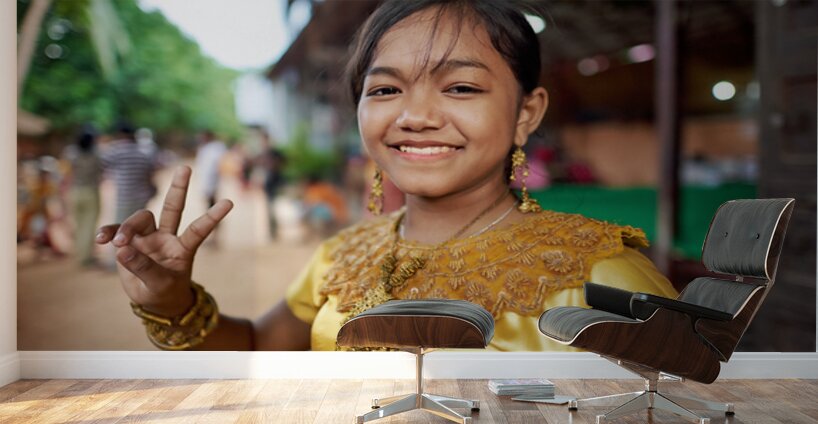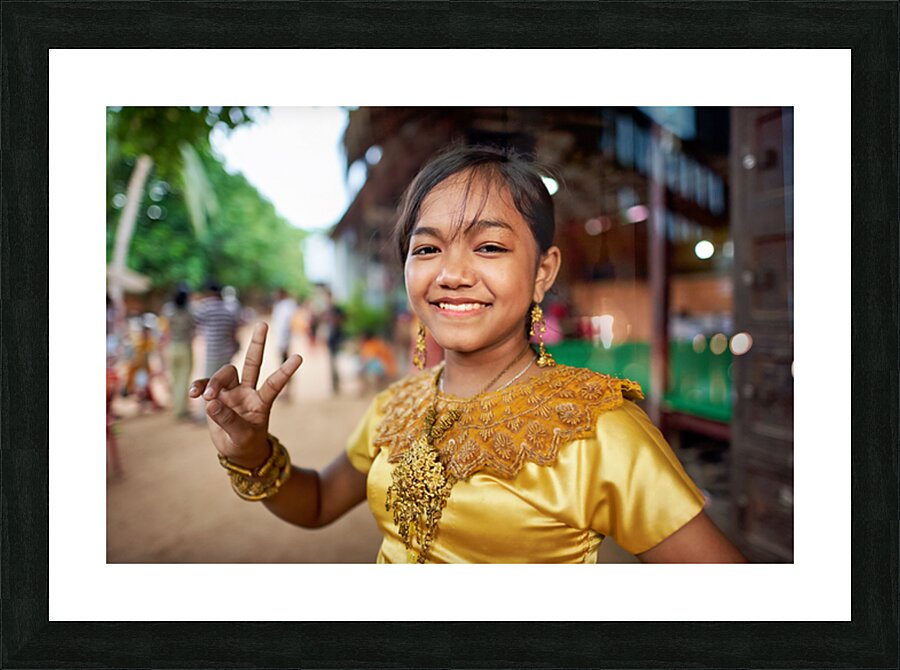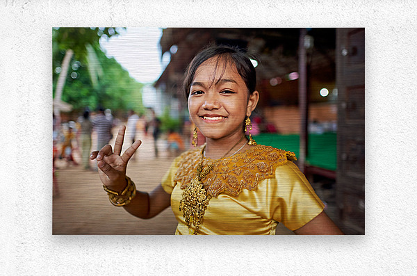 A smiling young girl in traditional golden attire makes a peace sign showcasing cultural beauty and warmth in a vibrant outdoor setting.