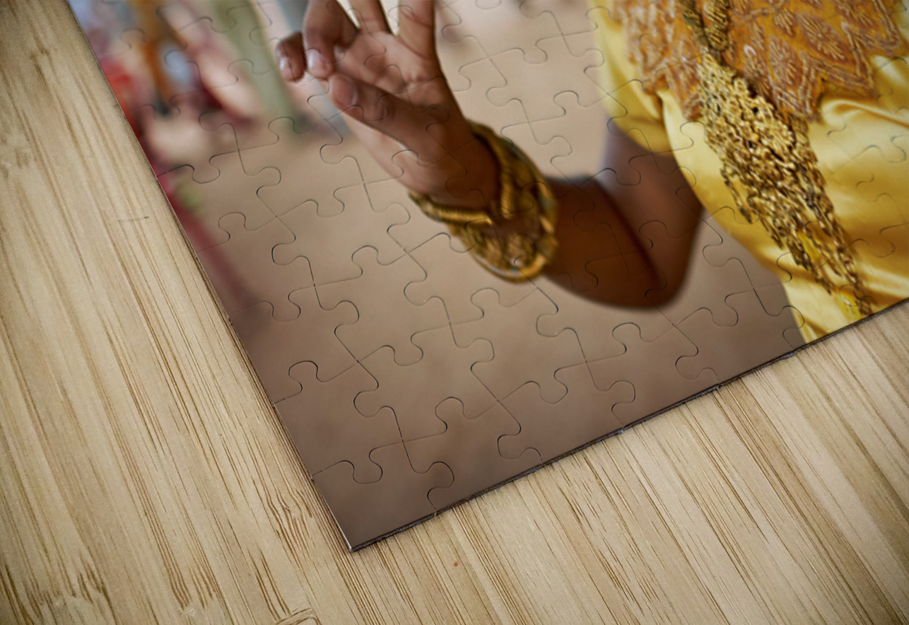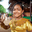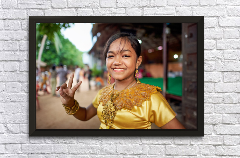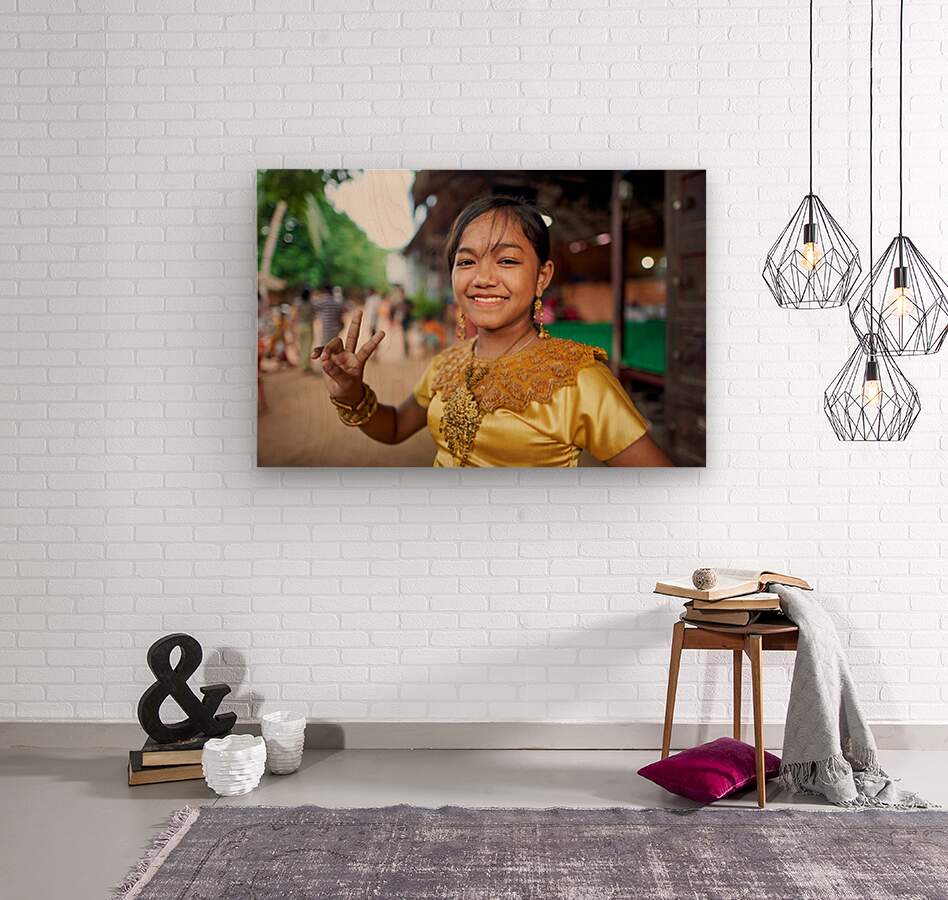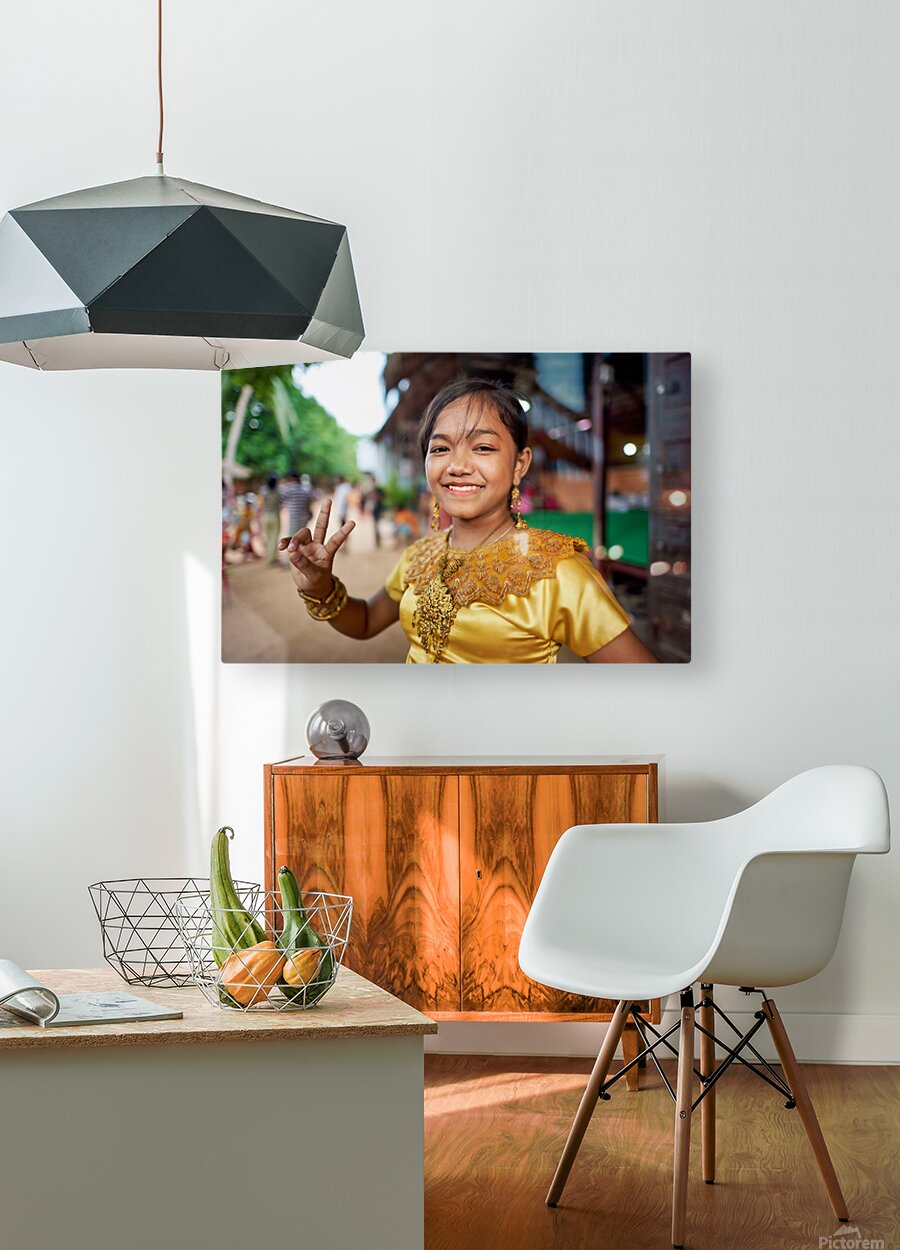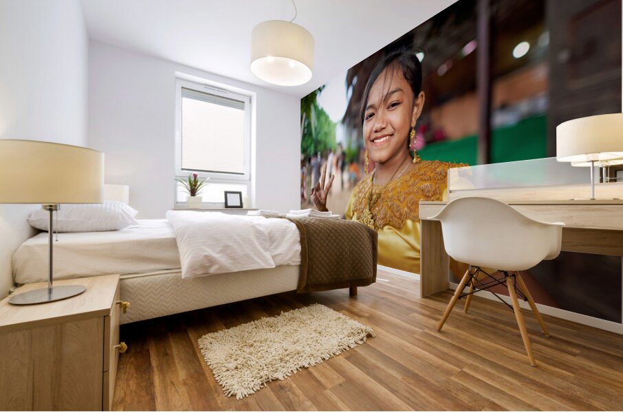 A smiling young girl in traditional golden attire makes a peace sign showcasing cultural beauty and warmth in a vibrant outdoor setting.