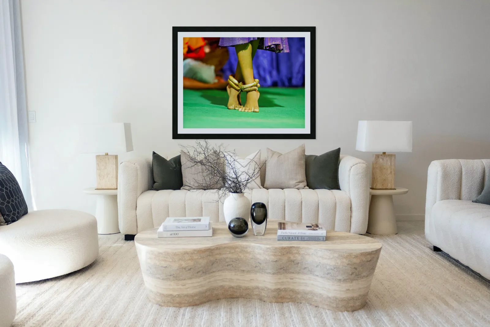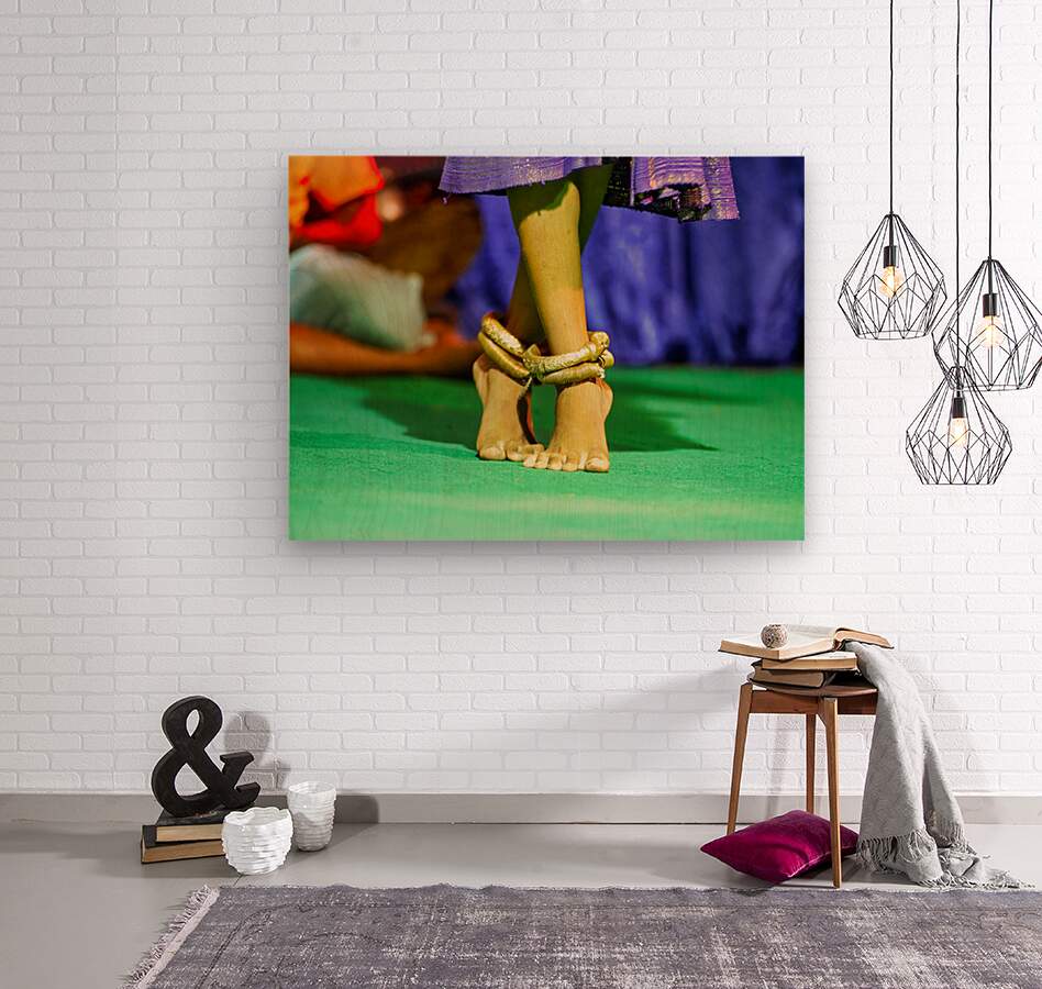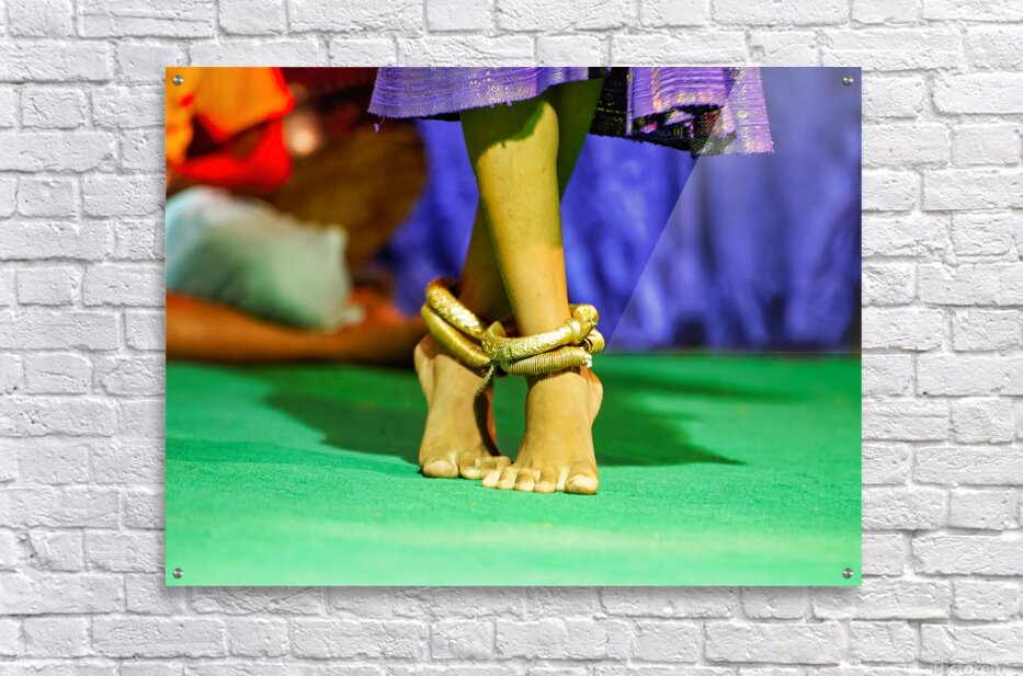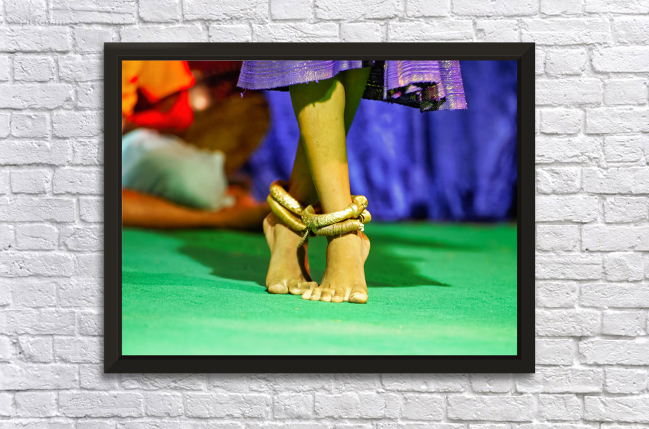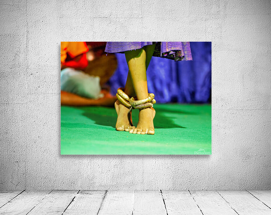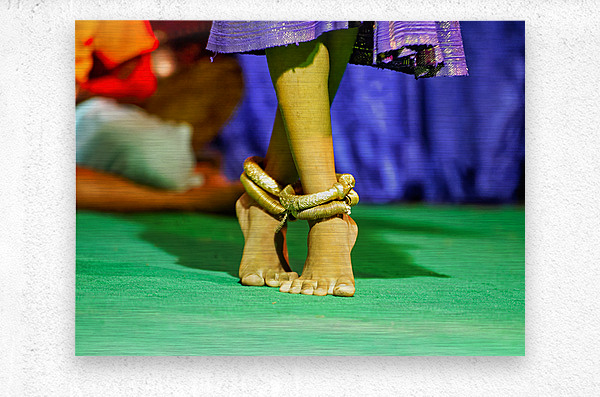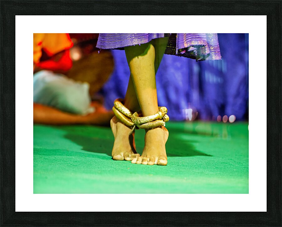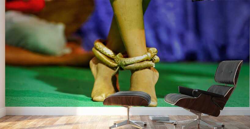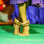 Close-up of a dancers bare feet adorned with intricate golden anklets crossed on a green surface likely during a traditional cultural performance.