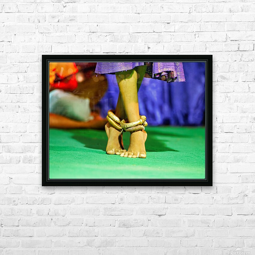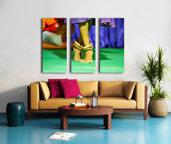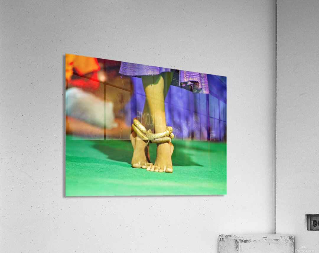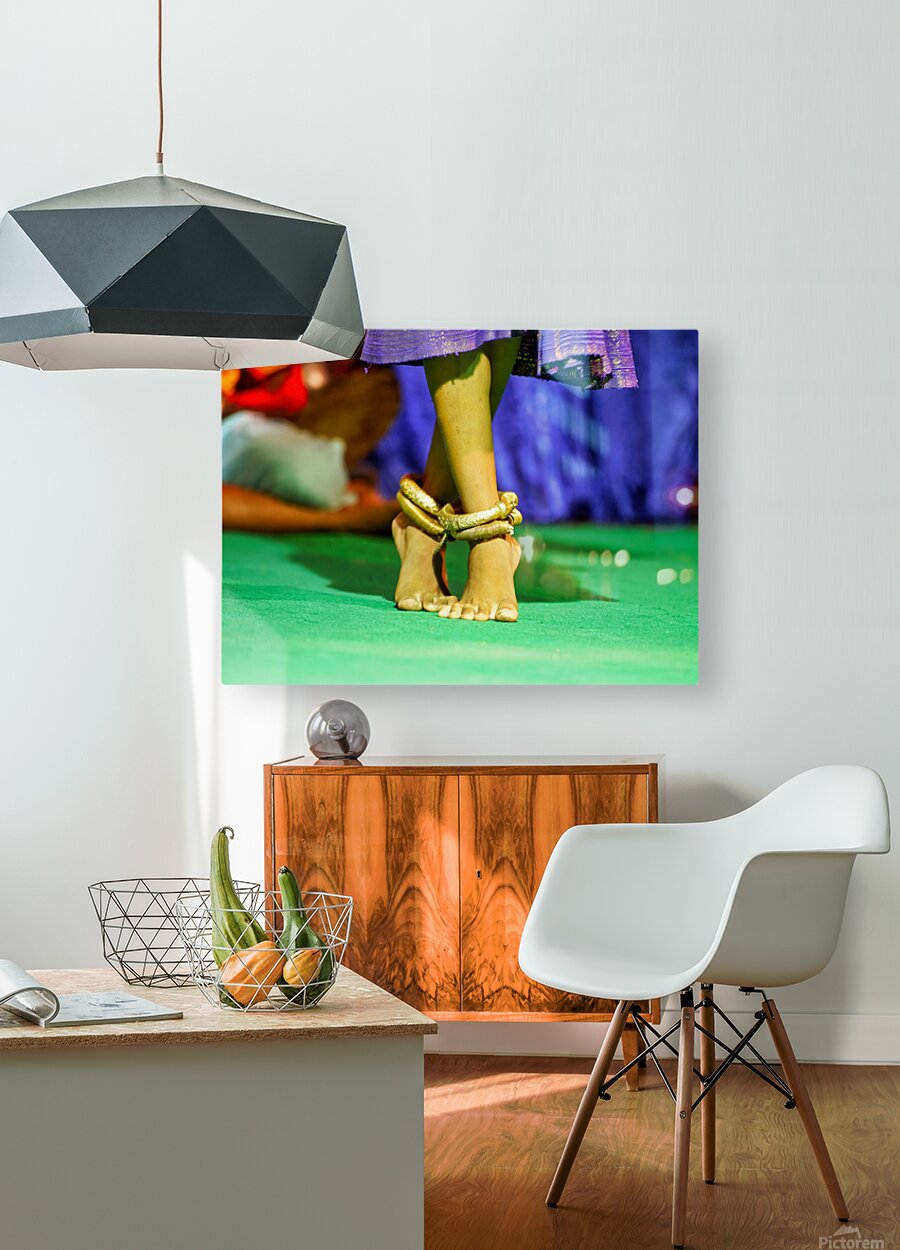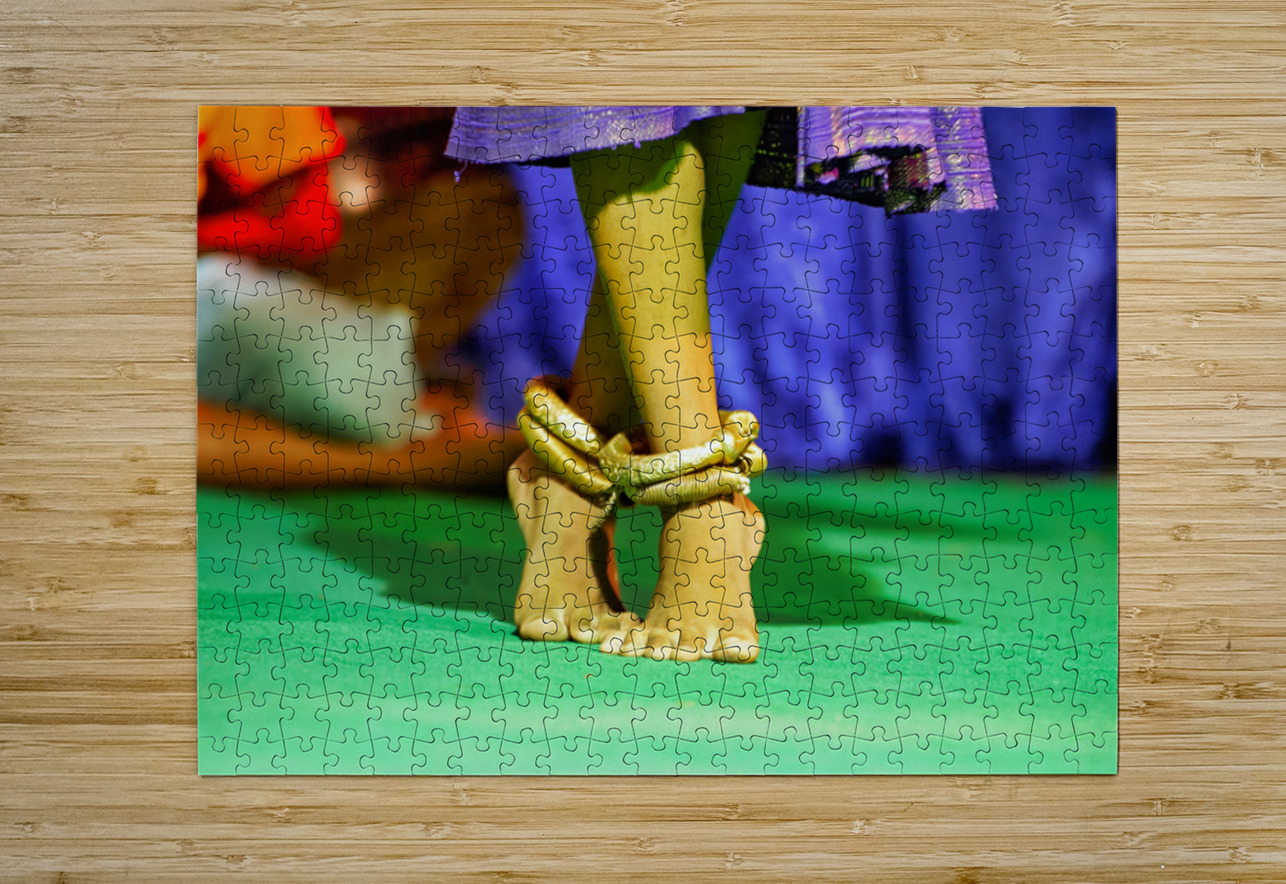 Close-up of a dancers bare feet adorned with intricate golden anklets crossed on a green surface likely during a traditional cultural performance.