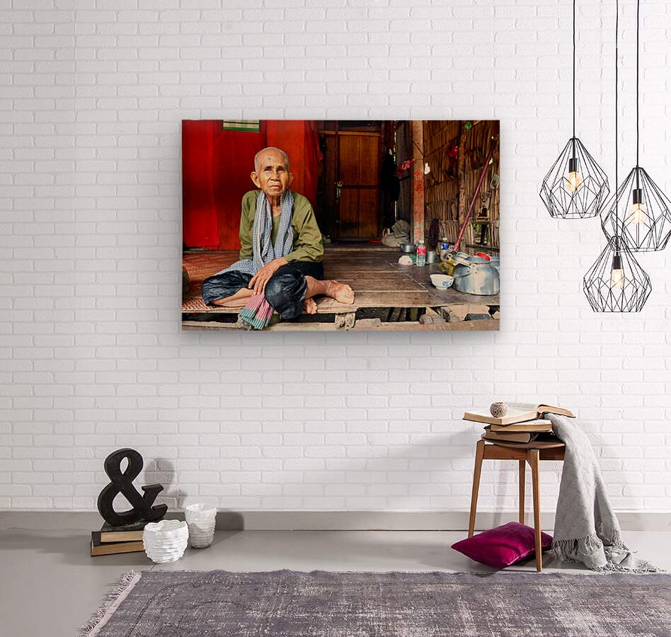 An elderly Cambodian woman in traditional attire sits on a mat inside her rustic home offering a glimpse into her daily life.