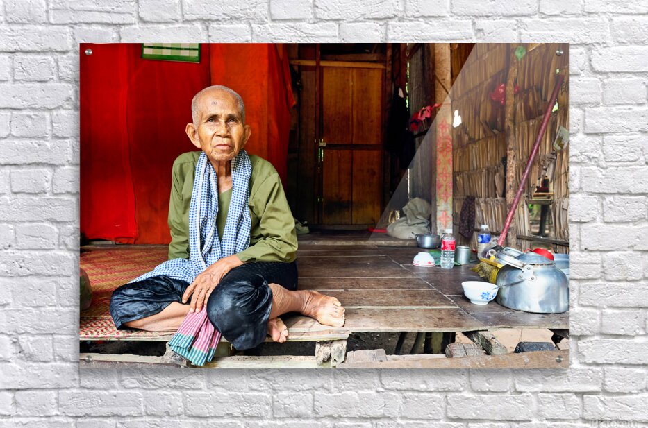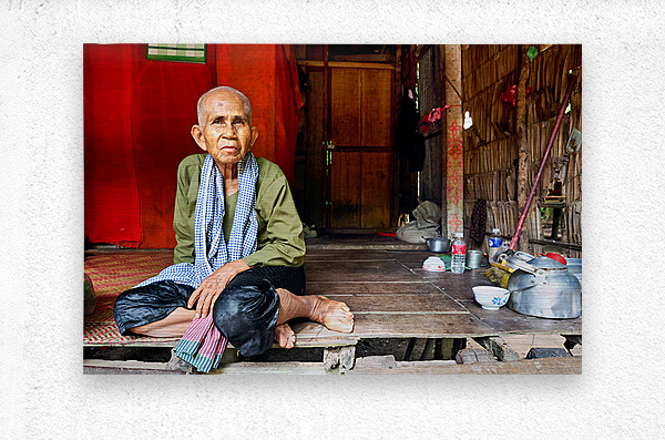 An elderly Cambodian woman in traditional attire sits on a mat inside her rustic home offering a glimpse into her daily life.