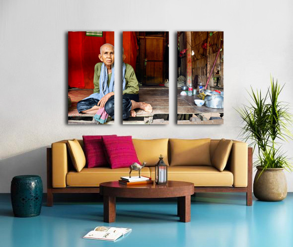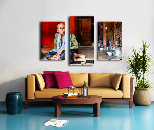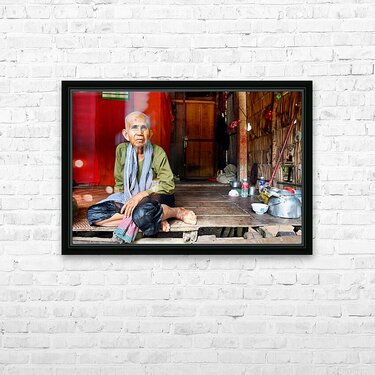 Elderly person sitting on floor in rustic dwelling. Frame print