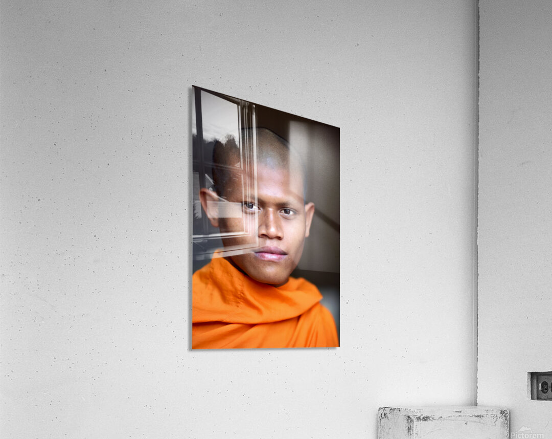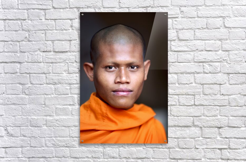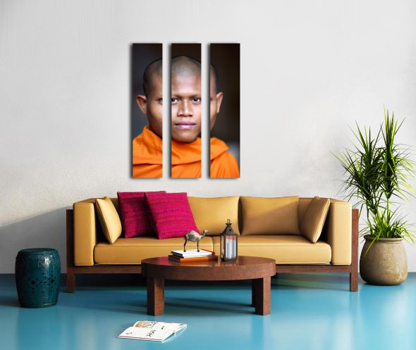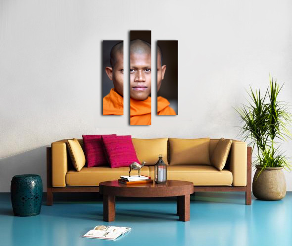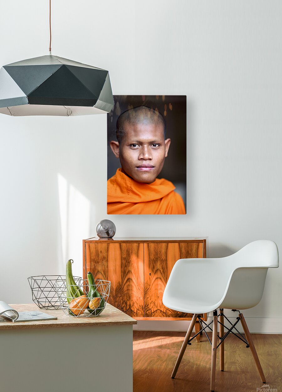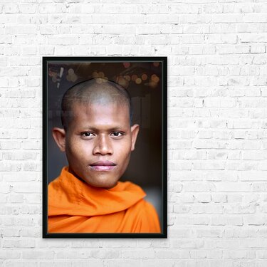 Young Buddhist monk in orange robe close up portrait. Frame print