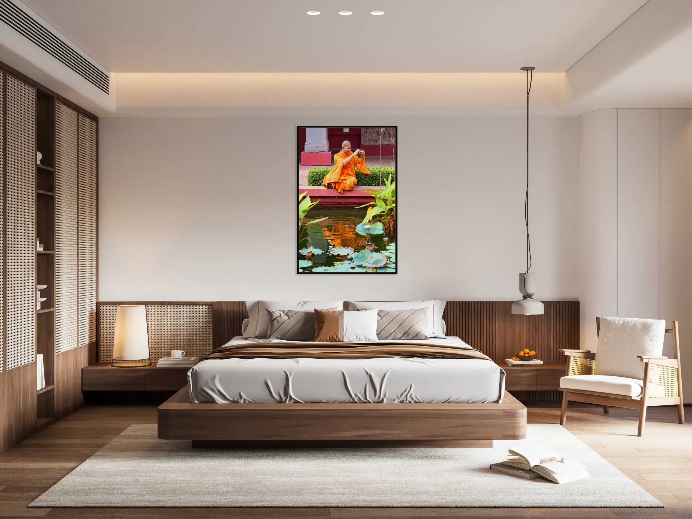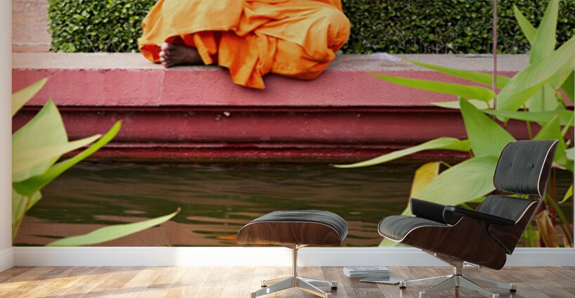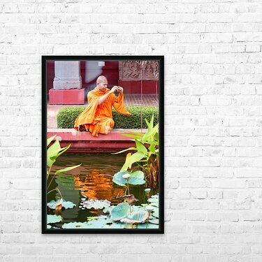 Monk in orange robes takes photo by a lotus pond. Frame print