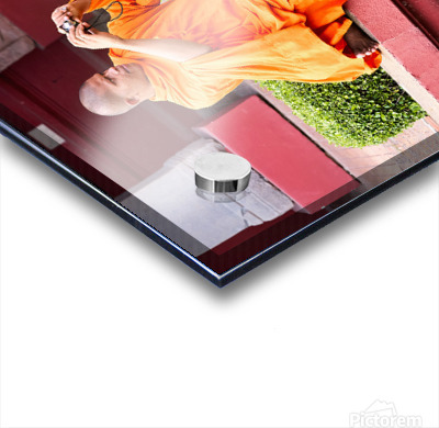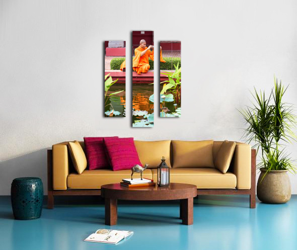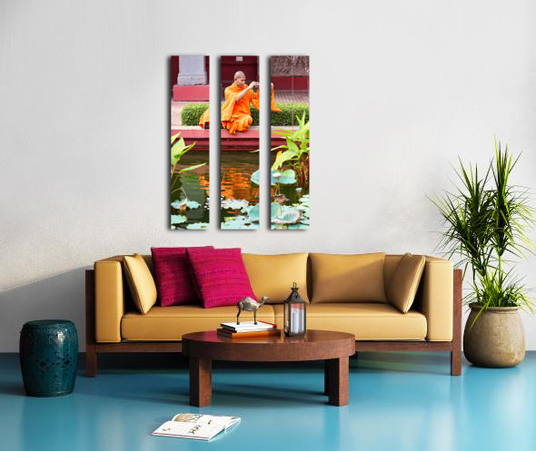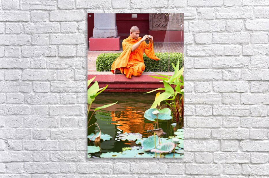 Monk in orange robes takes photo by a lotus pond. Marco Brivio Puzzle printing