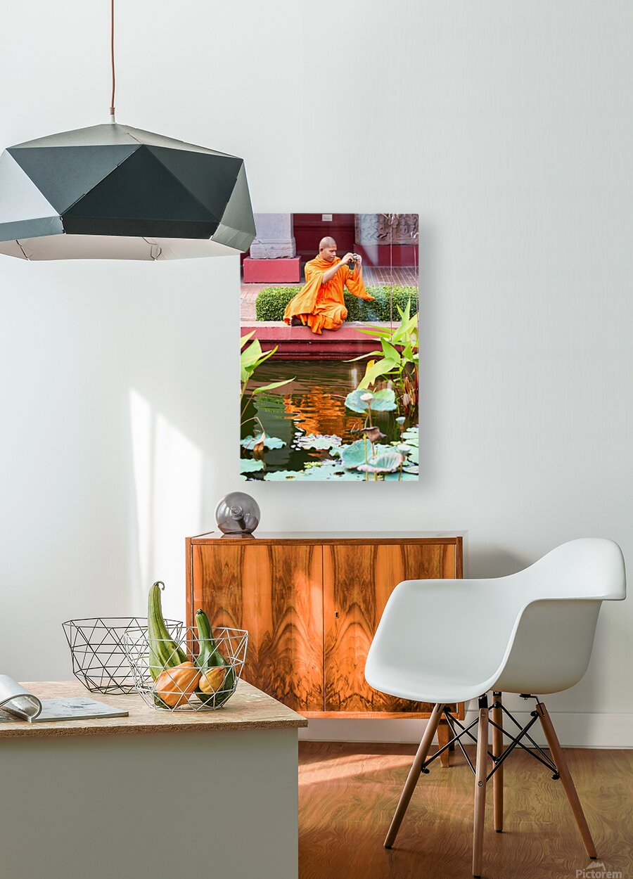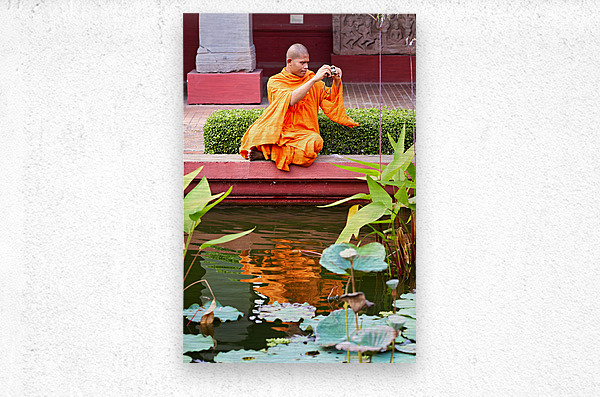 ABOUT THIS ARTWORK: MONK IN ORANGE ROBES TAKES PHOTO BY A LOTUS POND.