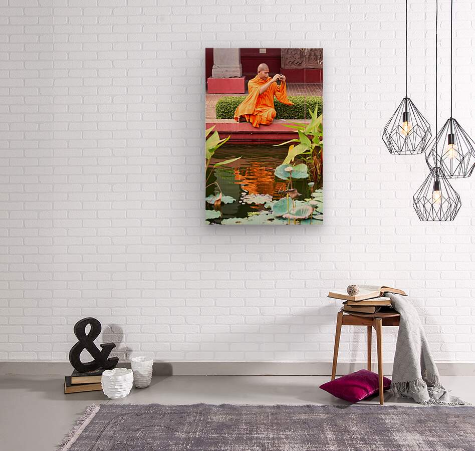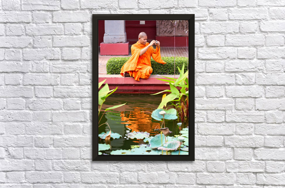 A Buddhist monk in orange robes photographs a lotus pond with a digital camera at a temple in Southeast Asia.