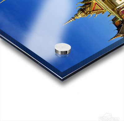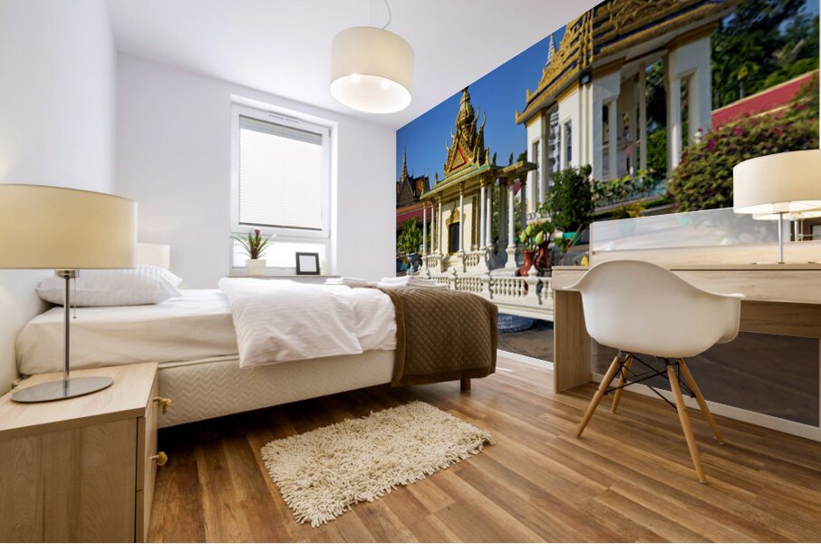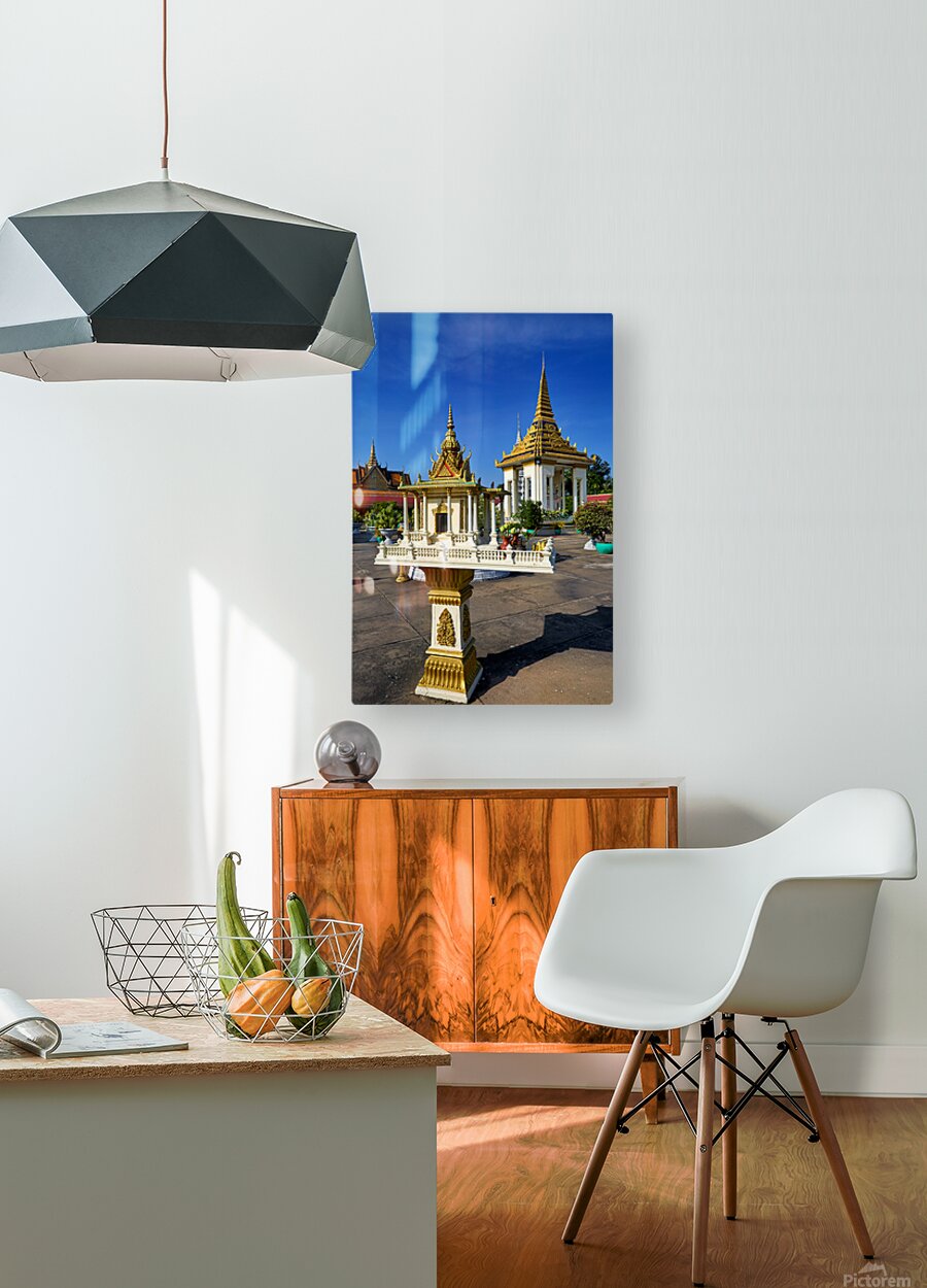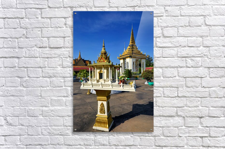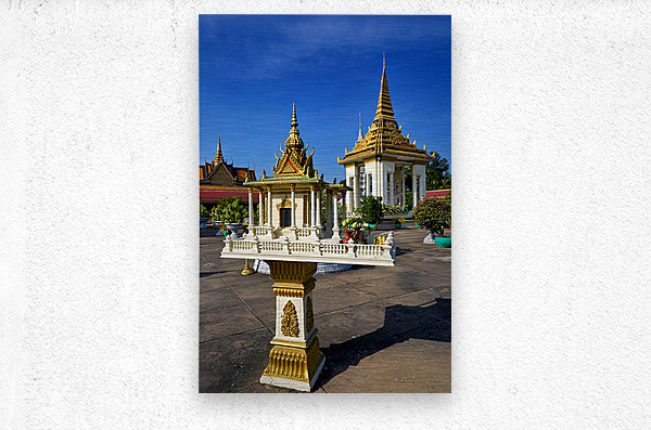 ABOUT THIS ARTWORK: GOLDEN SHRINE AND TEMPLE BUILDINGS IN CAMBODIA UNDER BLUE SKY.