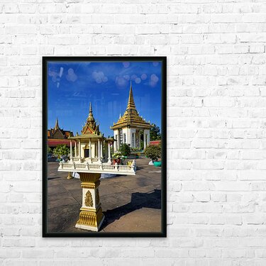Golden shrine and temple buildings in Cambodia under blue sky. Frame print
