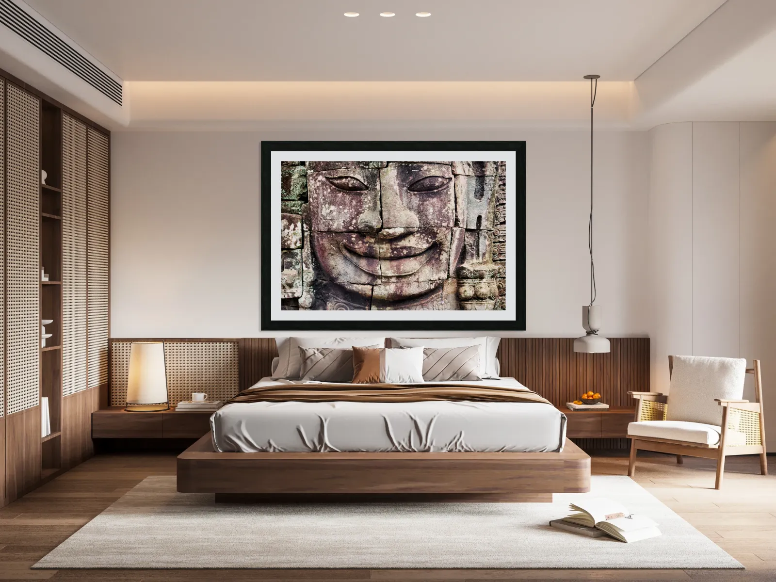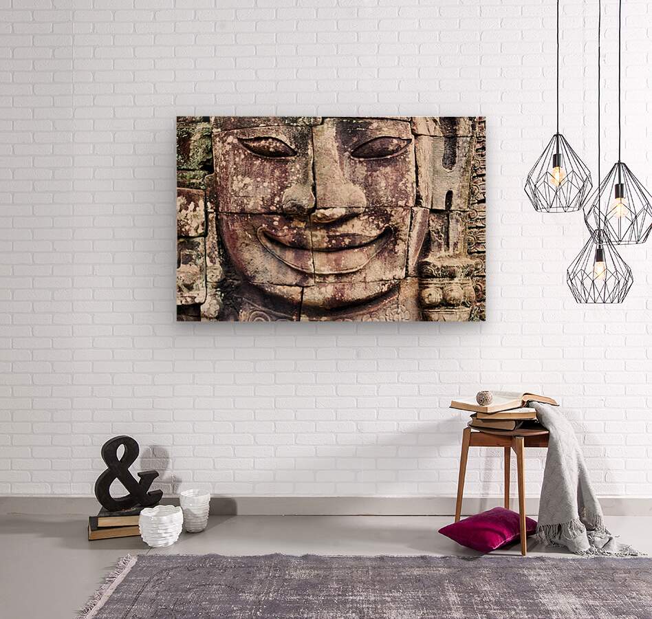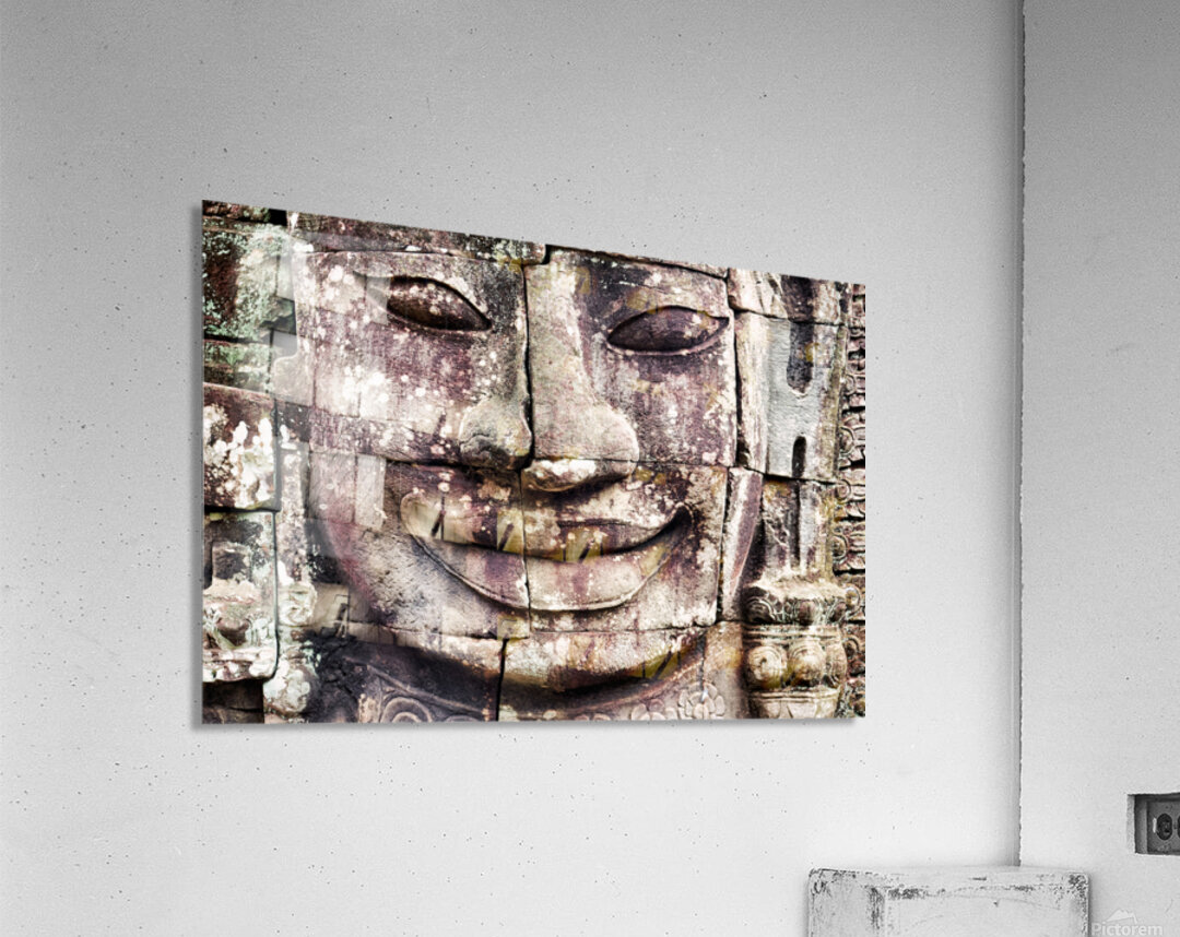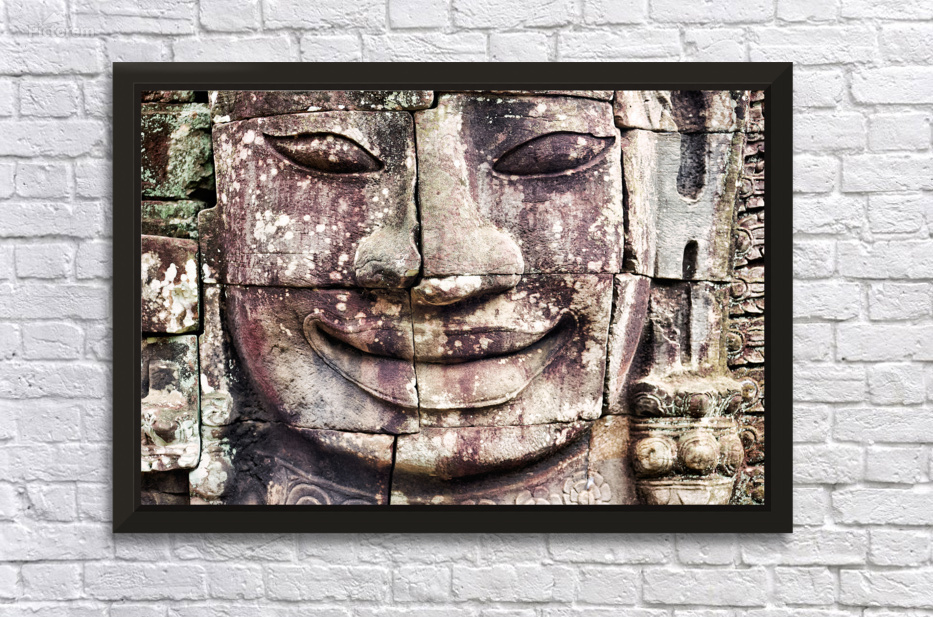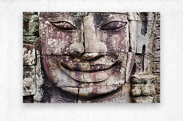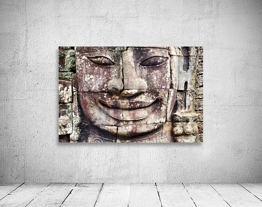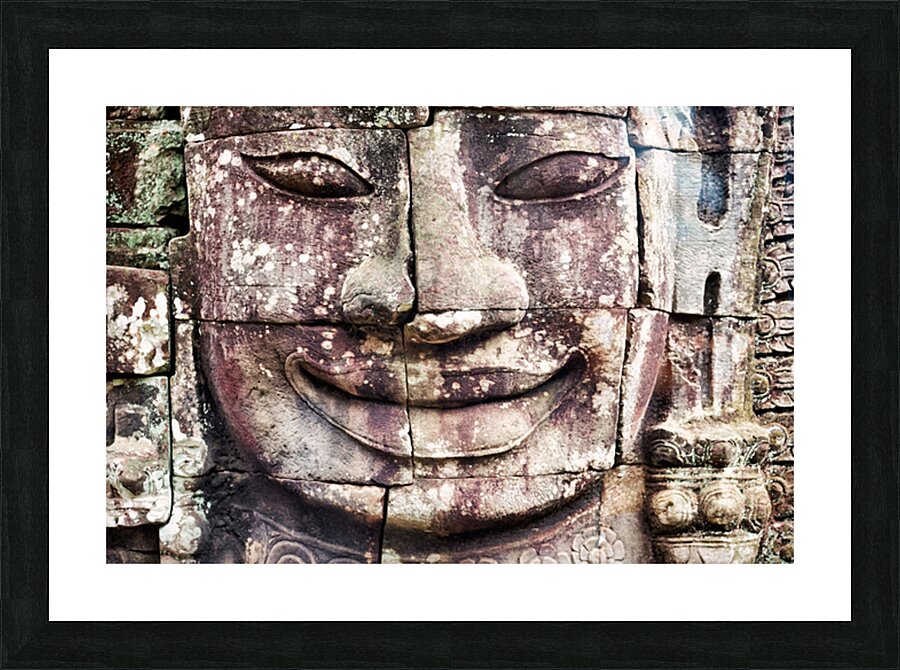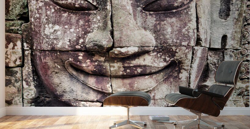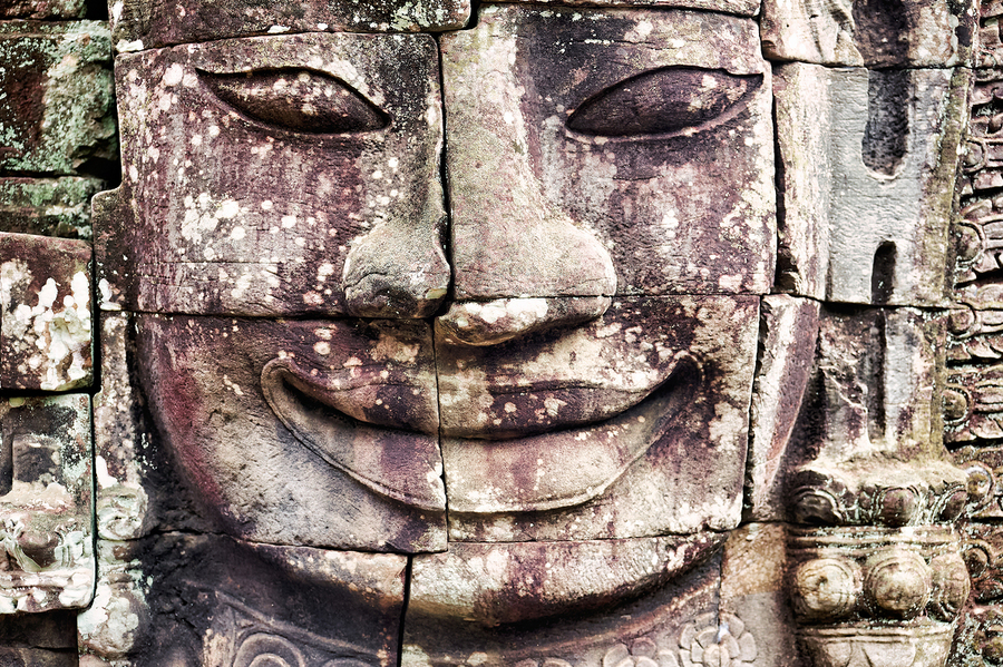 Ancient stone face of Lokeshvara or King Jayavarman VII at Bayon temple Angkor Thom Cambodia showcasing Khmer artistry and spiritual devotion.