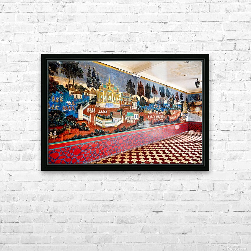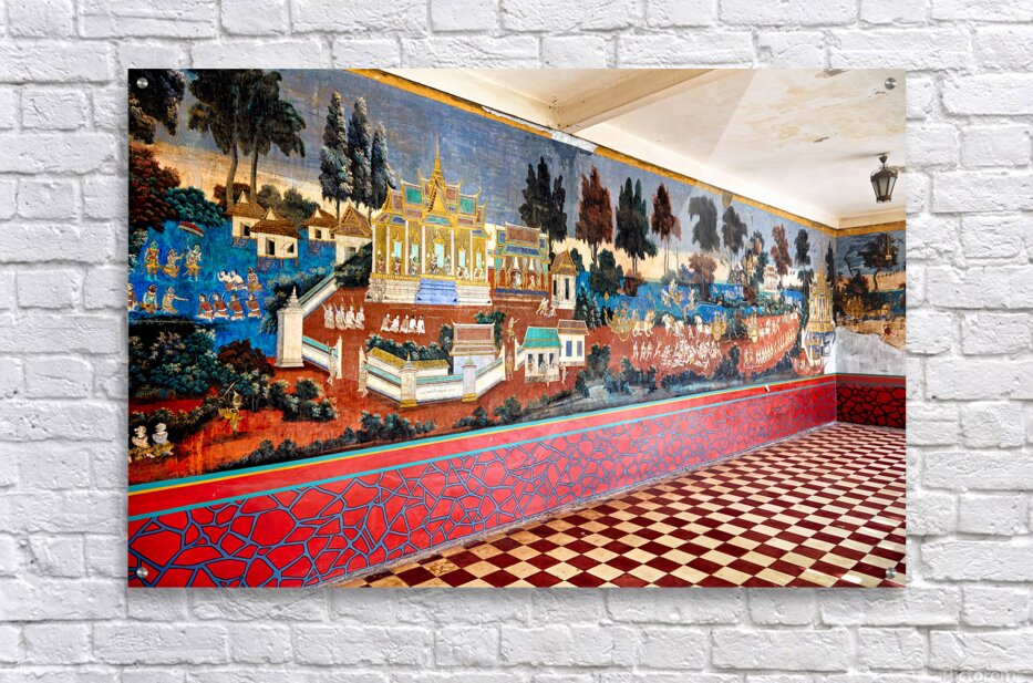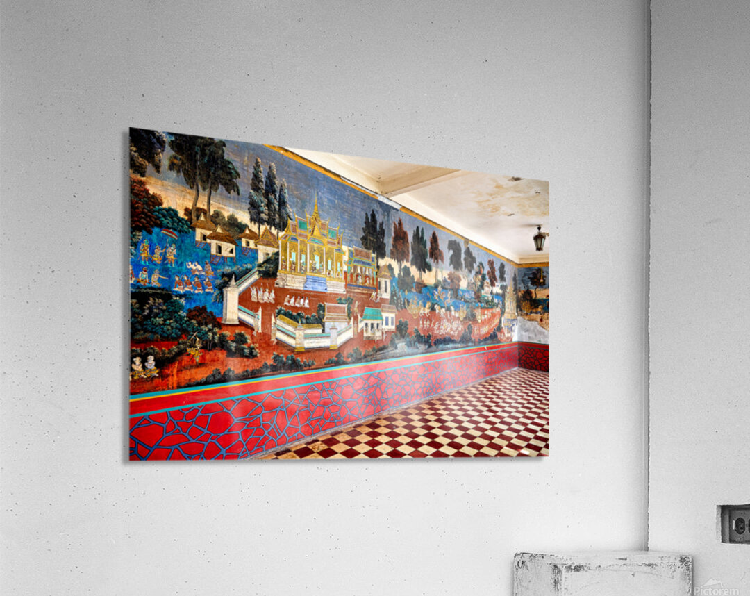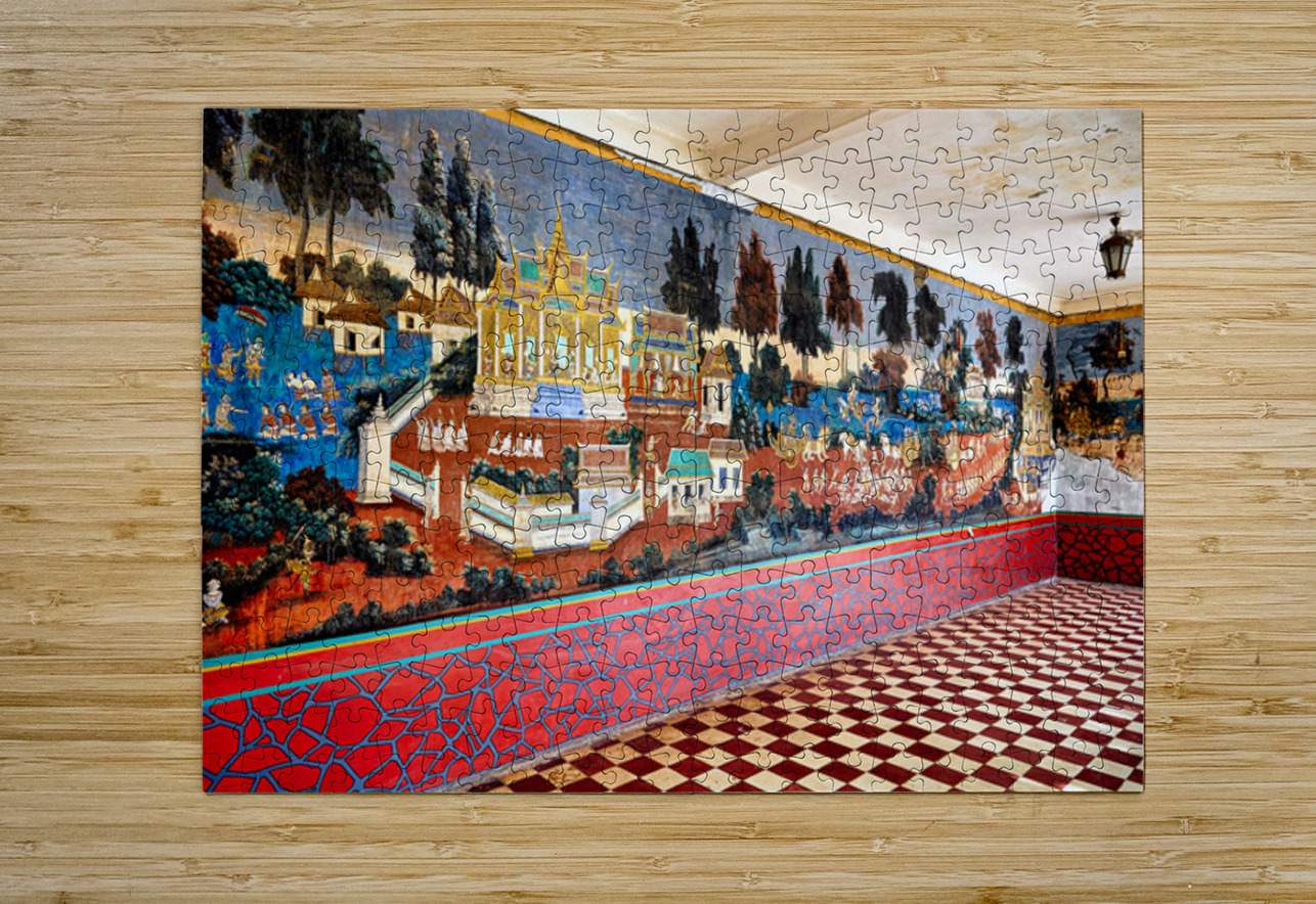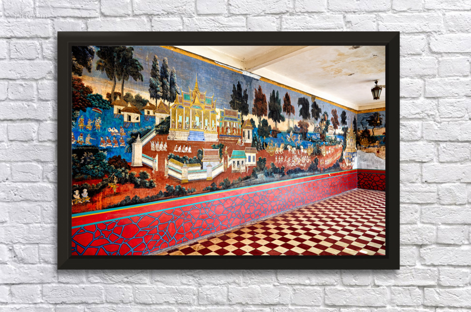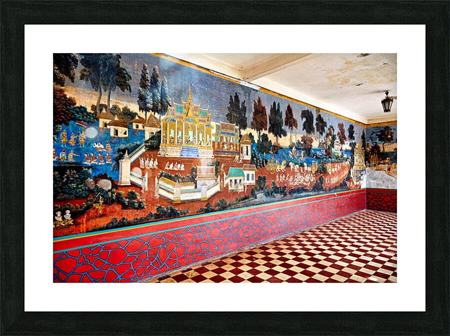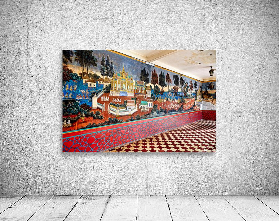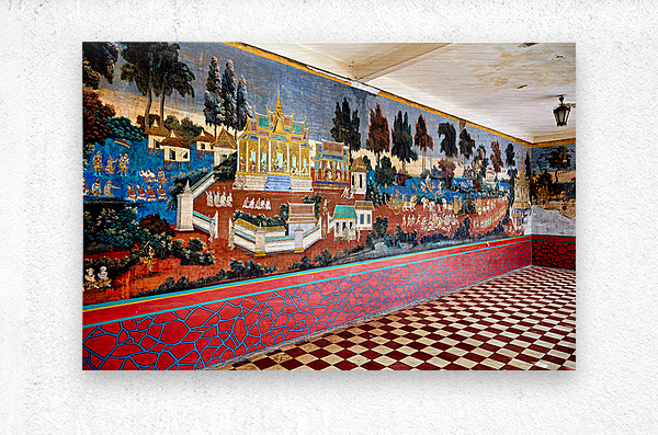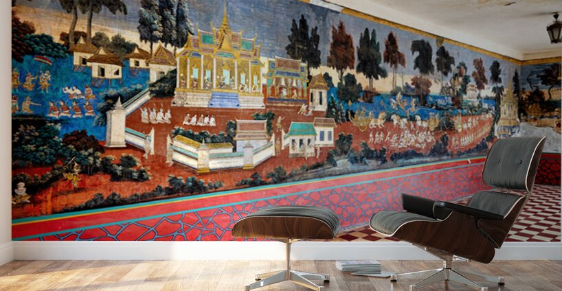 A vibrant mural depicting scenes from the Reamker Ramayana epic adorns the walls of the Silver Pagoda complex Royal Palace Phnom Penh Cambodia.
