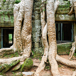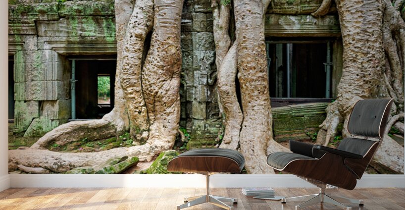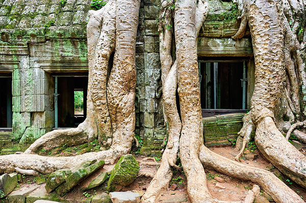 Massive tree roots embrace the ancient stone walls of Ta Prohm temple in Angkor Cambodia showcasing natures reclamation of historical sites.