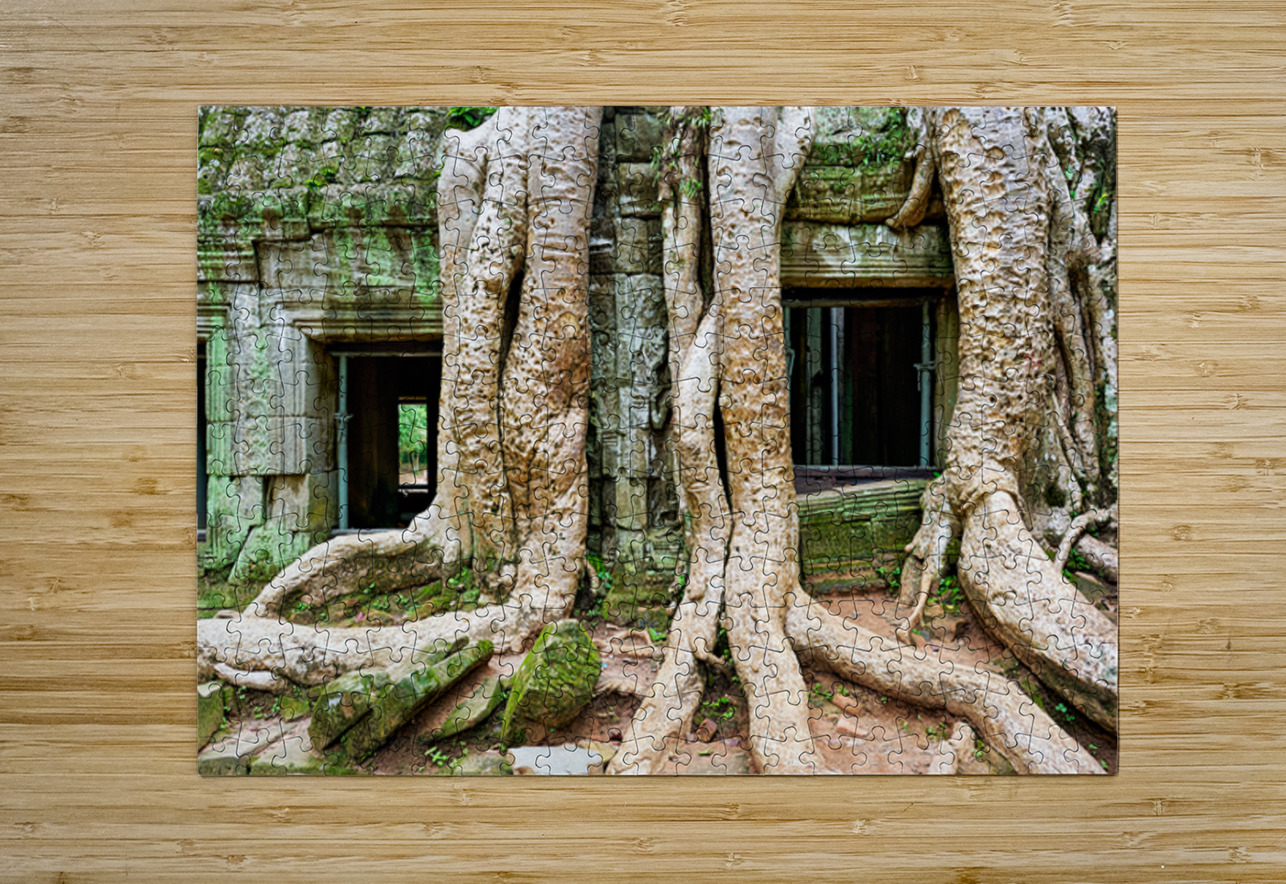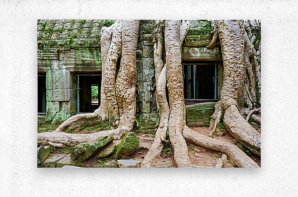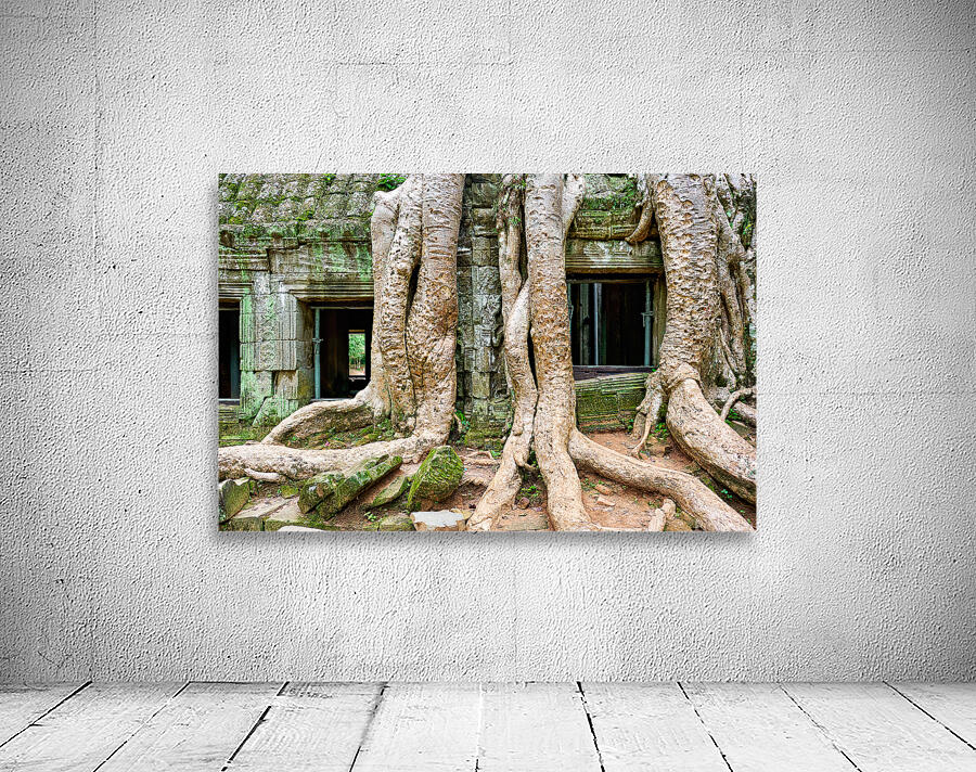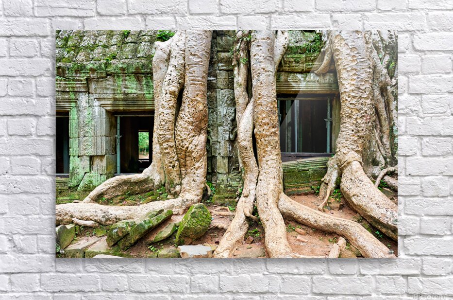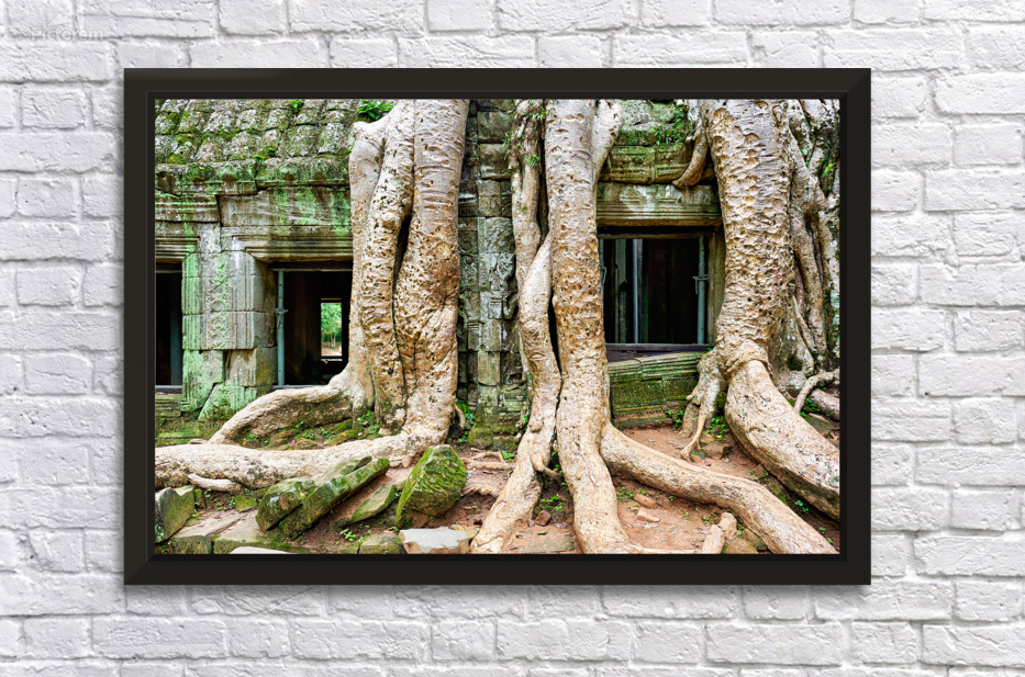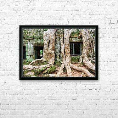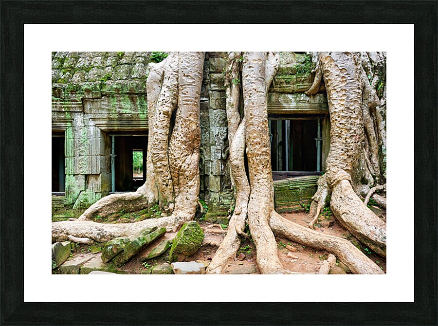 "Giant tree roots engulf ancient mossy temple ruins." in a framed print.