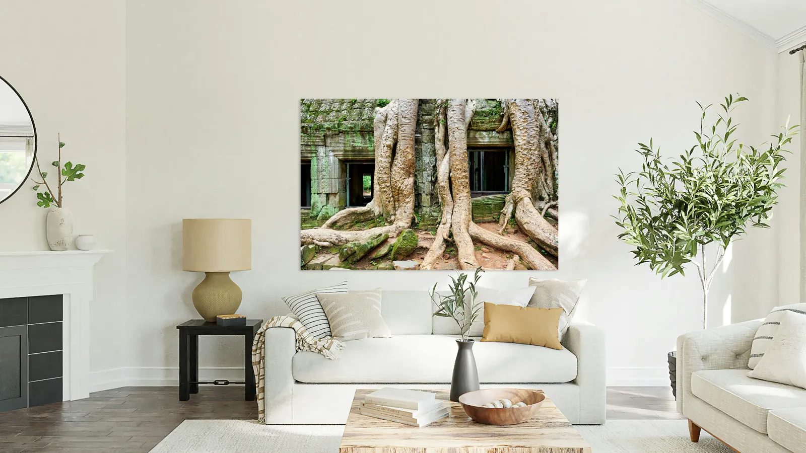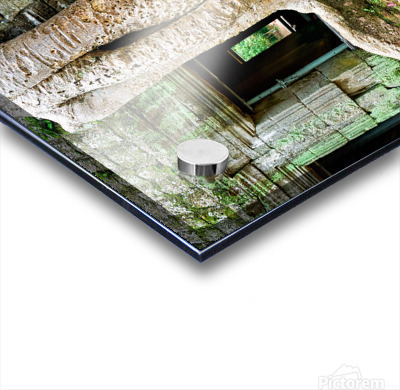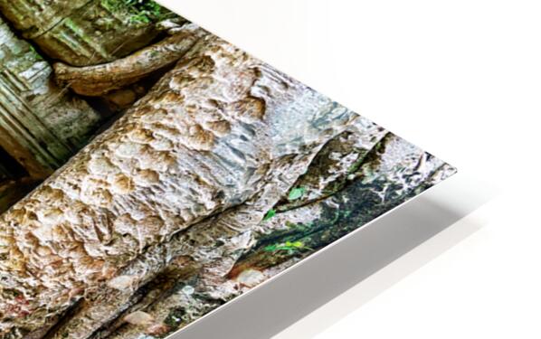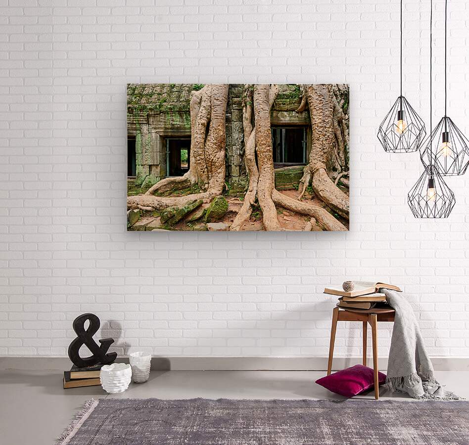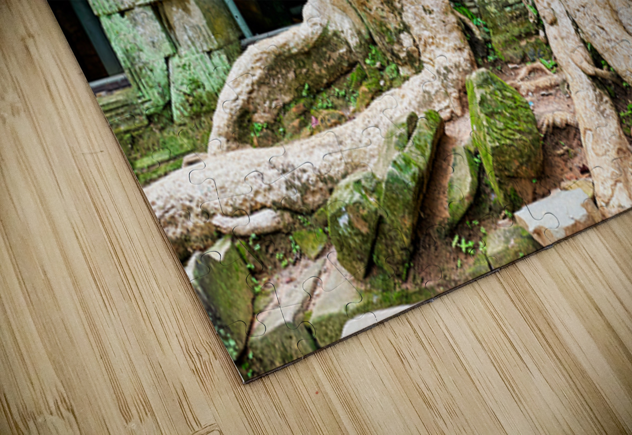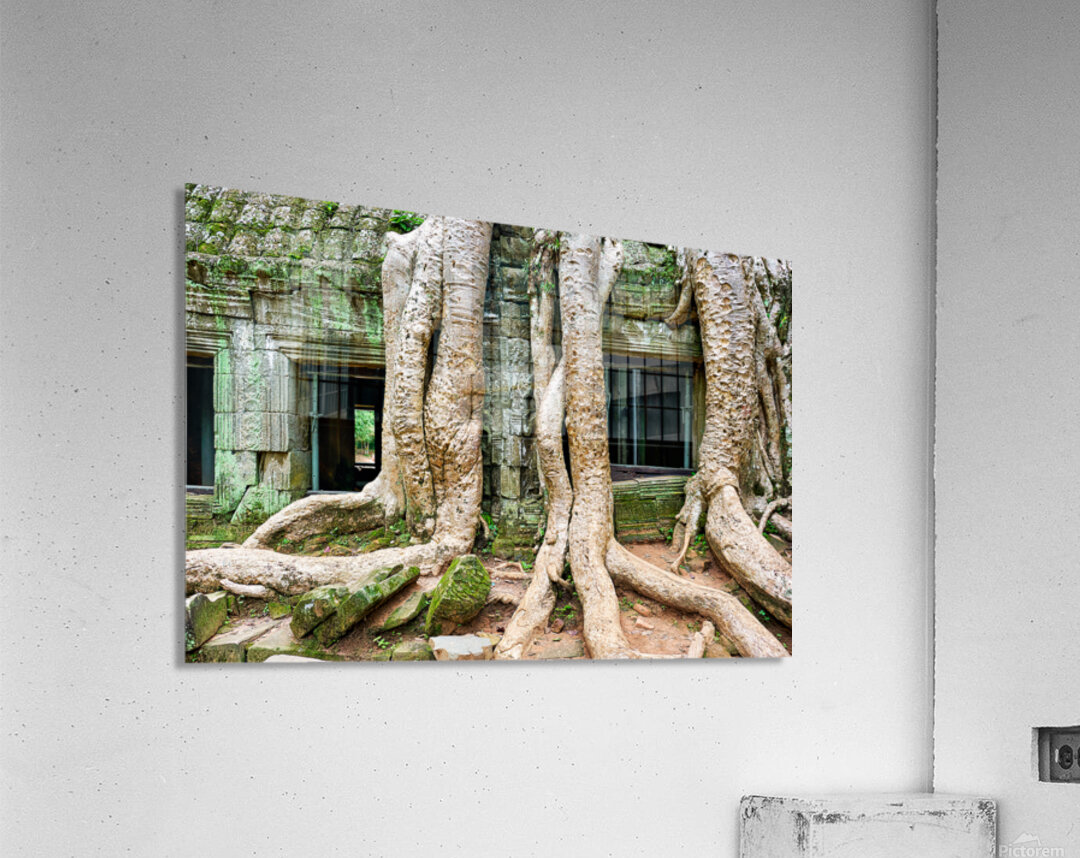 "Giant tree roots engulf ancient mossy temple ruins." in a framed print.
