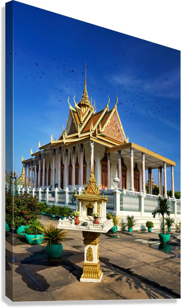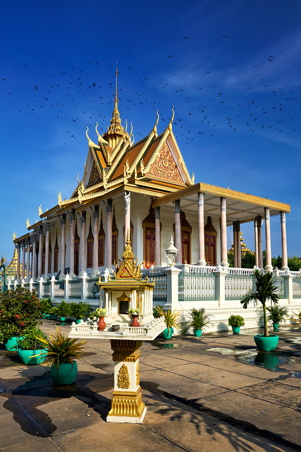 Birds fly over the Silver Pagoda at the Royal Palace in Phnom Penh Cambodia a stunning example of Khmer architecture and a sacred site.