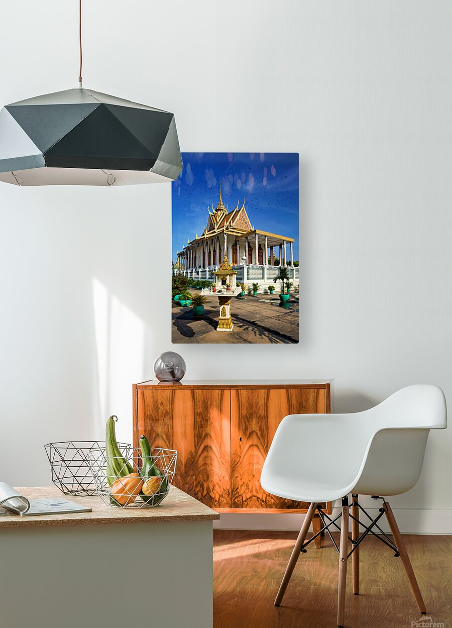 ABOUT THIS ARTWORK: MAJESTIC CAMBODIAN TEMPLE UNDER A BLUE SKY WITH FLYING BIRDS.