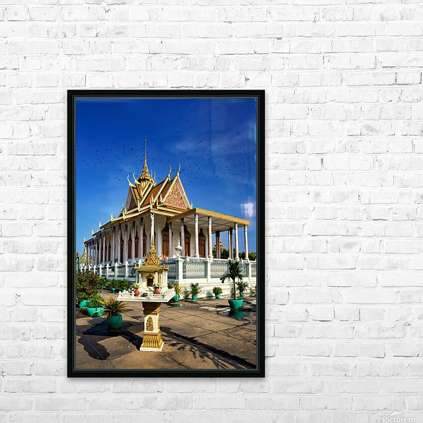 Majestic Cambodian temple under a blue sky with flying birds. Picture Frame Printing