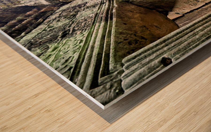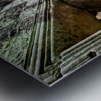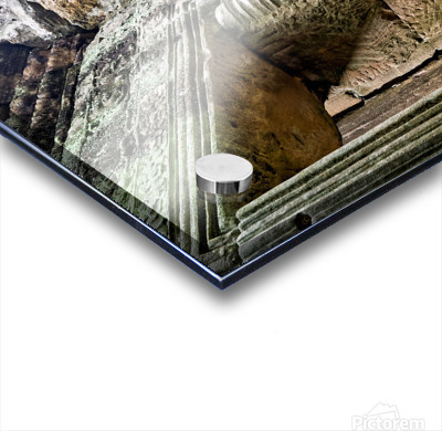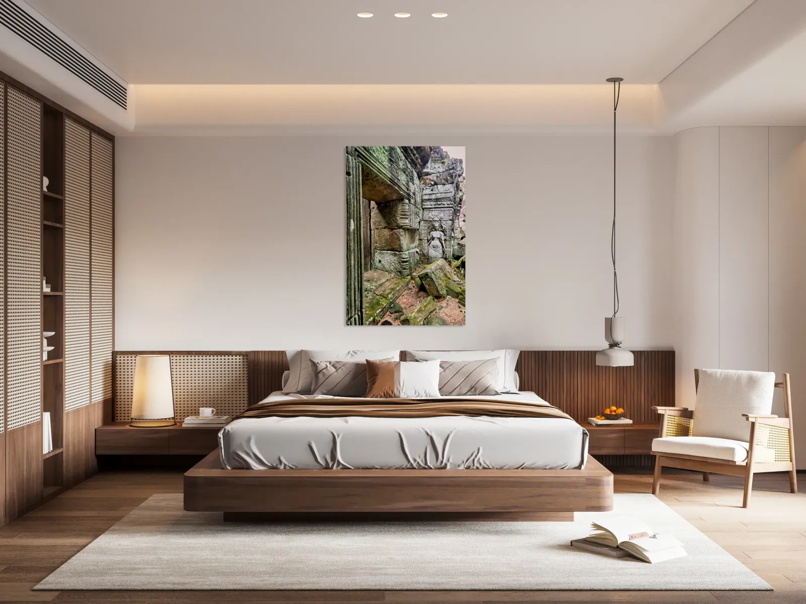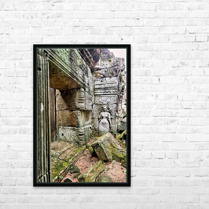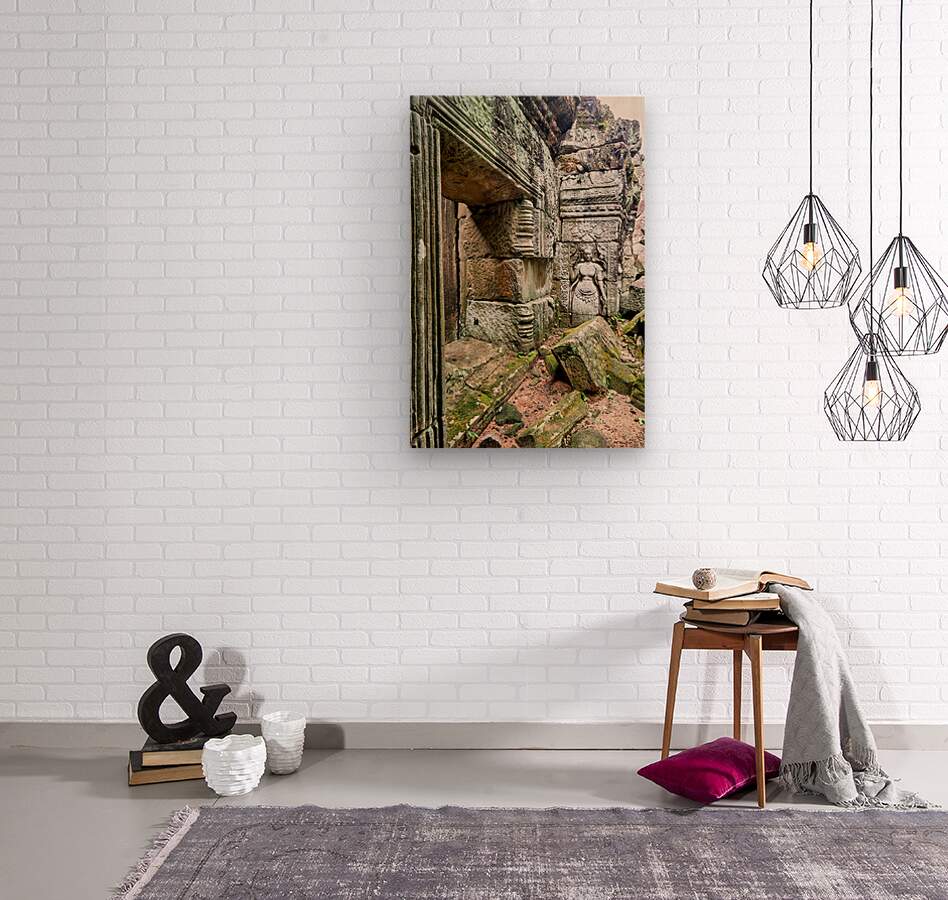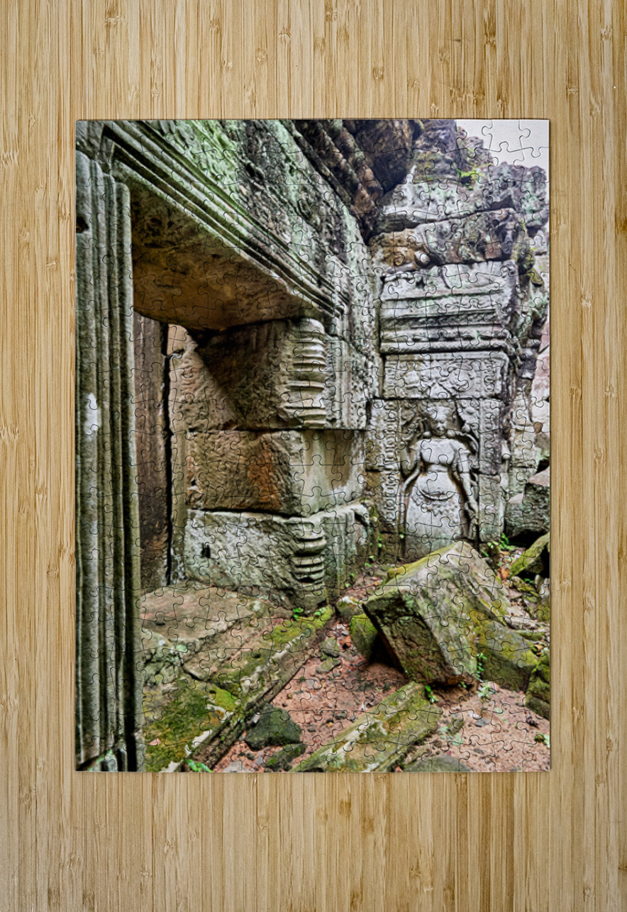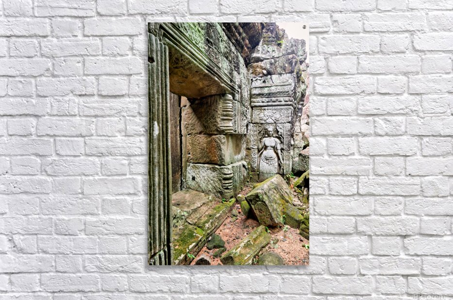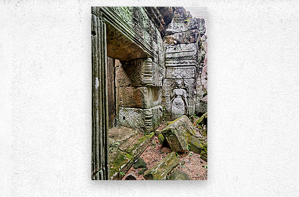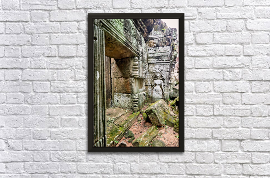 "Ancient temple ruins with carved stone deity and moss." in a framed print.