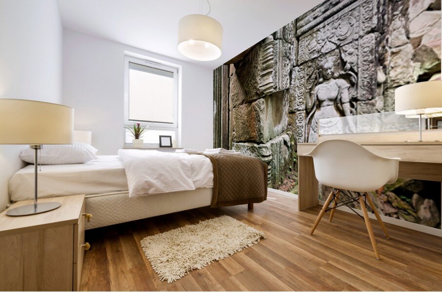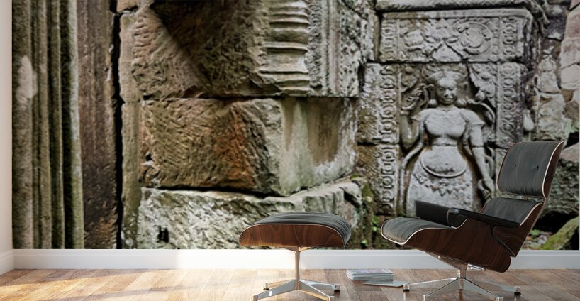 Moss-covered ancient Khmer temple ruins in Angkor Cambodia featuring a detailed Apsara carving reflecting the rich history and artistry of the civiliz