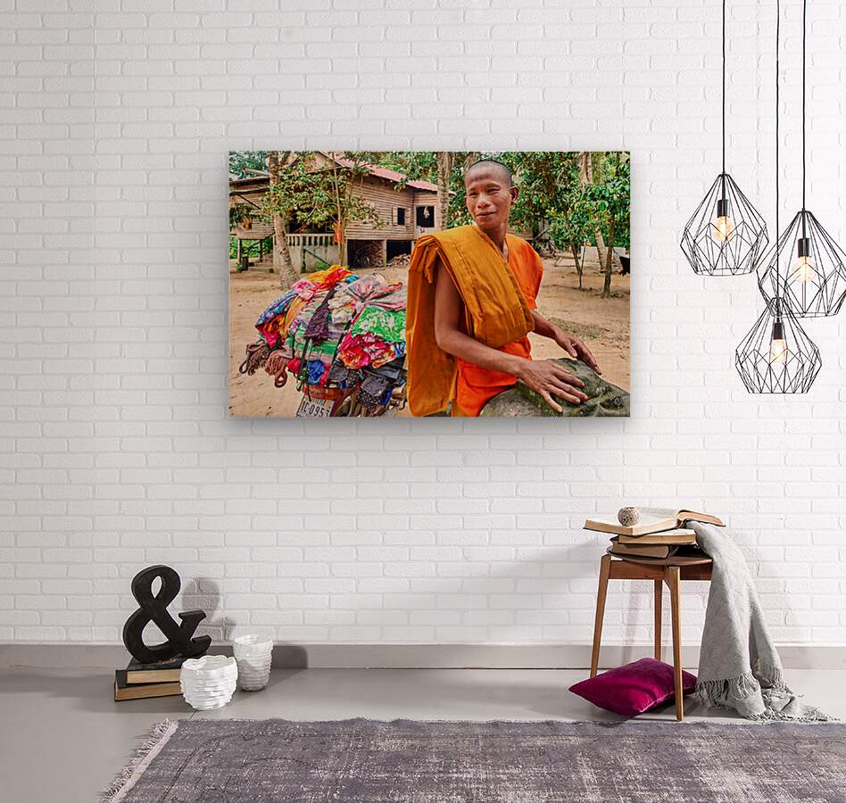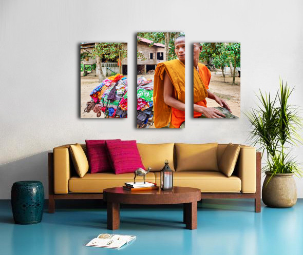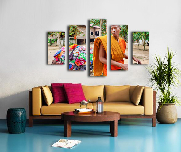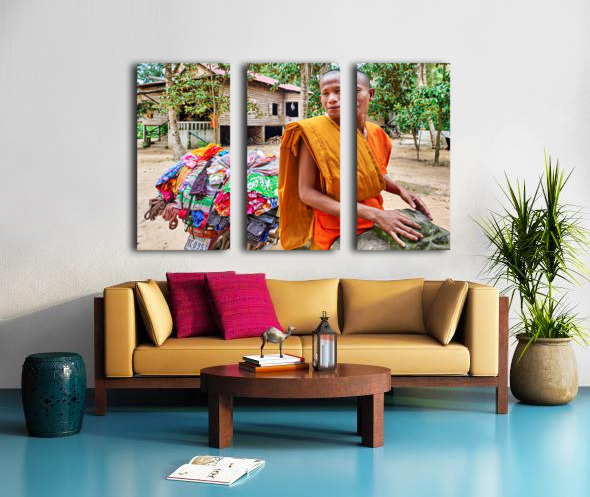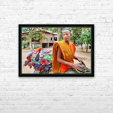 Monk with colorful textiles on a motorcycle. Frame print