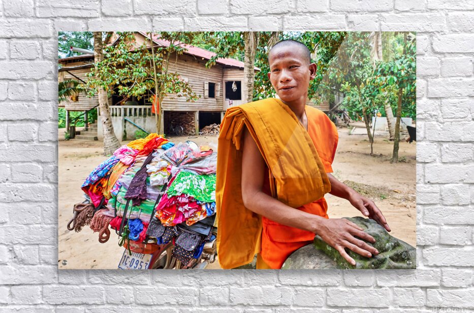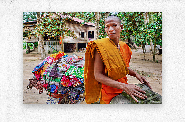 ABOUT THIS ARTWORK: MONK WITH COLORFUL TEXTILES ON A MOTORCYCLE.