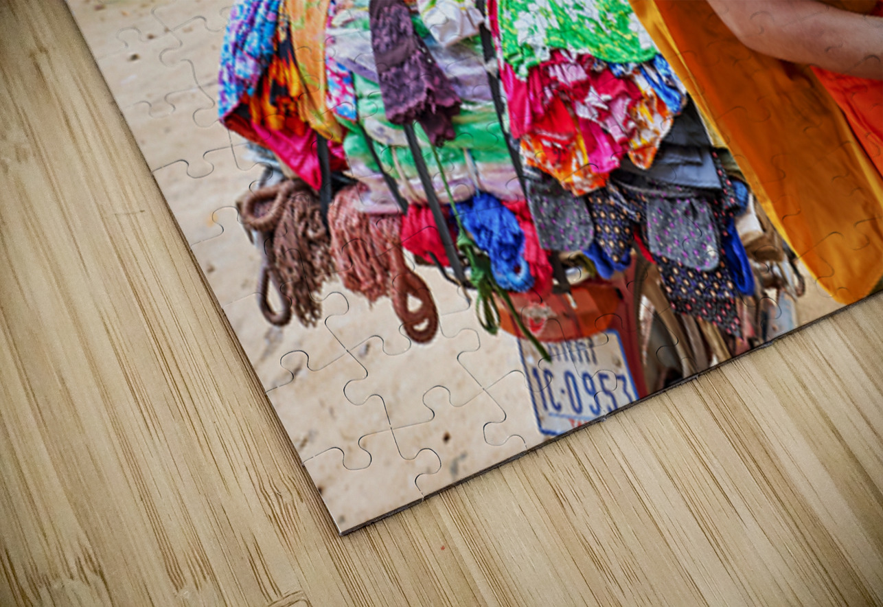 Monk with colorful textiles on a motorcycle. Marco Brivio Puzzle printing