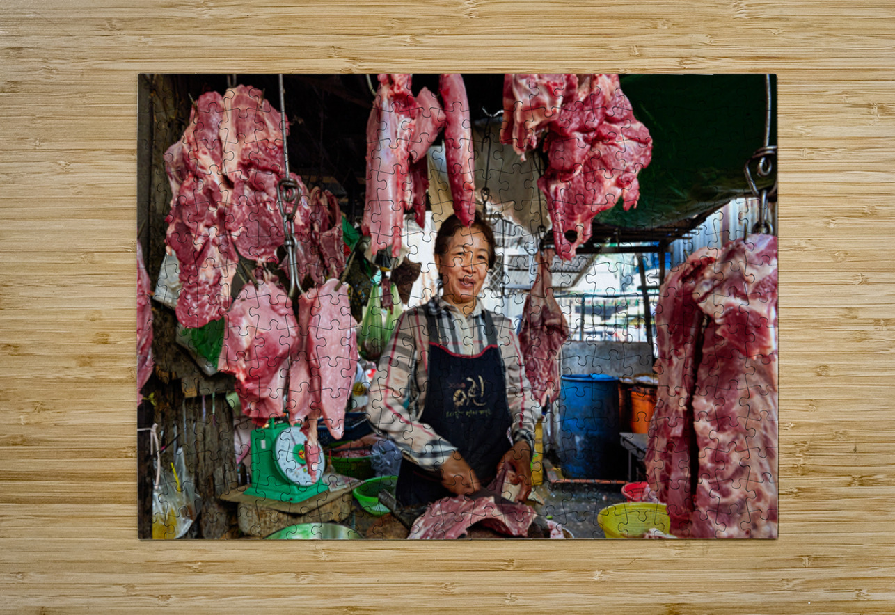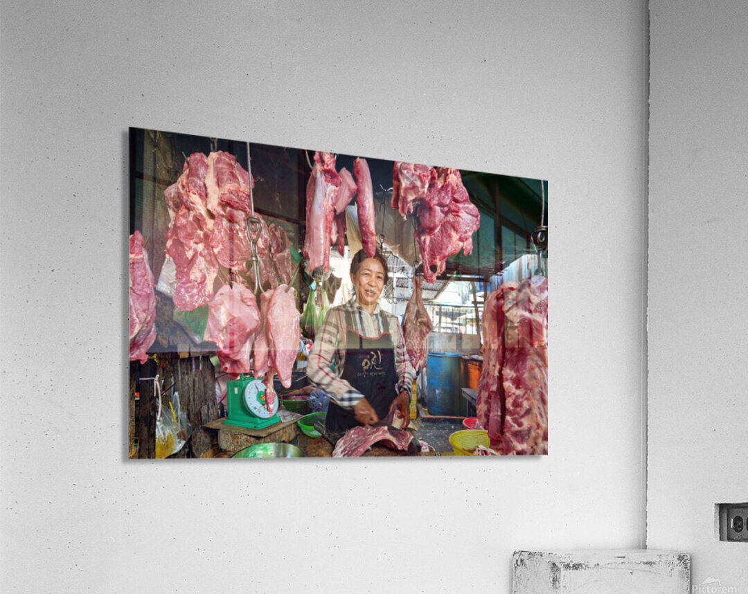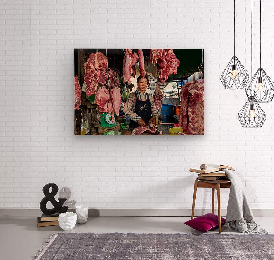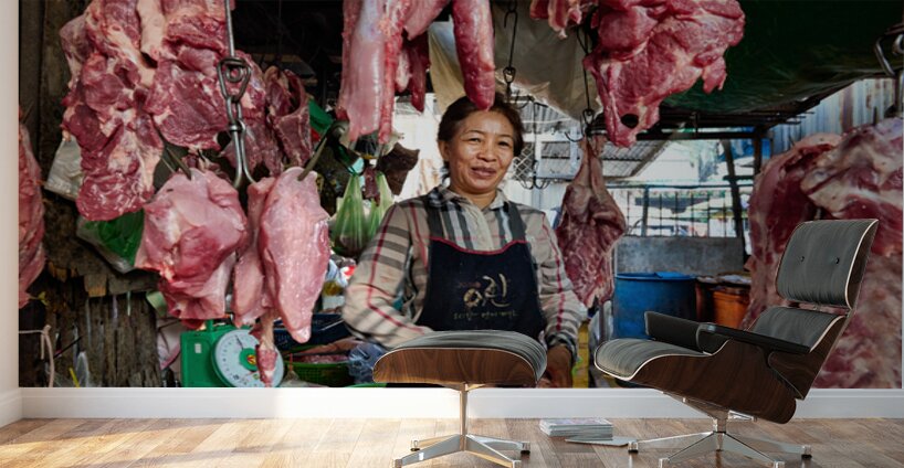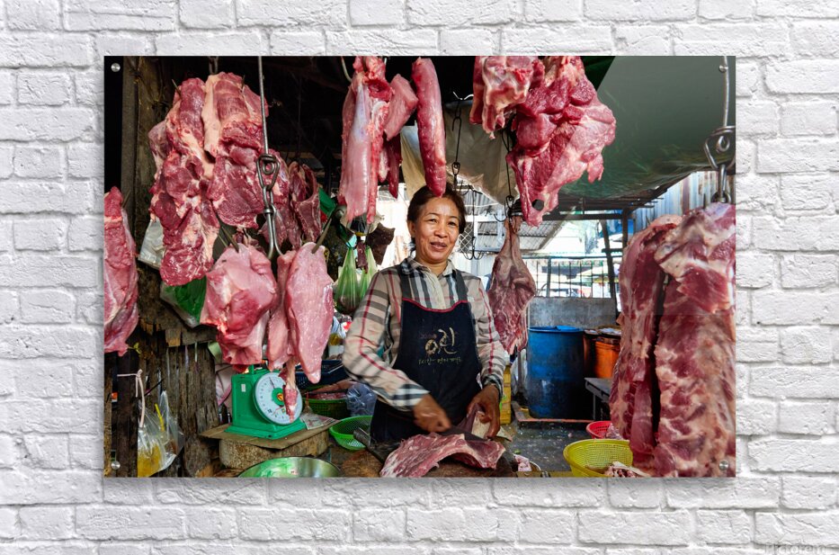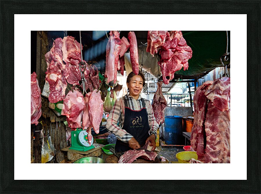 A smiling Asian woman a butcher cuts fresh pork at her market stall surrounded by hanging meat ready for sale to customers.