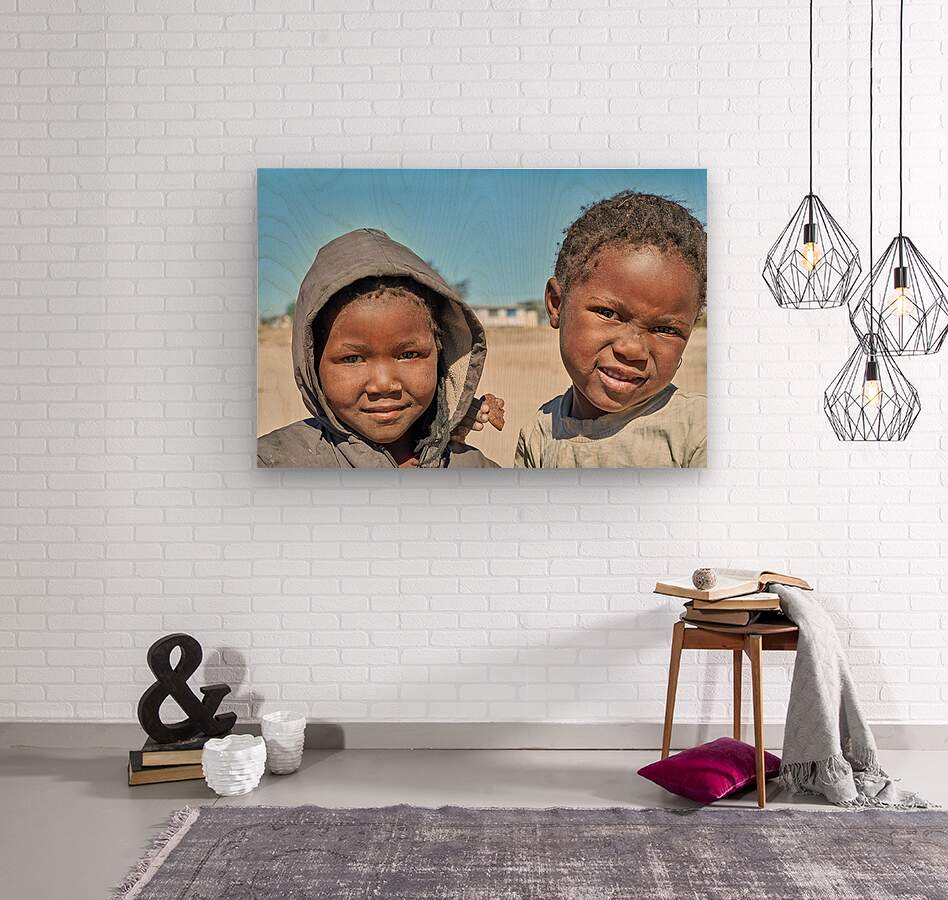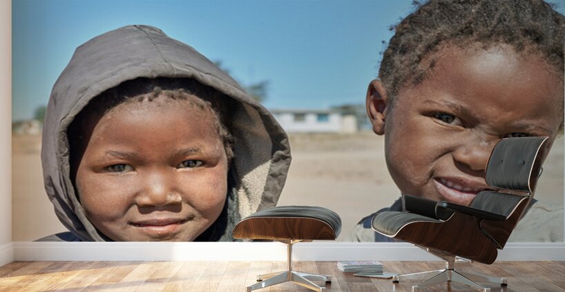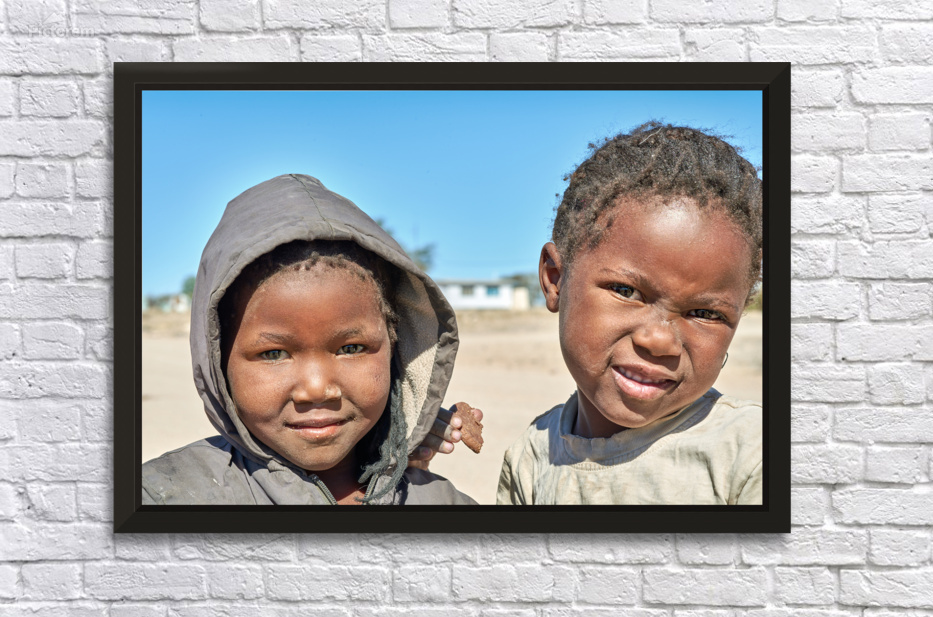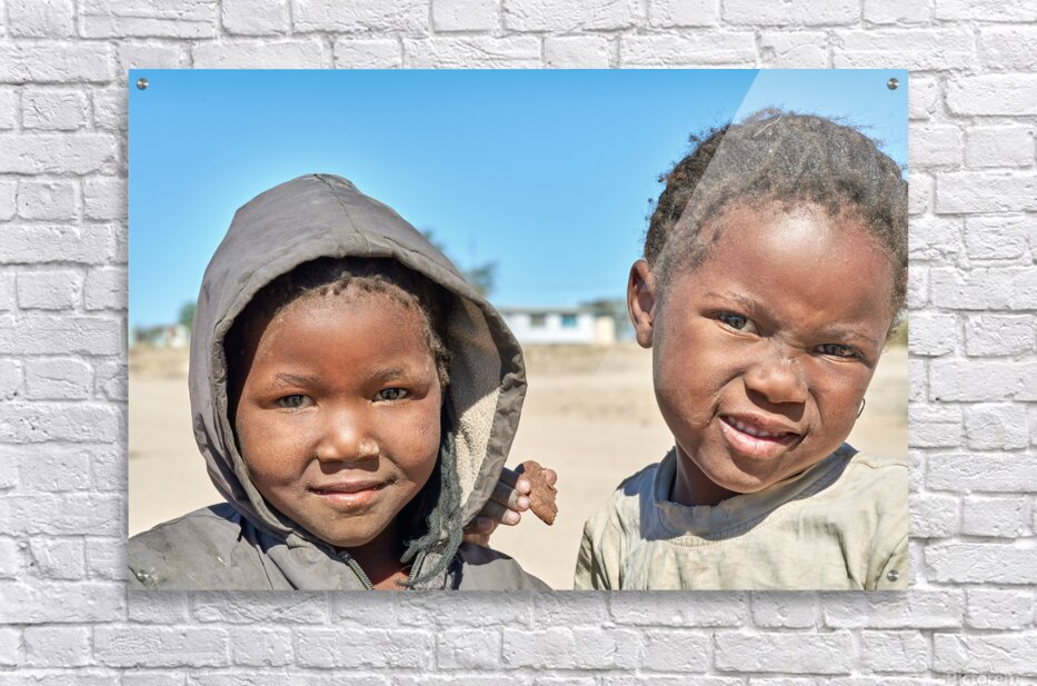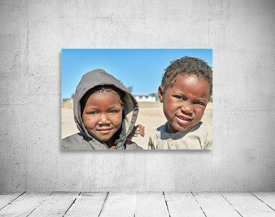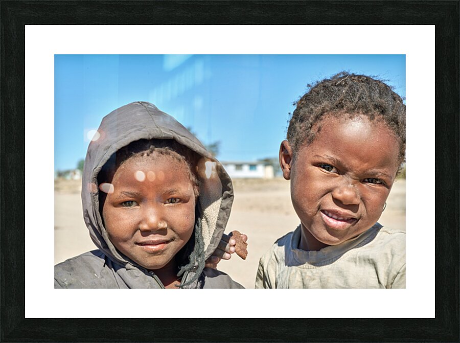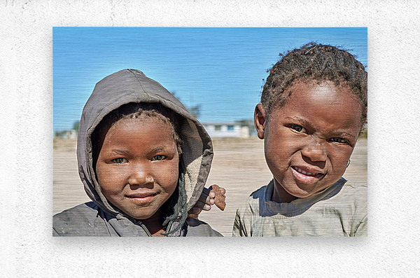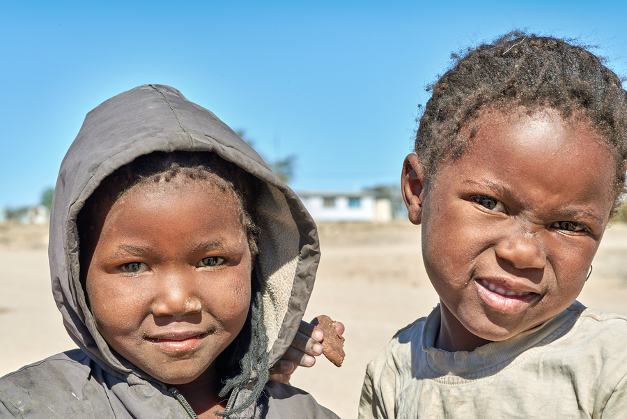 A group of children stands in their village in Damaraland Namibia showing expressions and enjoying their time together in the sun.
