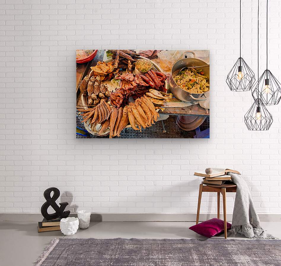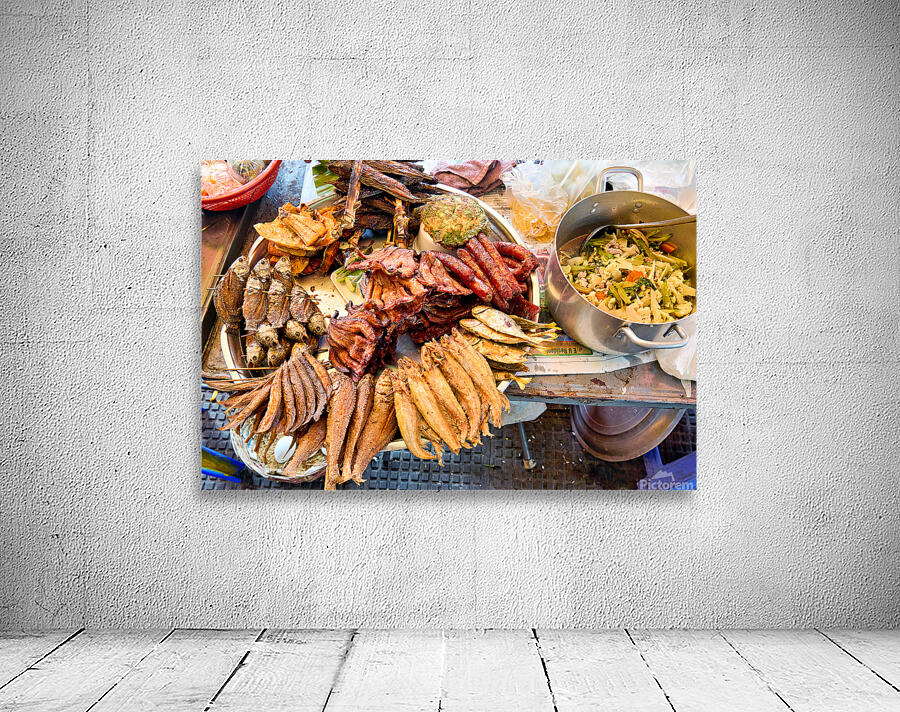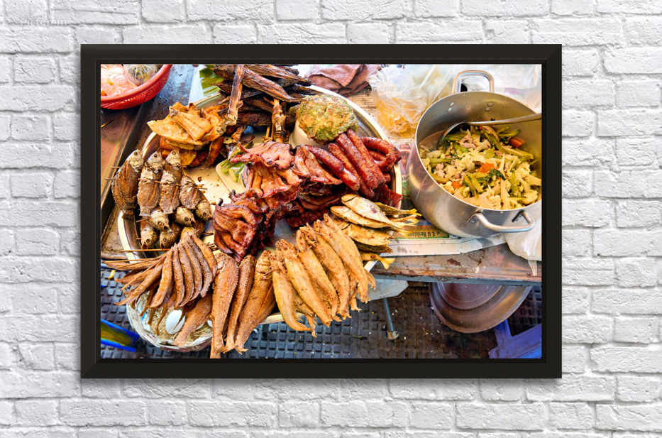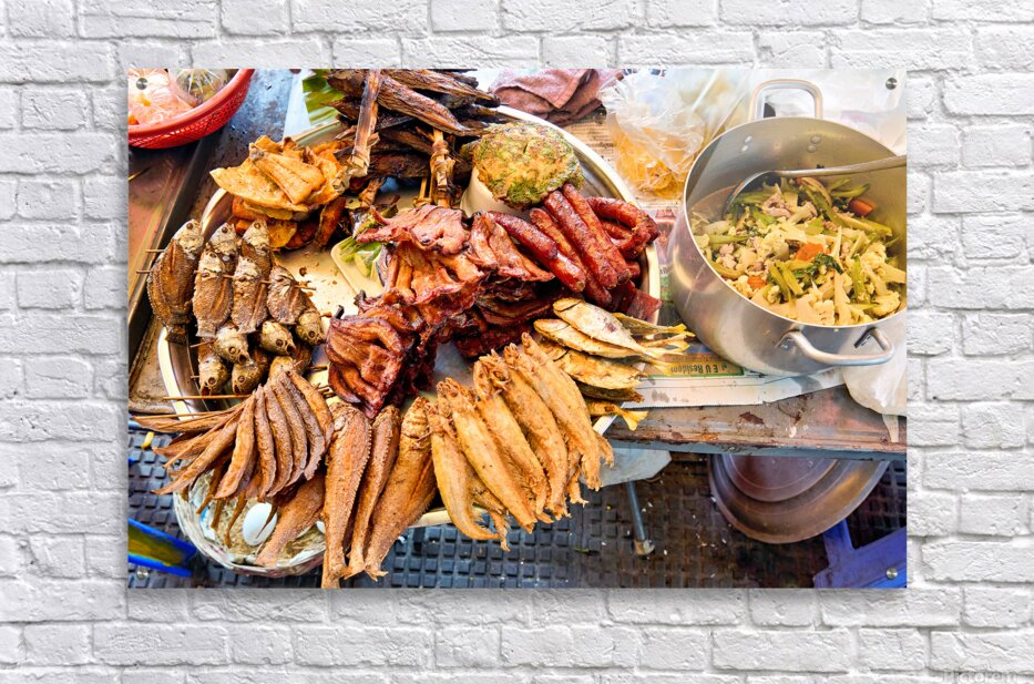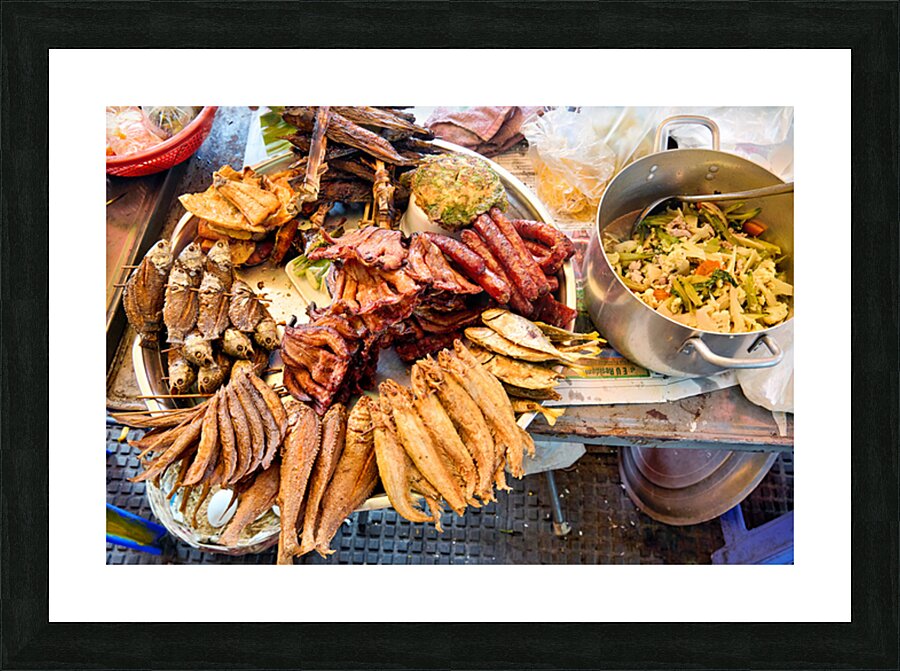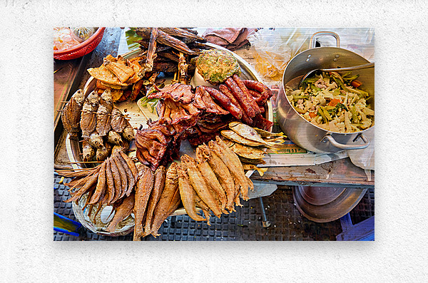 A vibrant display of Southeast Asian street food featuring fried fish sausages and a stir-fry prepared by a vendor for sale to hungry customers.