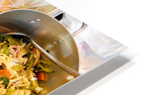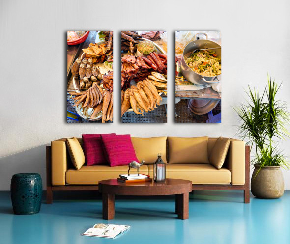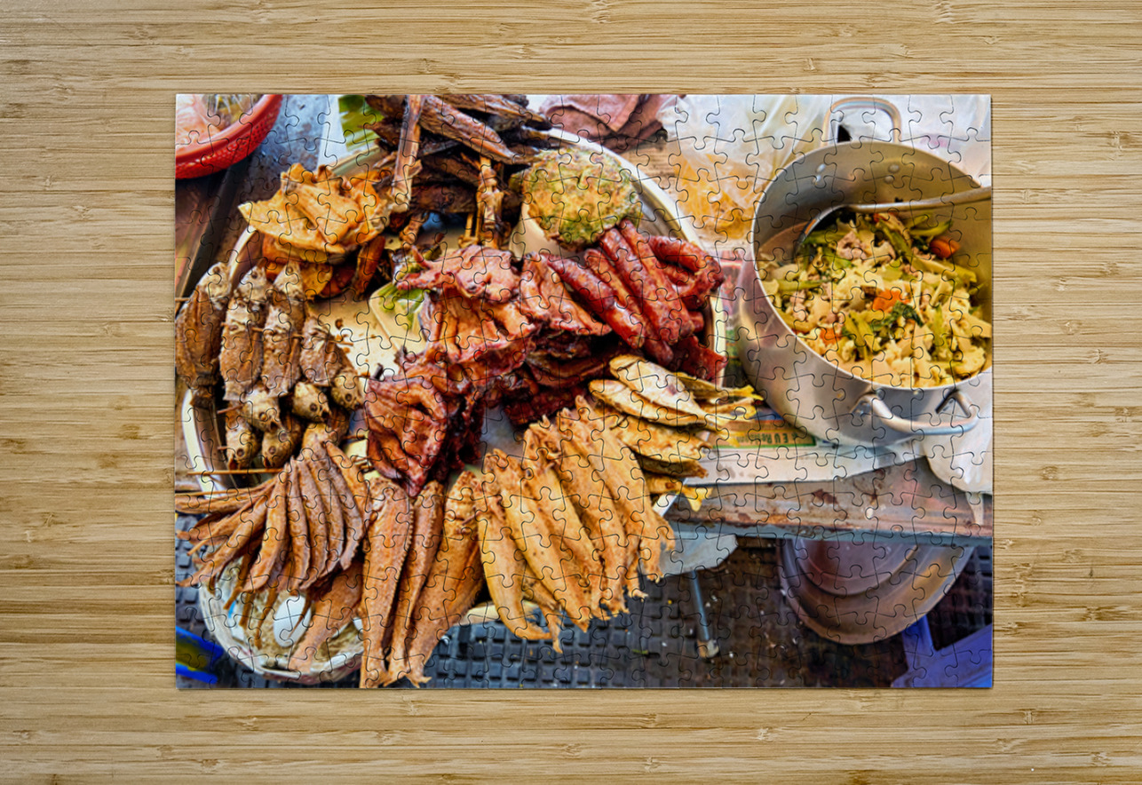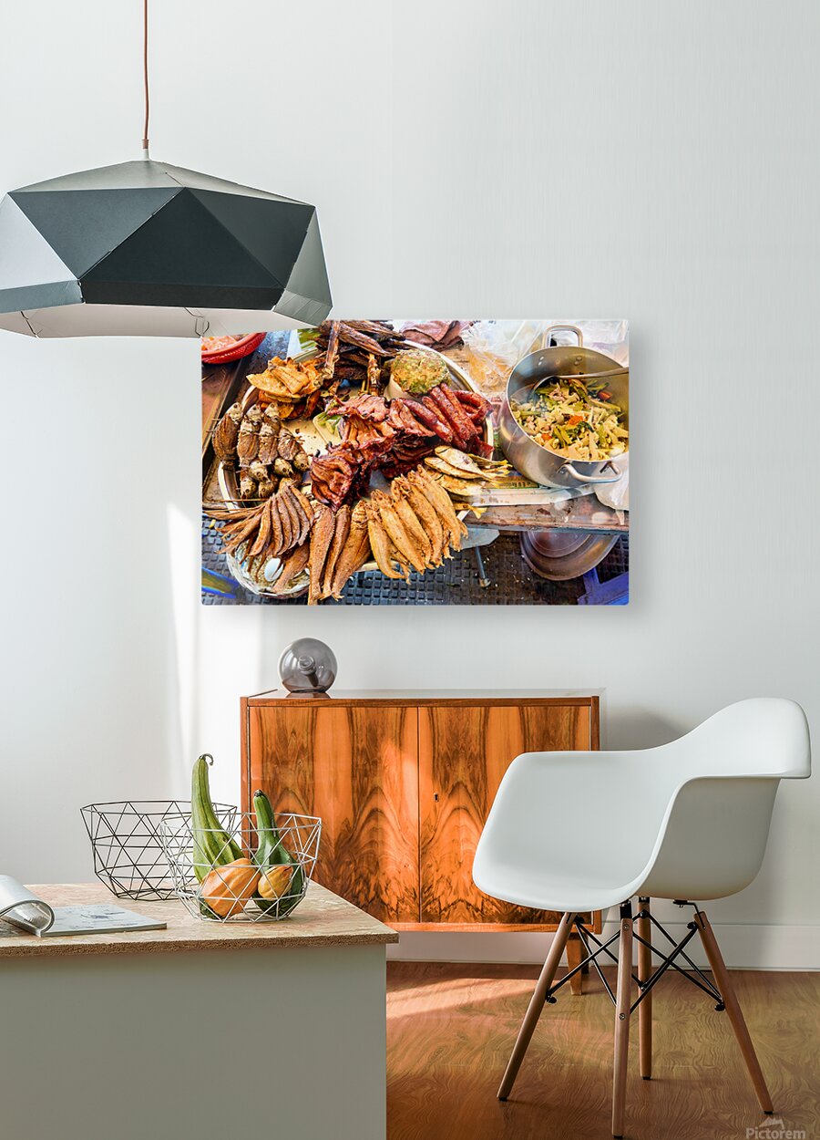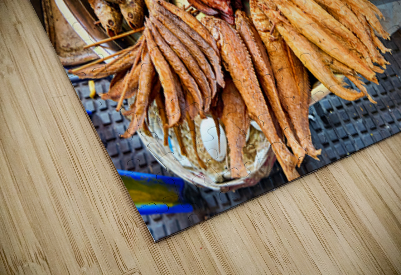 A vibrant display of Southeast Asian street food featuring fried fish sausages and a stir-fry prepared by a vendor for sale to hungry customers.