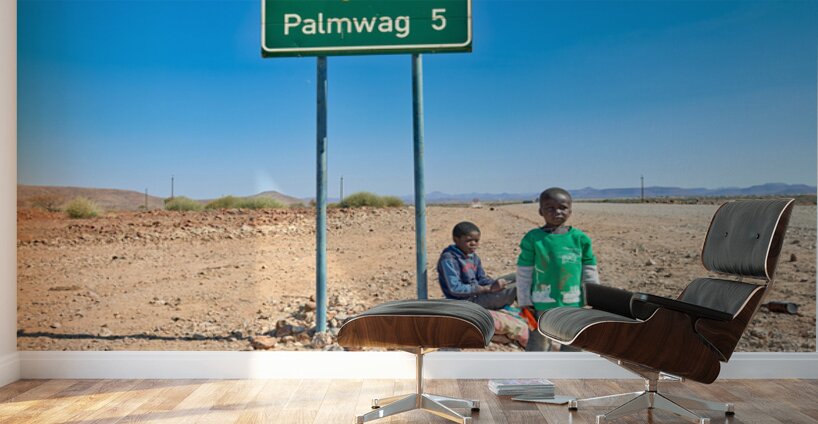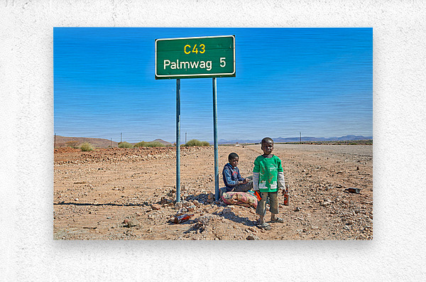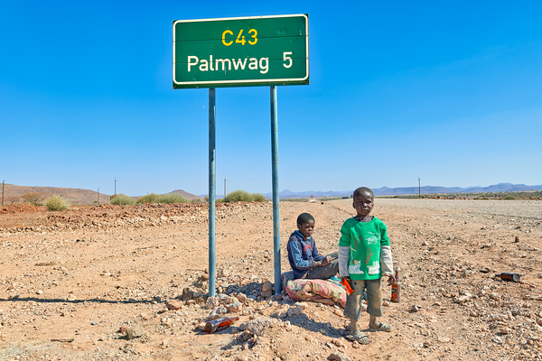 Children are sitting by the road sign in Palmwag Kunene Region. They appear to be resting and observing their surroundings.