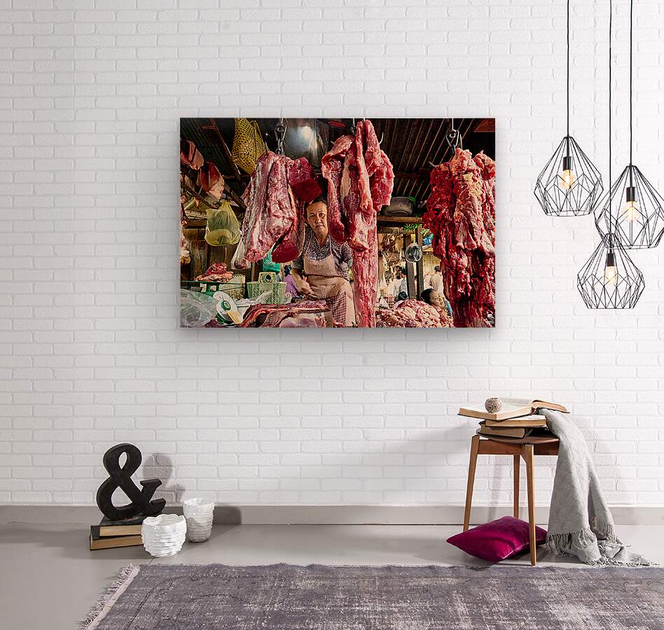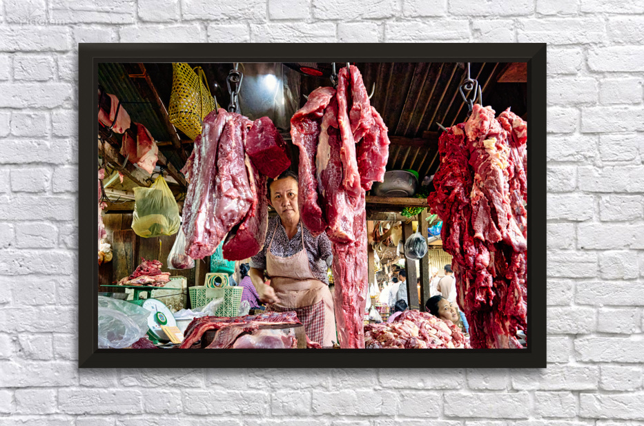 A female vendor sells fresh meat at a bustling market with large cuts hanging from hooks and displayed on tables for daily commerce.